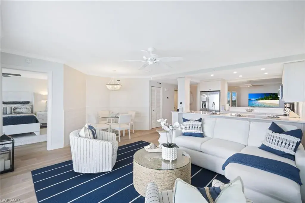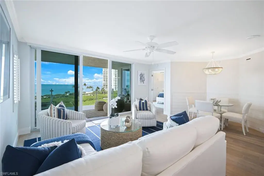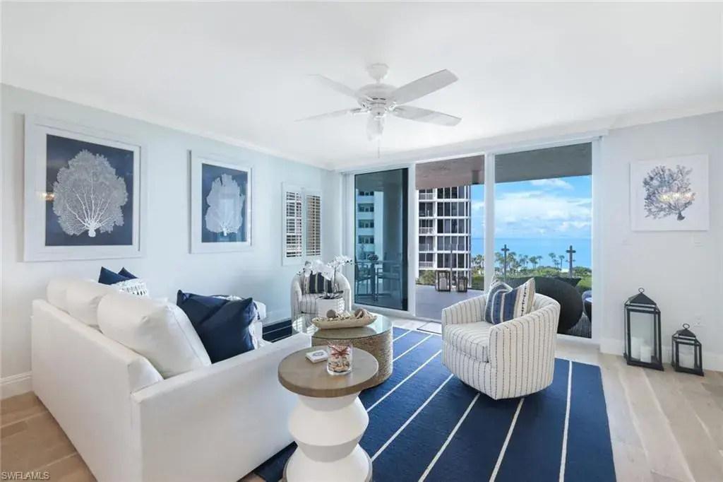 Absolutely stunning beachfront condo in the Club at Naples Cay. If you don’t know Naples Cay, you’re missing out. This is a wonderful gated, beachfront neighborhood which has direct beach access via a boardwalk through the mangroves. This gorgeous home was renovated in 2022 and provides 2 bedrooms and a den. The kitchen has new cabinets and quartz counters. The appliances are all stainless steel and the view from the kitchen sink is amazing! There are no barriers to the view as new glass railings have been installed on the balcony which lives like another room. Other features include raised ceilings in the living room and kitchen. The master is spacious with two sets of sliders to the balcony, both with electric blackout shades. There’s a new washer and dryer in the laundry “room”. The Club has a roomy exercise room, large community pool and spa, two Har-Tru tennis courts, EV chargers and is pet friendly. Naples Cay is in a great location on the beach and Waterside, Artis and Venetian Village can all be reached by foot or bike.The Club has flexible rental opportunities should you wish to take advantage of the lucrative rental market in Naples. Welcome home!