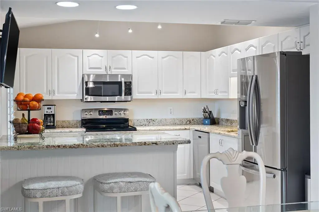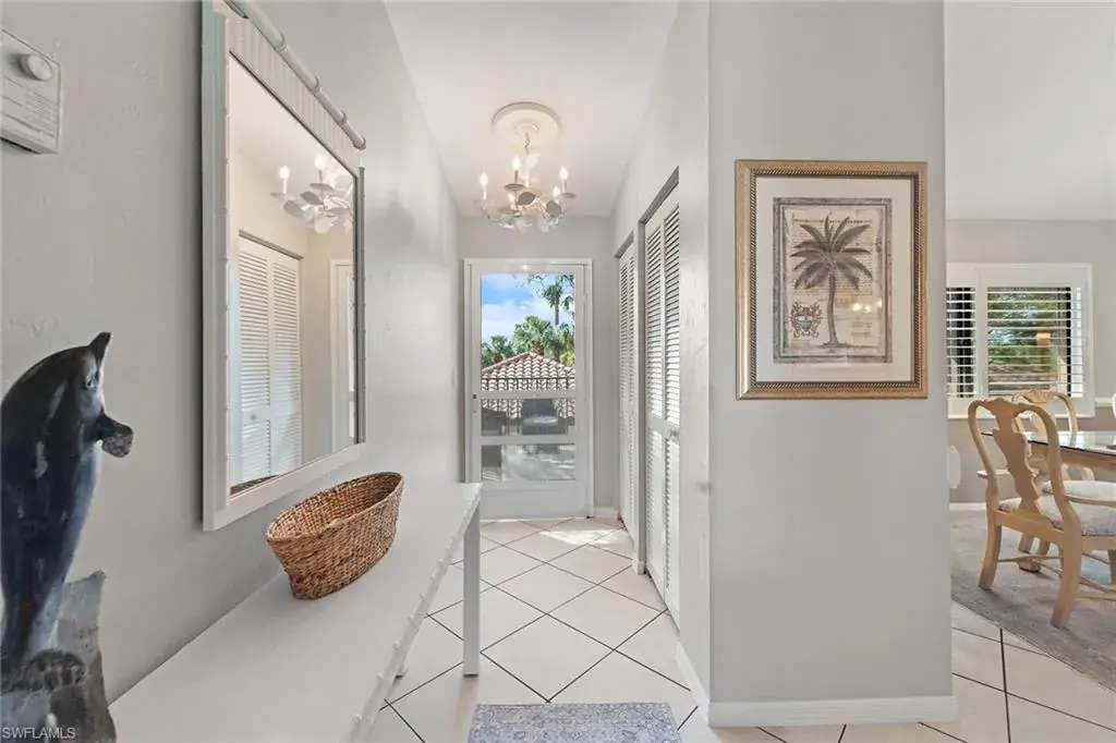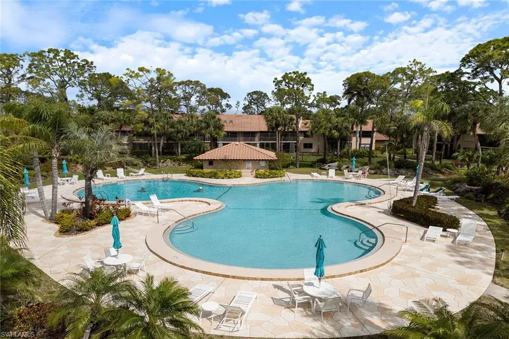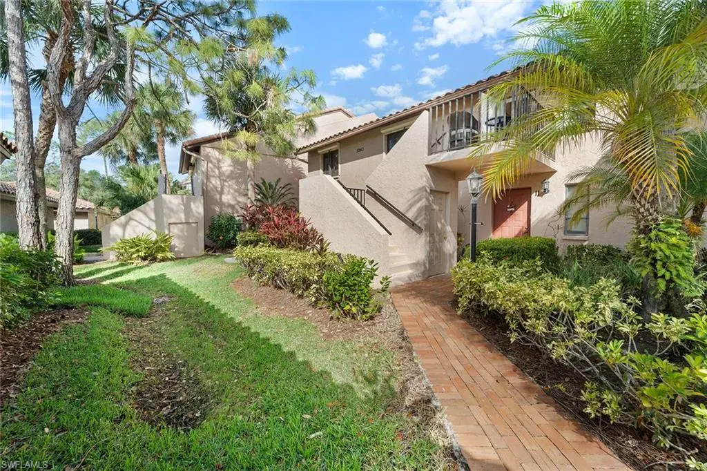 Furnished and move-in ready, this second-floor residence is in the boutique Coach House community, a quiet enclave of just 50 homes among lush tropical landscaping. The spacious interior features volume ceilings, freshly painted walls, plantation shutters, and tile flooring throughout the main living areas. The kitchen is light and functional, with white cabinetry, granite countertops, stainless steel appliances, and a convenient bar seating area adjacent to the formal dining space. Recent updates include a new air conditioning system (2025), custom California closets, interior paint, and new ceiling fans (2024), as well as a refrigerator (2023). Both bedrooms offer wood-style laminate flooring, with the primary suite featuring an updated walk-in closet and private bath. A split floor plan allows guests comfort and privacy. Enjoy morning coffee or evening downtime on the screened lanai, newly tiled and overlooking the landscaped grounds and community pool. The detached garage includes new epoxy flooring and provides secure parking and storage. Coach House offers a peaceful, non-gated setting with a resort-style pool area. Centrally in Naples, residents enjoy proximity to Gulf beaches, shopping and dining.