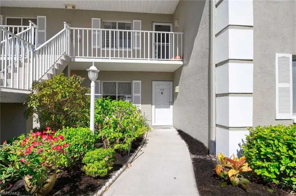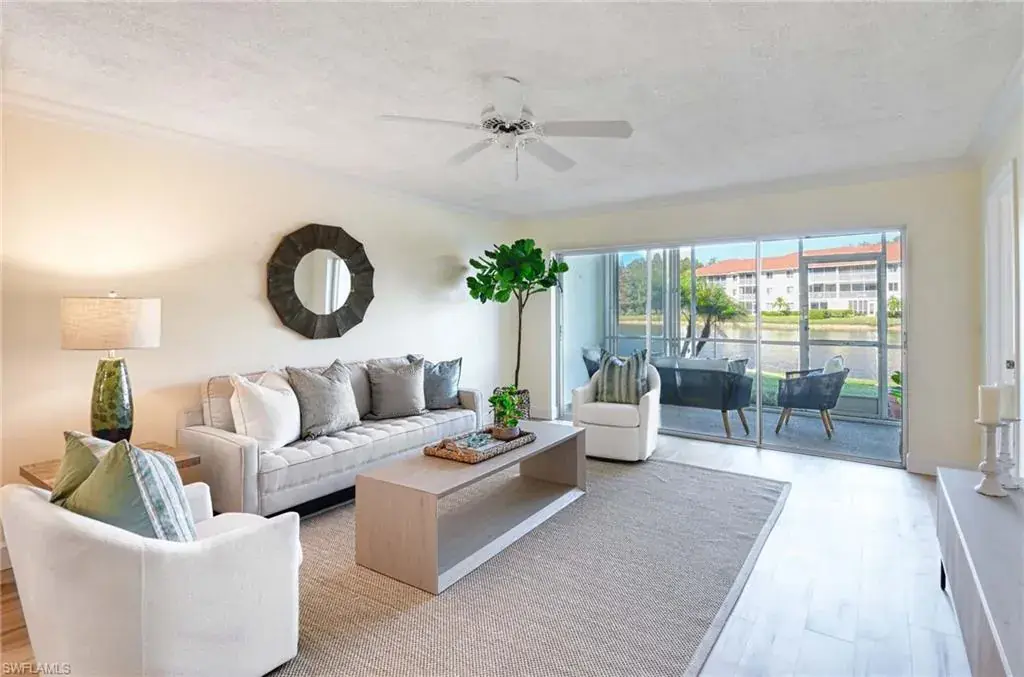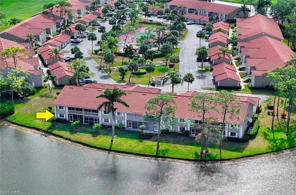 Royal Wood Golf Club-Cobblestone Court-FIRST FLOOR END UNIT overlooking sparkling lake features 2BR/2BA and DEN with lake view and golf course views from primary bedroom. Den has a door for privacy and can be used as an extra sleeping room or home office. All wood floors throughout and 5″ baseboard except for tile in bathrooms. No carpeting. Eat in kitchen with large pantry with pullout shelving. Brand new storm door. Lanai has view of lake and acrylic sliders making it an all season room to enjoy. Large laundry room. AC 2021. Hot water heater 2024. Detached one car garage with room for clubs and bikes too. Steps to pool, spa and tennis. Golf Club has just completed a huge reonovation with new dining room, bar and grill room. New pro shop and fitness center with Peloton equpment and adjoining yoga room. Club offers well-maintained golf course, year round activities including holiday parties, tivia, bingo, golf scrambles and more. Short ride to shopping, libraries, botanical garden and the beautiful Naples beaches.