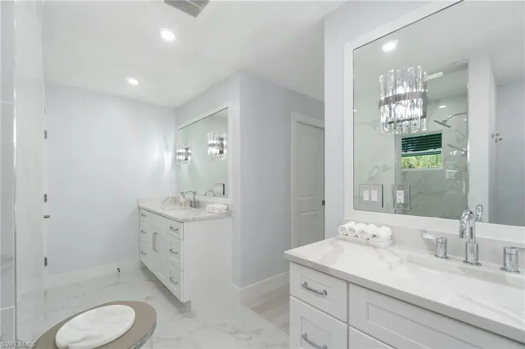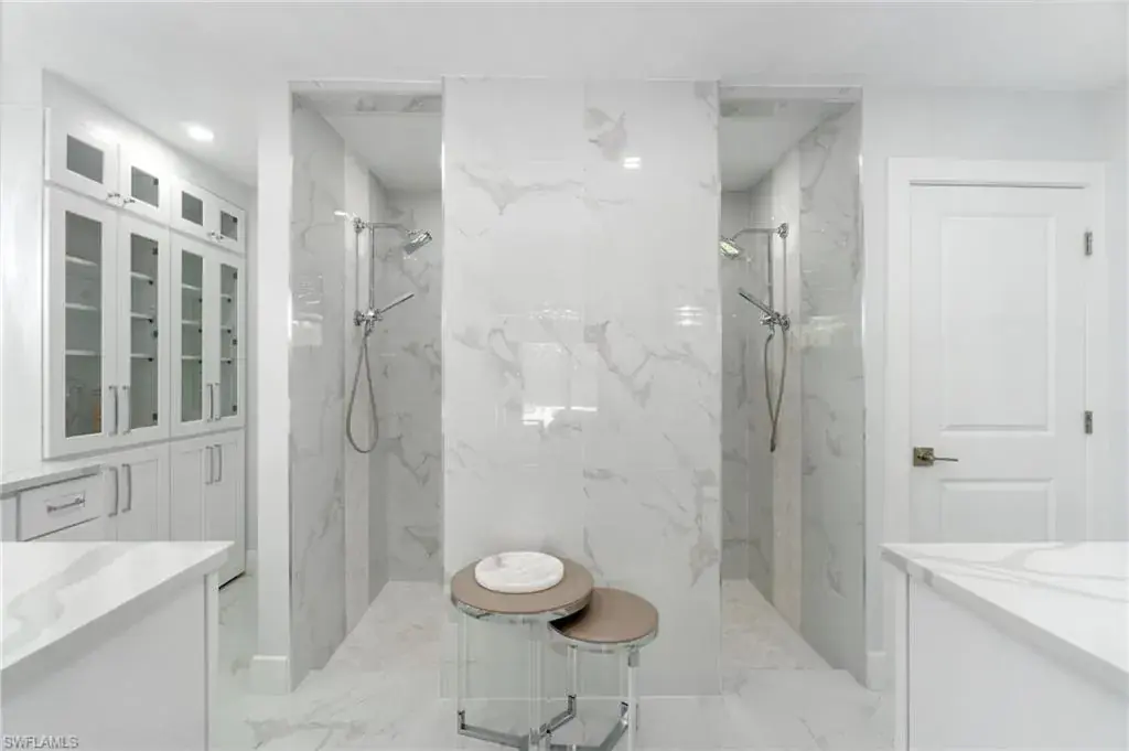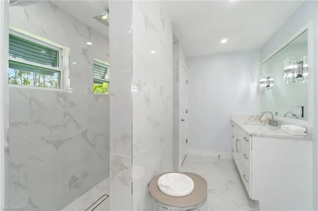 Outdoors, a modern spa-inspired patio meets a sprawling pool and jacuzzi, all set against an oversized imported Italian tile deck. Perfect for entertaining, the front patio and vast acreage offer endless possibilities for gatherings under the Florida sun.