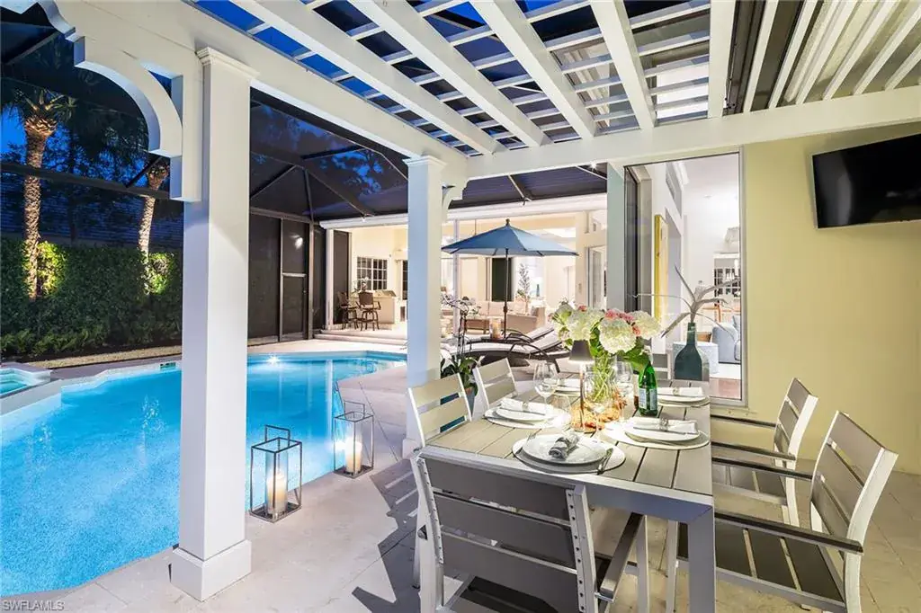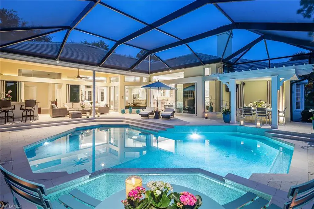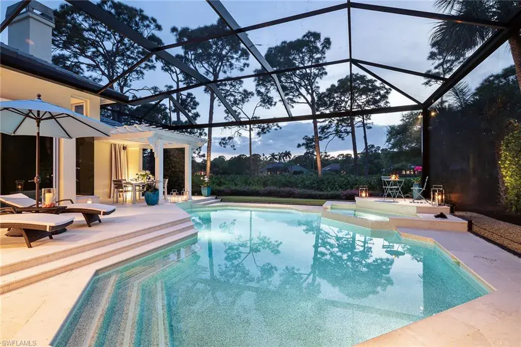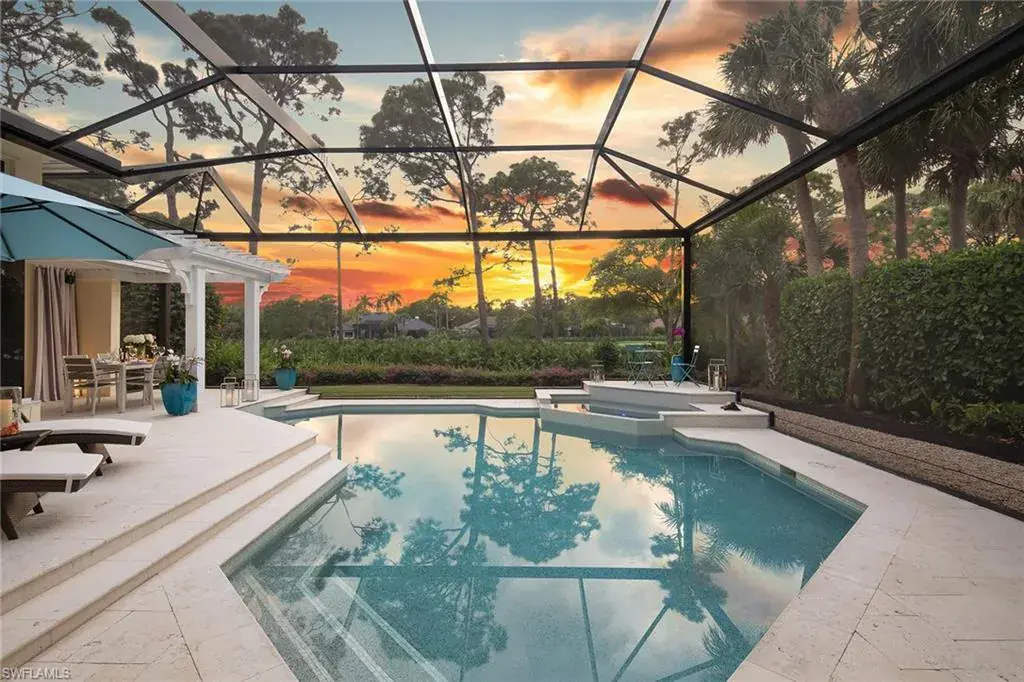 Sophisticated and sparking renovation with sunny southwestern exposure of the picturesque 8th hole is the backdrop for this gorgeous home with fabulous finish details and pristine condition. Wide open floor plan with beautiful wood floors, stunning renovated bathrooms, beautiful white kitchen with quartz counters, center island, stylish lighting and cozy breakfast nook with built-in bench opens to the spacious gathering room with signature stone fireplace, custom woodwork and large pocket impact sliding door to lanai. Superb architectural details throughout, stylish furnishings and sleek new wet bar with quartz counters, back lighting and wine refrigerator. Spectacular renovated owner’s bath with sleek walk-in shower, quartz vanities with mirrors with built in lighting, oversize make up vanity, freestanding soaking tub with floor mount faucet, two walk-in closets and shiplap detail. Huge ensuite bedroom/flex room offering bayed windows and window seat with big golf course views. The new roof (2022) and new picture window screened enclosure (2018), full hurricane protection, immaculate oversize true 3 car garage, state-of-the-art electronics, renovated landscaping with extensive lighting package and Zoysia grass make this home move-in ready. The playful outdoor space with new stone deck and refinished pool and spa comes complete with large, covered area, summer kitchen & bar, built in gas grill and charming pergola dining area to enjoy the gorgeous nightly sunsets. Immediate golf membership available. Collier’s Reserve is an intimate community with only 224 homes less than 2 miles from Vanderbilt Beach. Collier’s Reserve natural beauty nestled on 450 acres was recognized as the world’s first-ever Audubon Signature Sanctuary community.