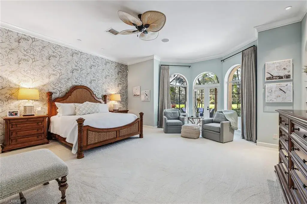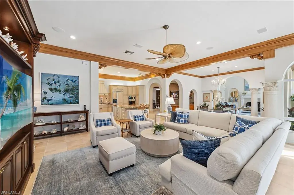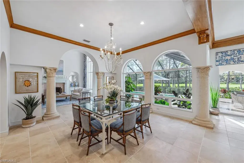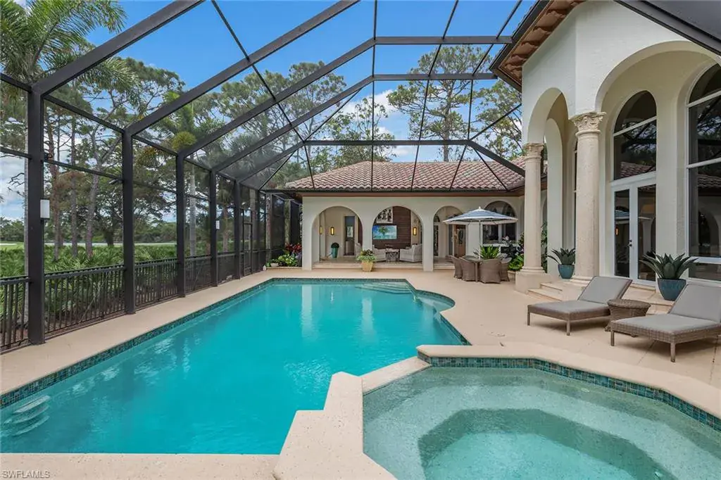 Masterfully designed updated & elegant estate home on a beautifully manicured street in Colliers Reserve! This spacious and light custom-appointed home welcomes you through oversize solid mahogany wood double entry doors into an awe inspiring grand entrance foyer with 22′ soaring ceilings, diagonally set marble floor, and magnificent sweeping curved staircase with marble treads and wrought iron railings with solid brass banister. Light and airy interiors feature designer lighting and window treatments, oversize rich crown moldings and millwork, and a chef’s dream custom kitchen featuring a Thermador 5 burner gas cook top, wood paneled vent hood with polished and tumbled marble border detail, upper & under cabinet lighting, Thermador thermal wall oven, and exquisite granite countertops with seating at center island. Custom 8ft solid wood doors through out. The primary suite bath feels like an oasis with dual marble vanities and separate frameless walk in shower and Mirabelle Therapy bubbler spa tub. There is ample space for entertaining family and friends with a separate bar area and designer stylish wood accented outdoor covered living space. Luton lighting system throughout with programmable features via a Savant home automation system. A separate office/den features custom raised panel natural finish entry doors complimenting wood paneling and crown moldings with wide plank royal mahogany wood floors. Enjoy the peace & serenity outdoors around an oversized 35×16 sparking lap pool and raised spa with greenery views of preserve & the golf course. Colliers Reserve enjoys designation as an Audubon Signature Sanctuary community spread out on over 450 acres of lush landscaping and natural beauty unmatched in Southwest Florida.