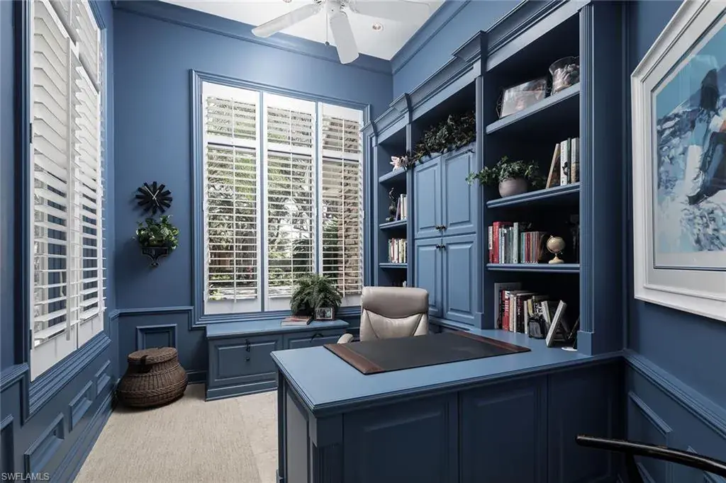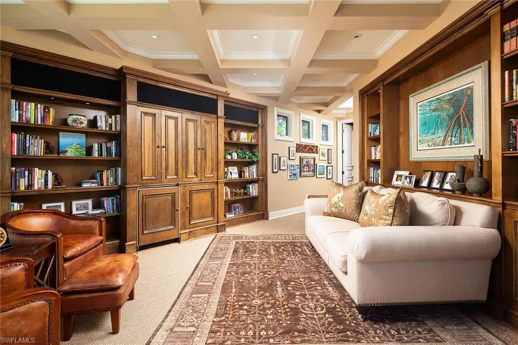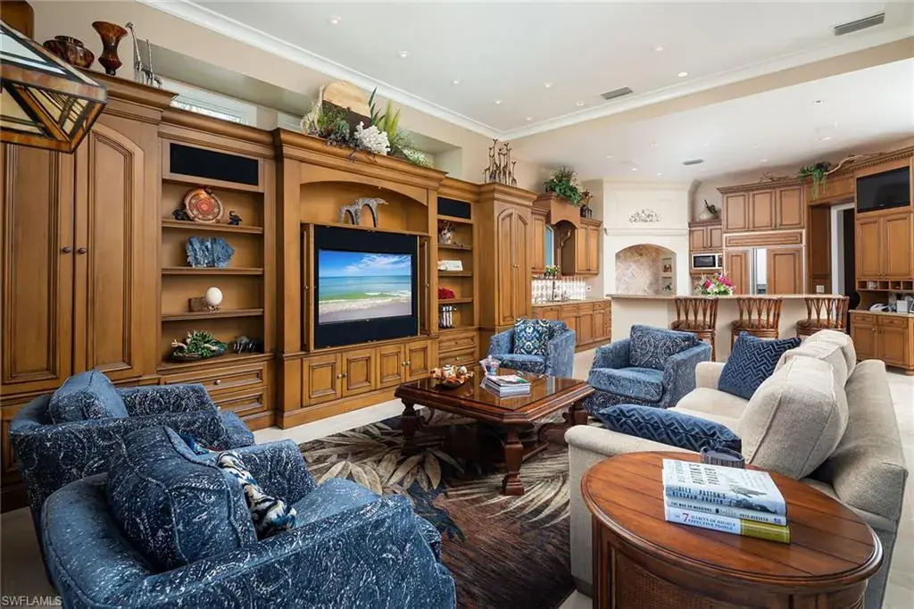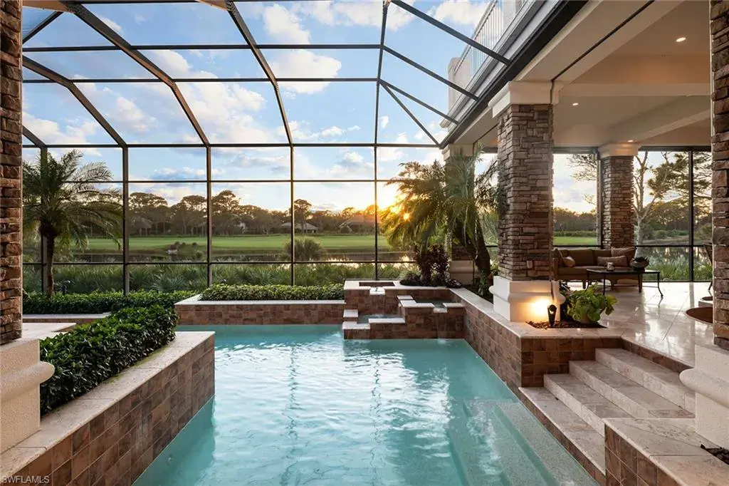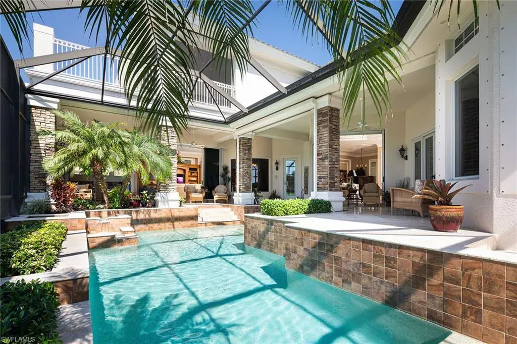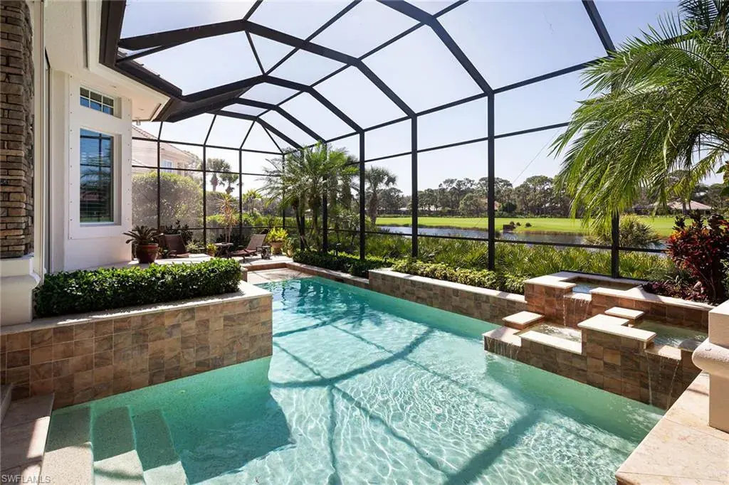 This masterpiece of architecture and design offers breathtaking lake and golf course views of the signature 8th hole, paired with a sunny southwest exposure, setting the scene for this splendid London Bay-built and Romanza award-winning designed residence. Immediate full golf membership available. New roof just installed in summer of 2025. The timeless architectural features are showcased through squared windows, stone accents on the facade and lanai, and light travertine floors indoors and out. The exquisite woodwork and built-ins complement the design, while the 10-foot zero-edge disappearing sliding doors and a stone fireplace amplify the luxurious ambiance. The exterior of the home is equally captivating, featuring two stone waterfalls, a magnificent pool with a sun shelf, and three cascading waterfalls, as well as a large covered outdoor space equipped with a fantastic summer kitchen. The gourmet kitchen inside boasts a large center island with two Sub-Zero drawers, a Viking six-burner gas range with a stone hood, and a butler’s pantry complete with a wine cooler. The main suite is expansive, offering a large dressing room, a sitting area, a morning kitchen, and a travertine bath with a walk-in shower. Adding to the charm, the home includes a vast private upstairs second study/bonus room or fourth bedroom with access to a large sunset balcony. The house feels new, maintained meticulously and with utmost care. It comes with hurricane protection, including disappearing electric shutters on the lanai, state-of-the-art electronics and security systems, power sunscreens, and two large, air-conditioned storage closets. This magnificent home, with its spectacular views and luxurious amenities, epitomizes elegance and exquisite design. Collier’s Reserve’s natural beauty of 450 acres was recognized as the world’s first Audubon Signature Sanctuary community and offers world-class club amenities, championship golf, active tennis, pickleball, and bocce, newer fitness center, excellent food with friendly staff, and overall superb location in Naples, less than 2 miles to Vanderbilt Beach.