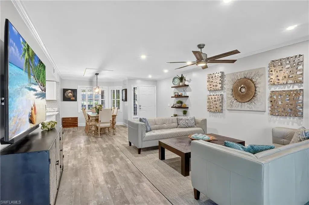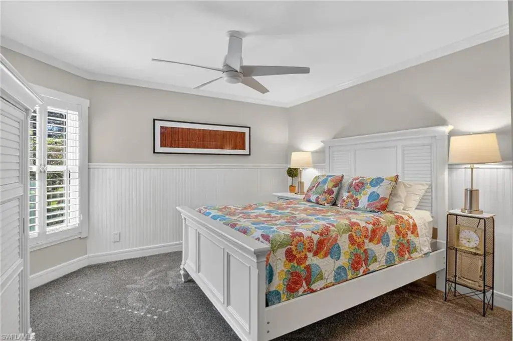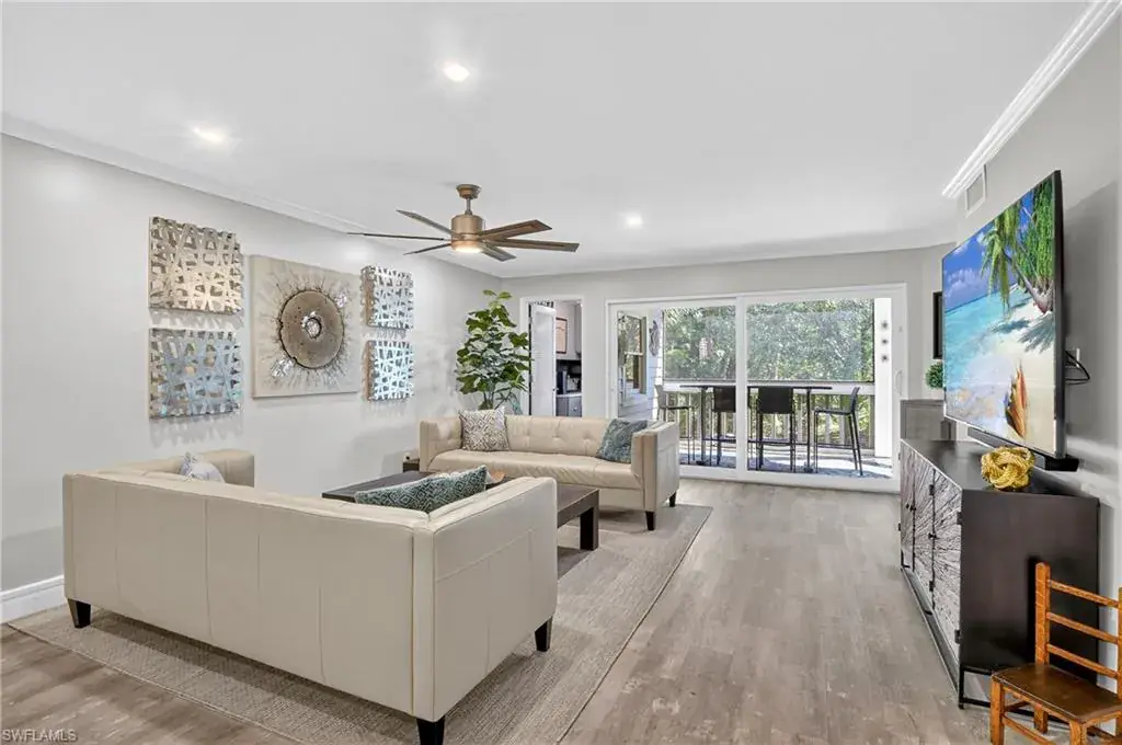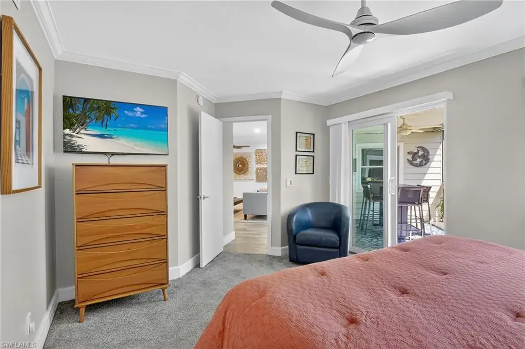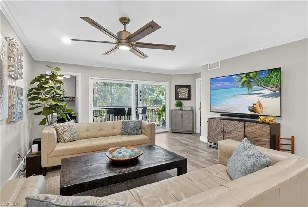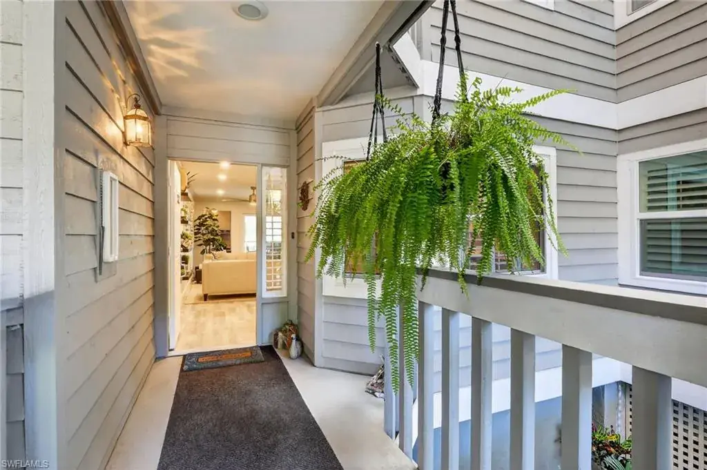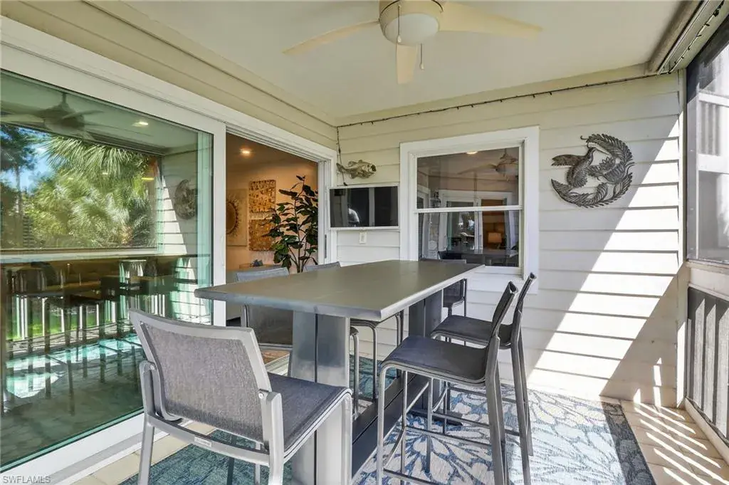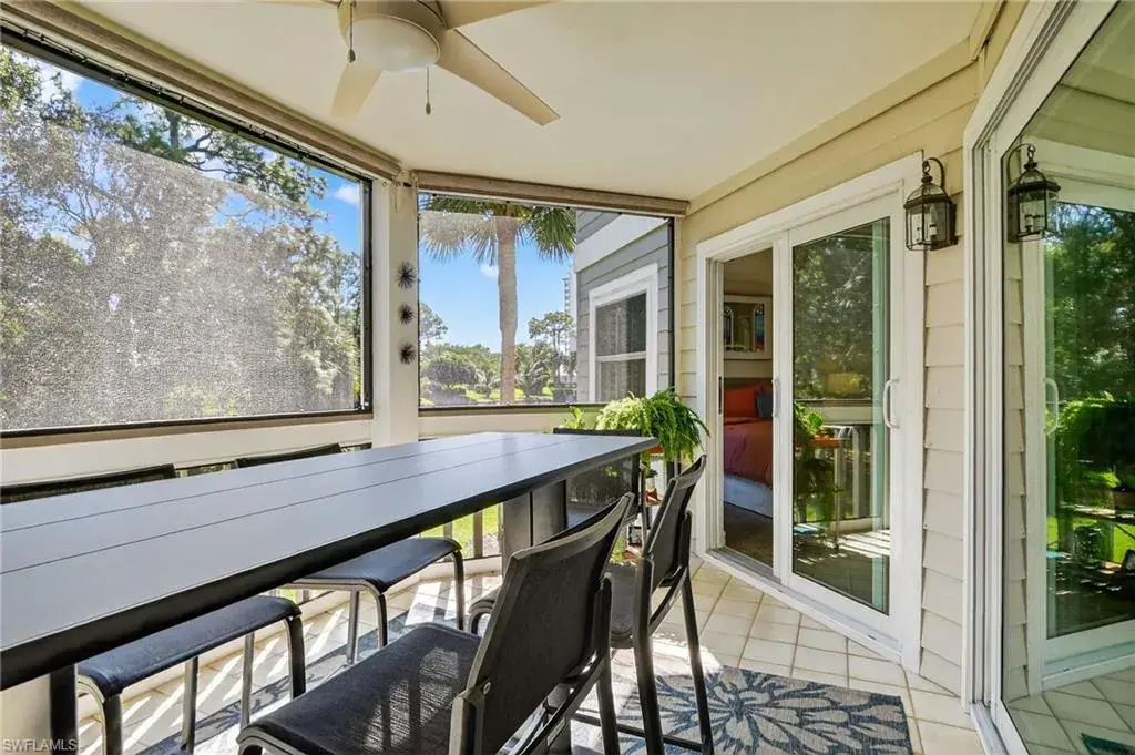 In pristine condition, this first-floor Condo, consisting of 2 bedrooms, a small office area and 2 full baths, both featuring walk-in showers, has been meticulously maintained and remodeled with all-new hurricane impact windows/sliders done in 2022. The coastal feel, open floor plan, water views and loads of privacy out back enhances this cottage-style Condo. New flooring in the main living area is a wood-grain luxury vinyl, and carpet in both bedrooms. Crown molding, decorative lighting & fans, A/C system, stackable washer/dryer, granite countertops, and a farmhouse sink in the kitchen, to name a few additional improvements. The Colony at Wiggins Bay features three buildings, its own pool only steps away from this unit. The Wiggins Bay community is gated with 24-hour security. The Tarpon Cove Yacht & Racquet Club is situated within the gates and offers membership opportunities, providing additional amenities. Please inquire about costs or book a Tour. Tennis, dining, tiki bar, bocce, fitness, boat shuttle to beach, and Club pool with towel service. Additionally, the Wiggins Bay Dock Owners Association is a separate entity that offers slips for lease or purchase; details are available.
