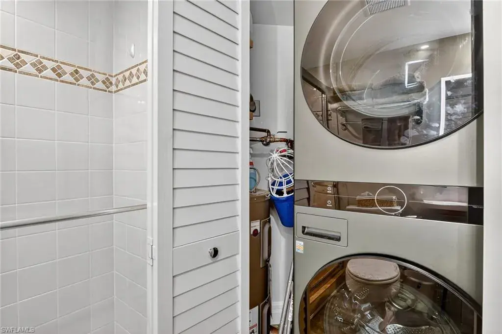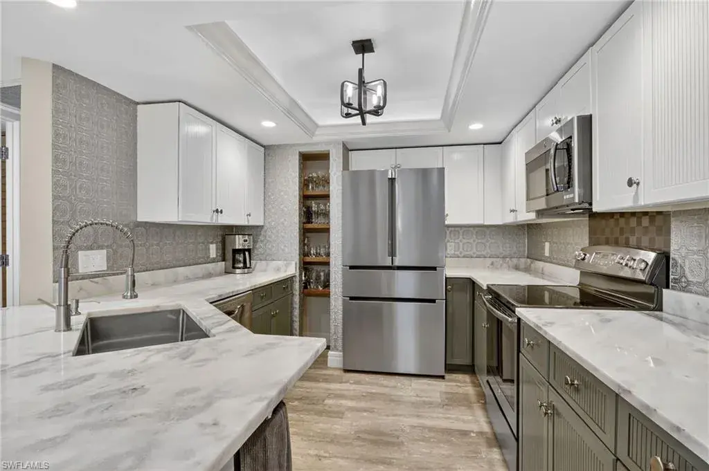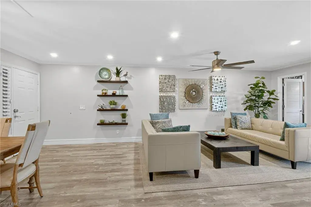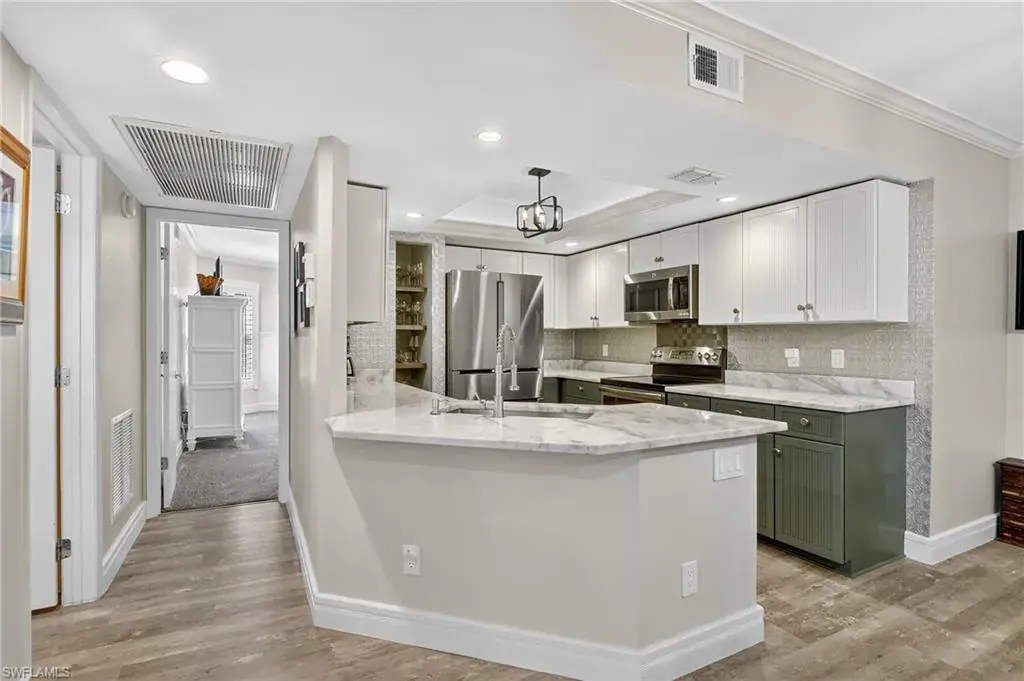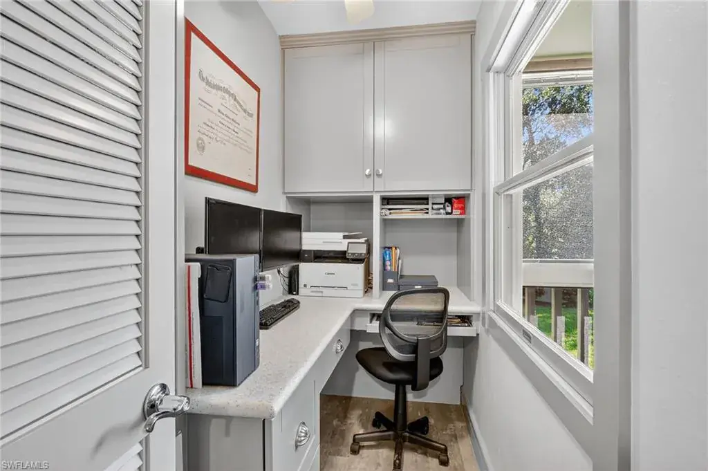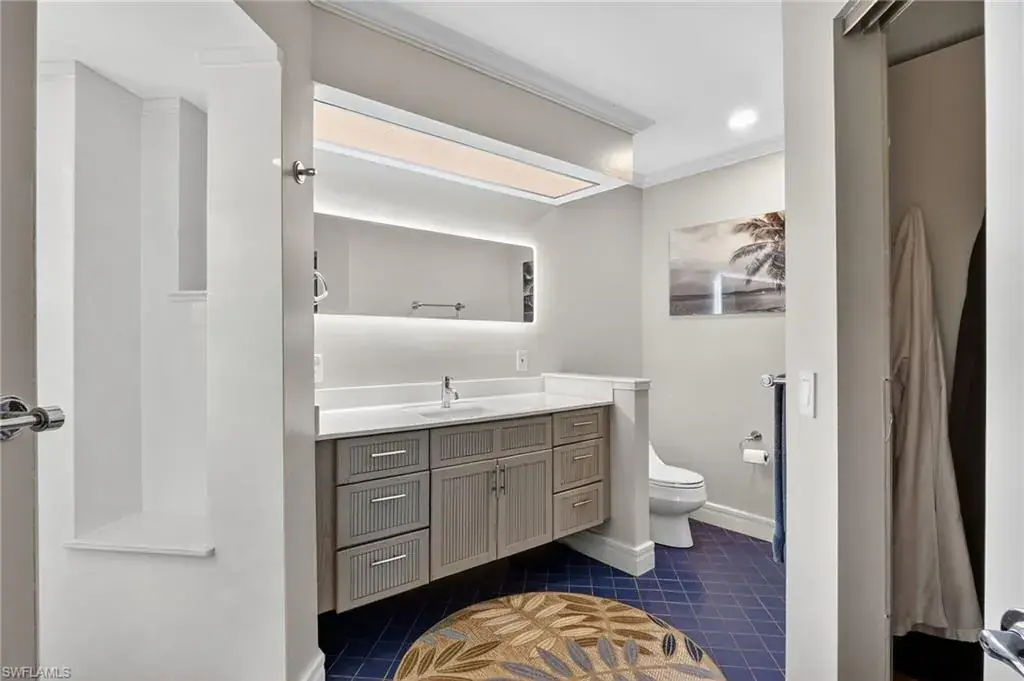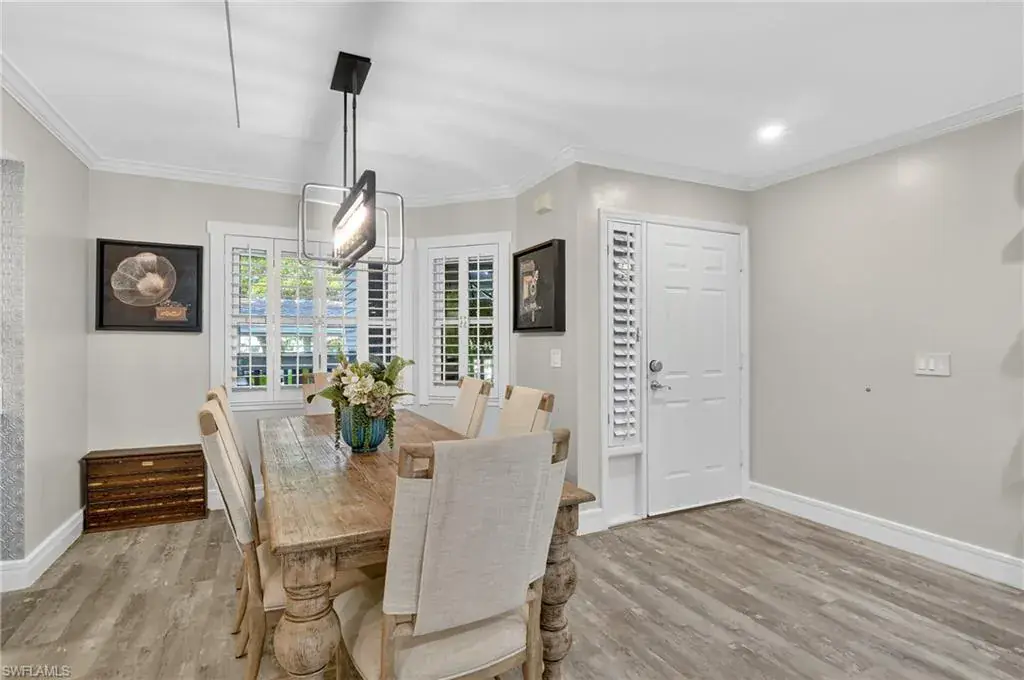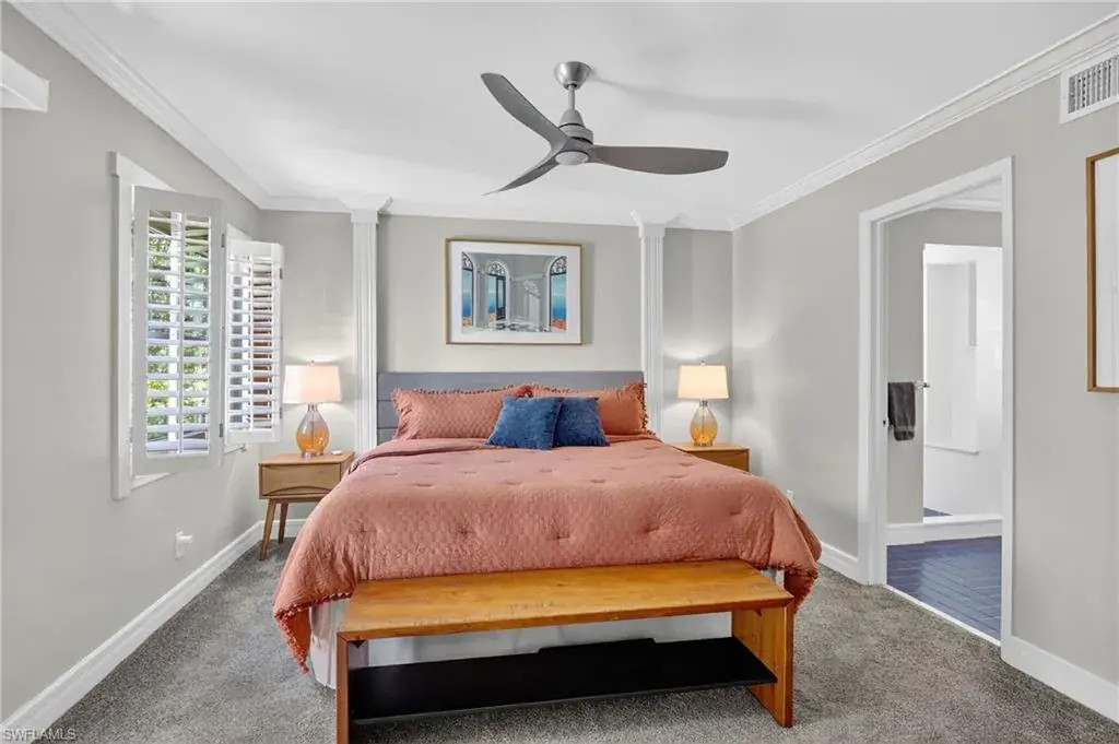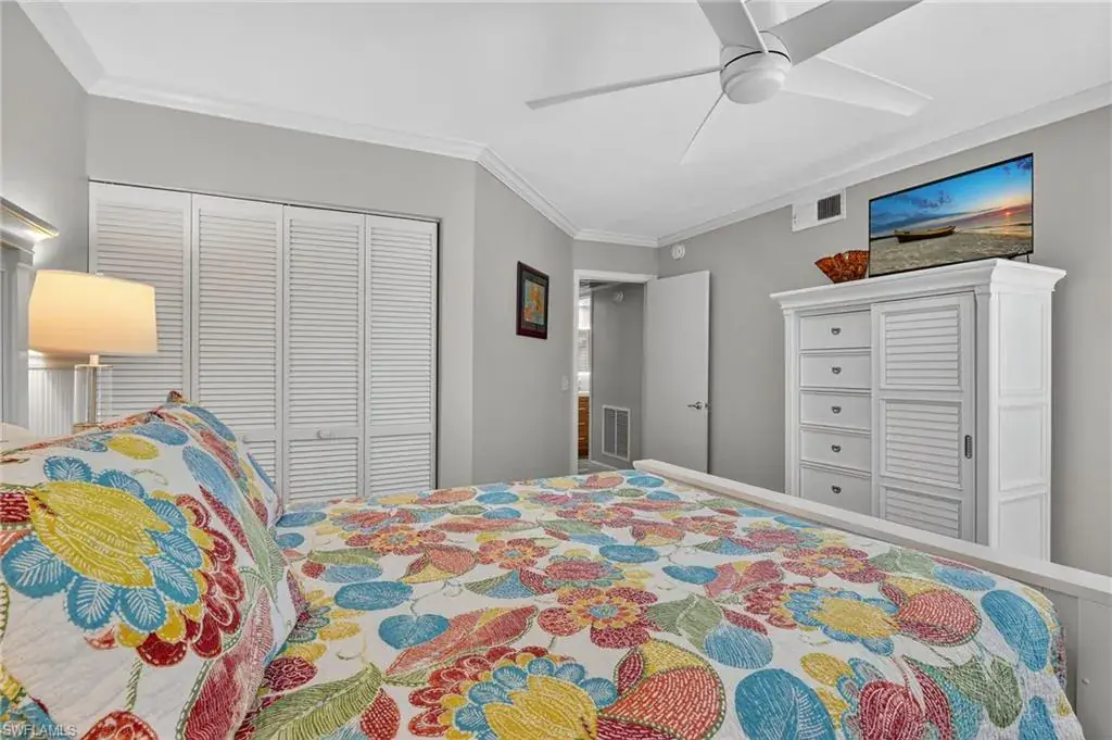 In pristine condition, this first-floor Condo, consisting of 2 bedrooms, a small office area and 2 full baths, both featuring walk-in showers, has been meticulously maintained and remodeled with all-new hurricane impact windows/sliders done in 2022. The coastal feel, open floor plan, water views and loads of privacy out back enhances this cottage-style Condo. New flooring in the main living area is a wood-grain luxury vinyl, and carpet in both bedrooms. Crown molding, decorative lighting & fans, A/C system, stackable washer/dryer, granite countertops, and a farmhouse sink in the kitchen, to name a few additional improvements. The Colony at Wiggins Bay features three buildings, its own pool only steps away from this unit. The Wiggins Bay community is gated with 24-hour security. The Tarpon Cove Yacht & Racquet Club is situated within the gates and offers membership opportunities, providing additional amenities. Please inquire about costs or book a Tour. Tennis, dining, tiki bar, bocce, fitness, boat shuttle to beach, and Club pool with towel service. Additionally, the Wiggins Bay Dock Owners Association is a separate entity that offers slips for lease or purchase; details are available.