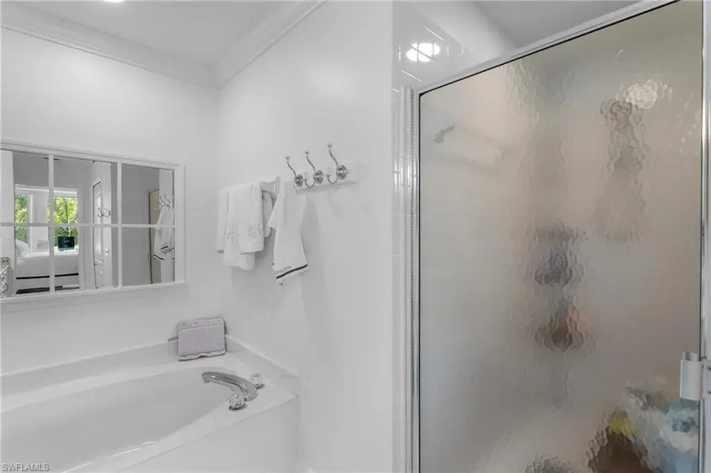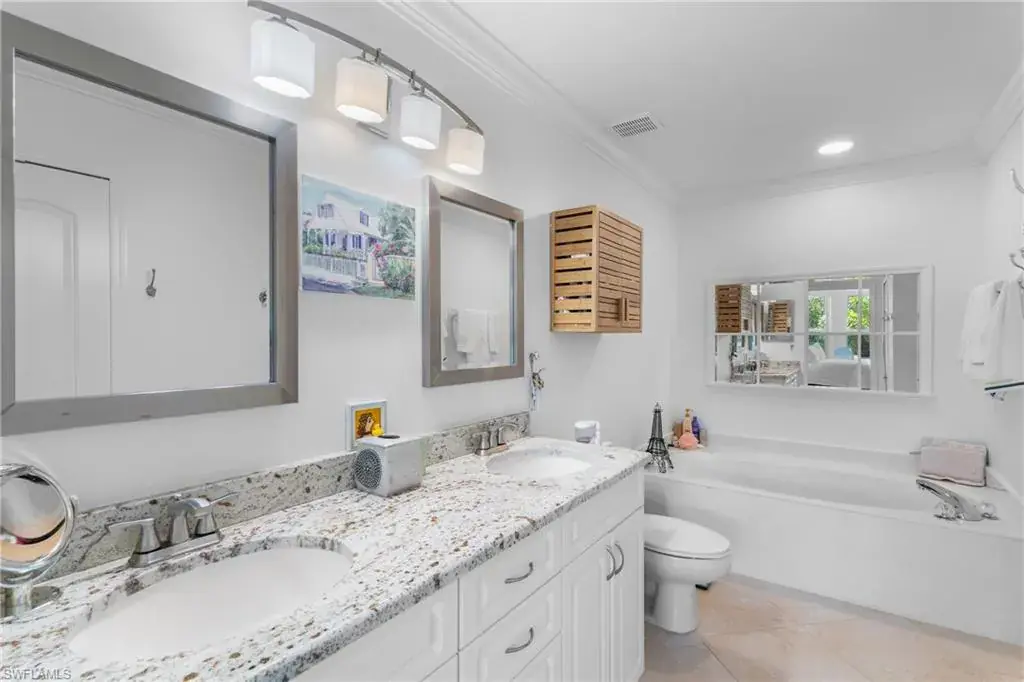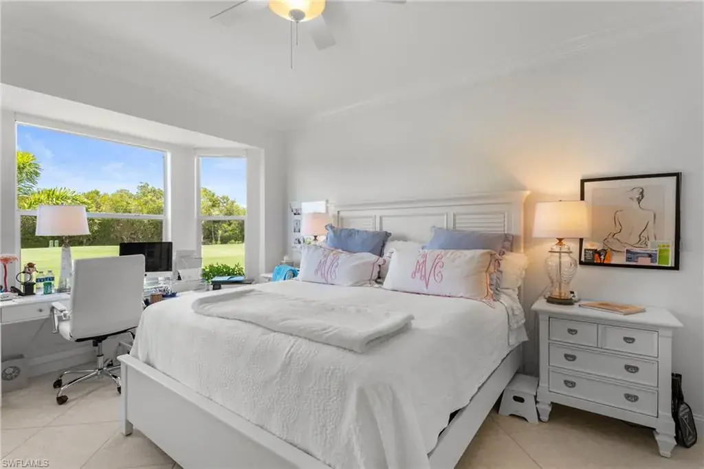 The Primary bedroom has windows which make it very open, airy and bright with crown molding, large tile floors, and a door which opens out to the lanai. The Primary bath has a walk-in shower, a large soaking tub, new closet designed by Closet by Design with double sinks, and granite countertops. The second bedroom is very quiet and has a large TV and full bath. You will have a covered parking area and storage unit for your beach and bike toys. You are in a gated community with two heated pools with barbecue grills for your outdoor entertaining.