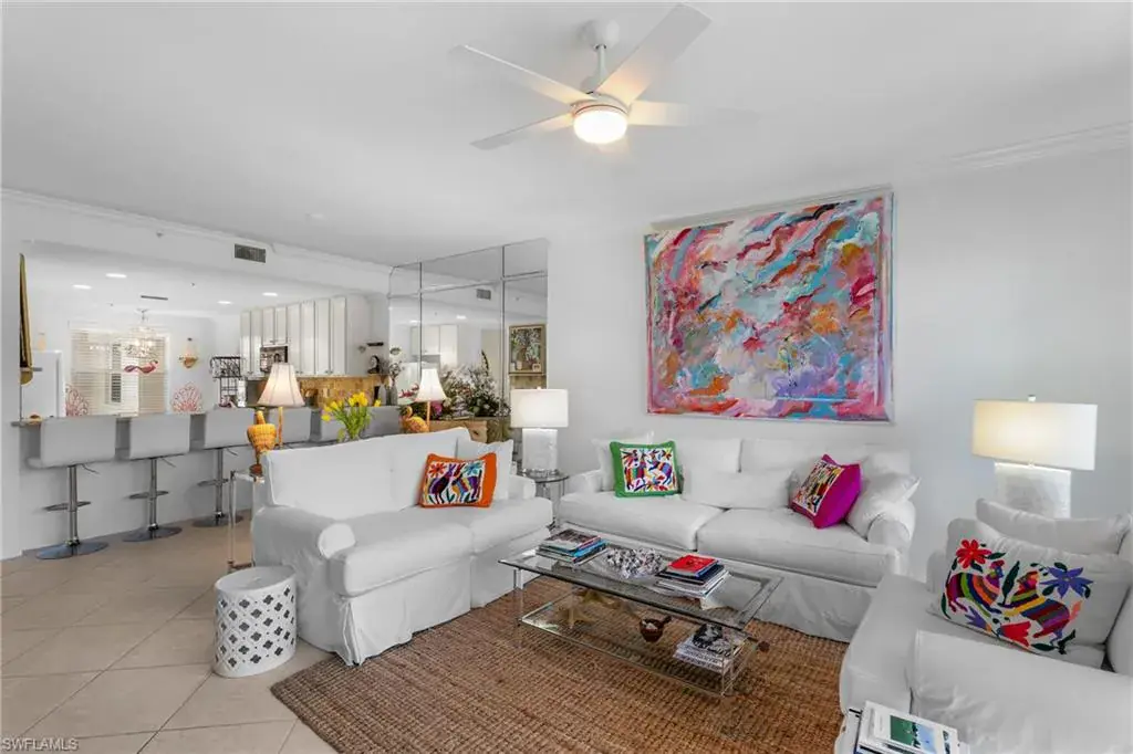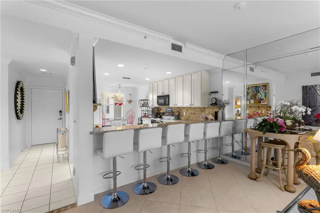 As you enter into this condo, it has an open concept and open kitchen with a counter that seats 6 comfortably for ease of entertaining and a breakfast area in the kitchen for a table and chairs. The dining and living area feature sliding glass doors that open onto the lanai, creating a seamless flow between indoor and outdoor space. This design is ideal for both relaxing and entertaining, offering a versatile living experience.