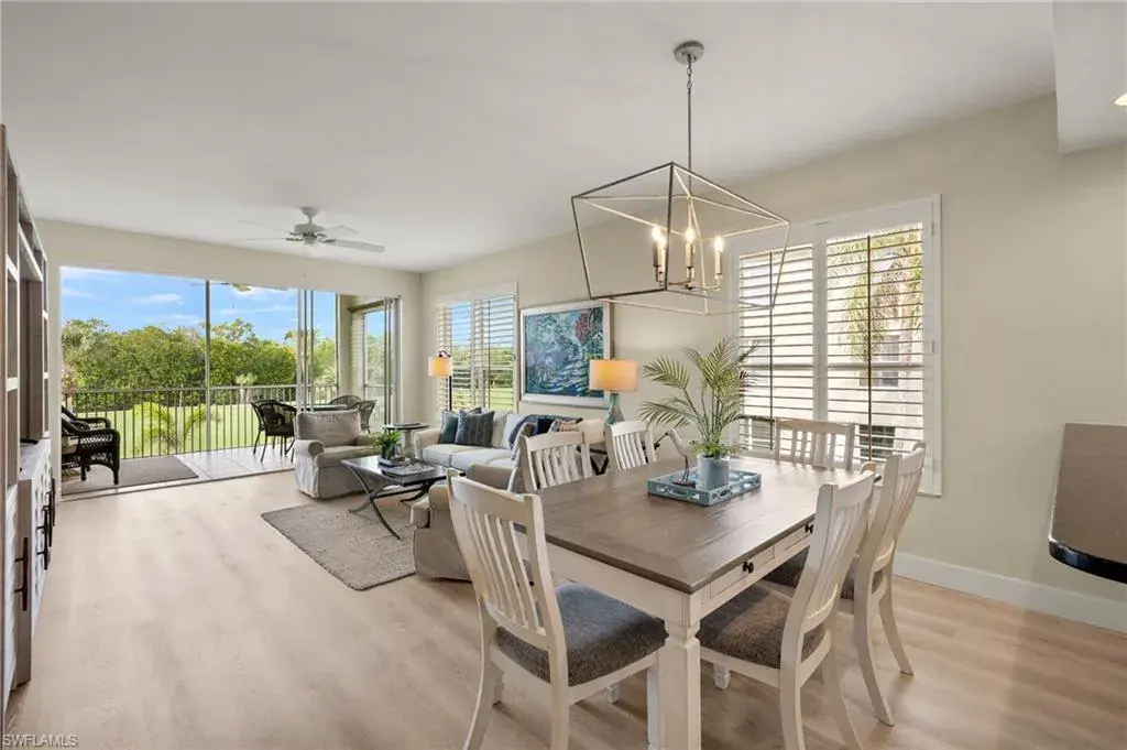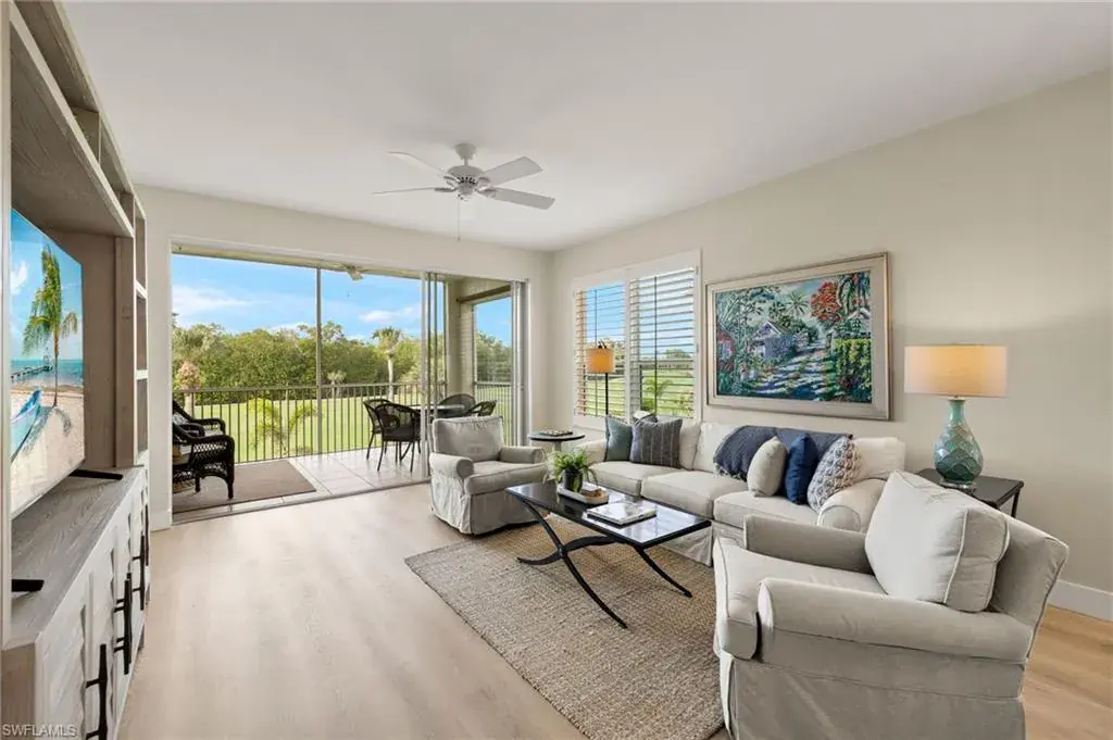 Experience breathtaking views of the golf course from this 2nd-floor, 3 Bedroom, 2 Bath condominium in Compass Point at Windstar on Naples Bay! This light and airy unit has been updated offering stunning western vistas of the 17th fairway, perfect for watching sunsets from your screened-in lanai with its western exposure. Open-concept living area with spacious eat-in kitchen, living/dining room with stunning views plus a convenient laundry room. Master suite complete with large bedroom overlooking the golf course plus a en-suite bath with double vanity, walk-in shower, soaking tub and walk-in closet. Lovely guest suite with tastefully updated bath plus a 3rd bedroom with custom ship lap accent wall is currently set up as a home office.