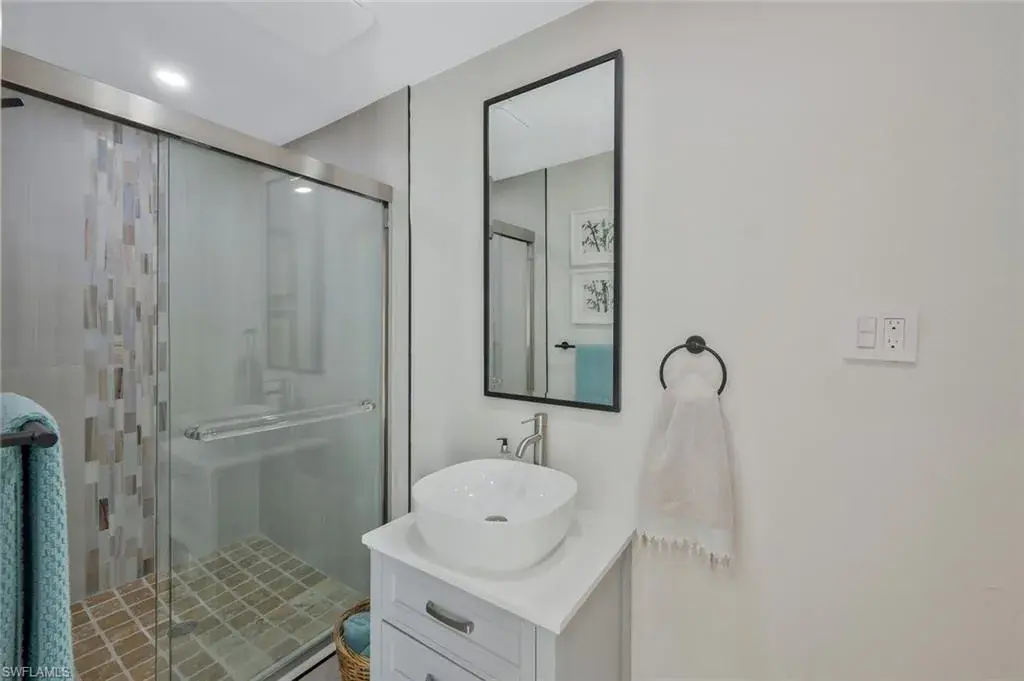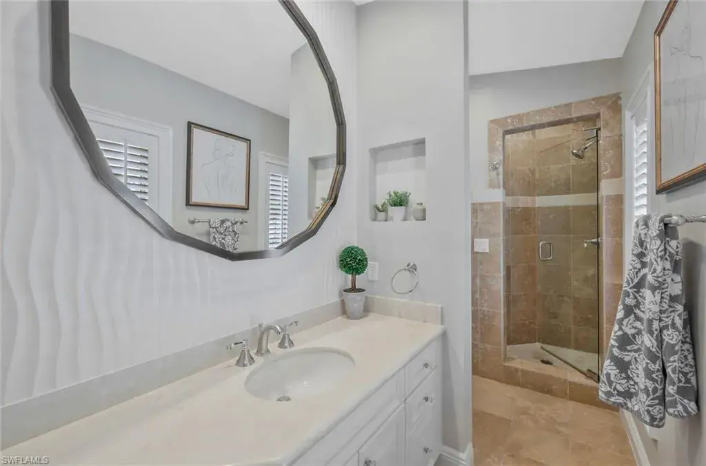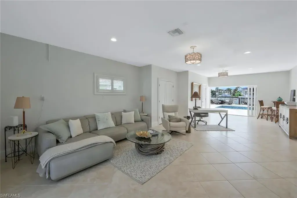The ground level features a versatile family/recreation room with a full bathroom—ideal for guests, a gym, or game nights—that opens directly to the sun-soaked pool deck and private boat dock. Boating enthusiasts will love the direct Gulf access, updated pilings, and electric lift accommodating up to a 10,000 lb boat. The beautifully designed pool, surrounded by stunning travertine pavers, invites relaxation amid tranquil Gulf breezes.