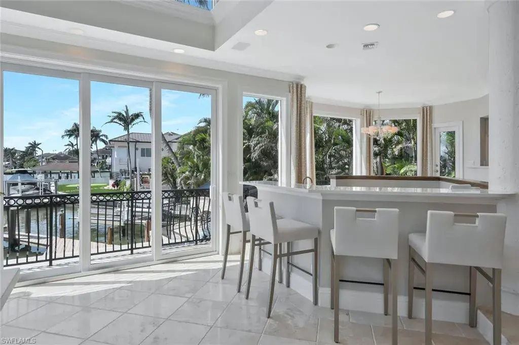 The second floor boasts the main living quarters with soaring ceilings, multiple dining areas, a custom wet bar with wine rack, and a show-stopping living room designed for effortless entertaining and everyday elegance. Stone pillars and travertine marble flooring elevate the ambiance, while expansive glass windows frame the surrounding water views.