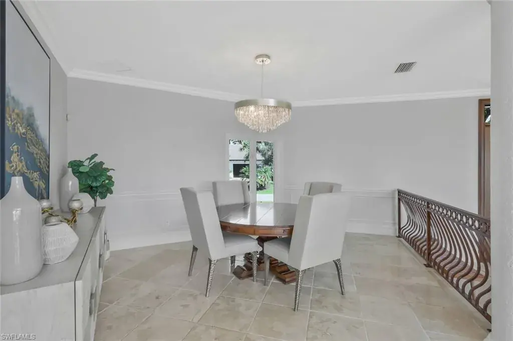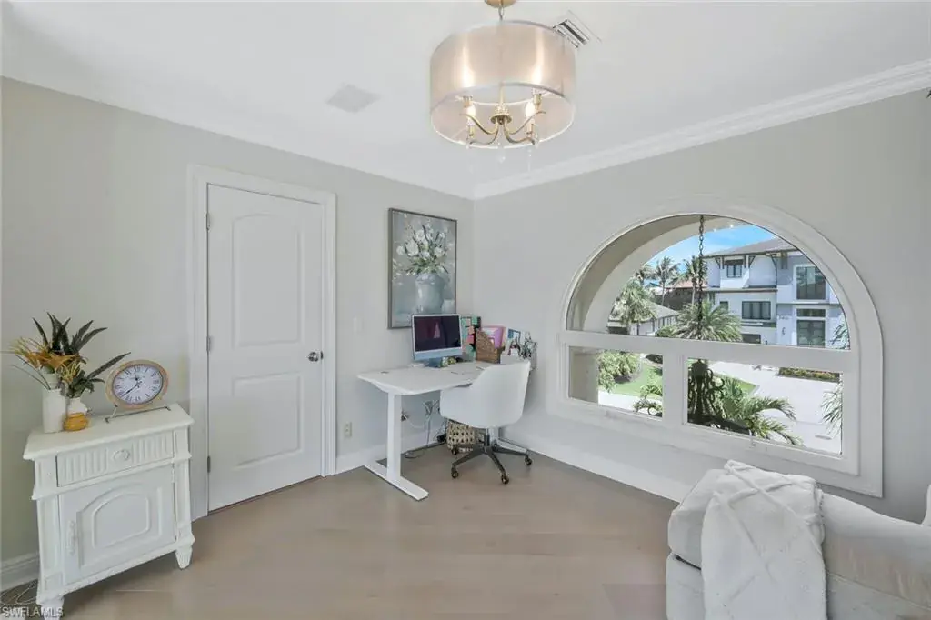The fifth floor, or “Crow’s Nest,” is a private 360-degree lookout accessed via a stunning spiral staircase. This entertainer’s dream space includes a large balcony offering panoramic vistas of Naples, the bay, and glimpses of the Gulf, ideal as a sky bar or relaxation lounge.