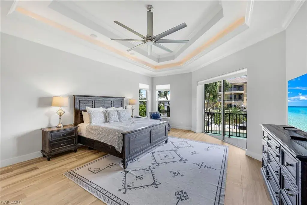 With over 3,300 sq. ft. of beautifully updated living space, the home showcases soaring ceilings, floor-to-ceiling glass, and an open, light-filled floor plan perfect for entertaining. The main-level owner’s suite includes a private lanai with sparkling water views and a spa-inspired bath with Jacuzzi tub and walk-in shower. The 2023 remodeled kitchen with a leathered bar flows seamlessly into the living and dining areas, while a Sonos entertainment system, stylish bar, and private office (or 5th bedroom) enhance the lifestyle.