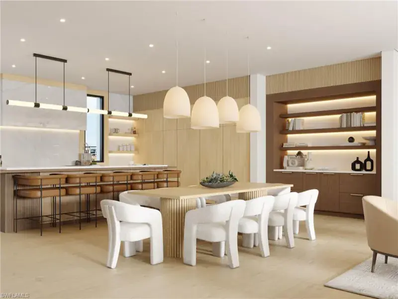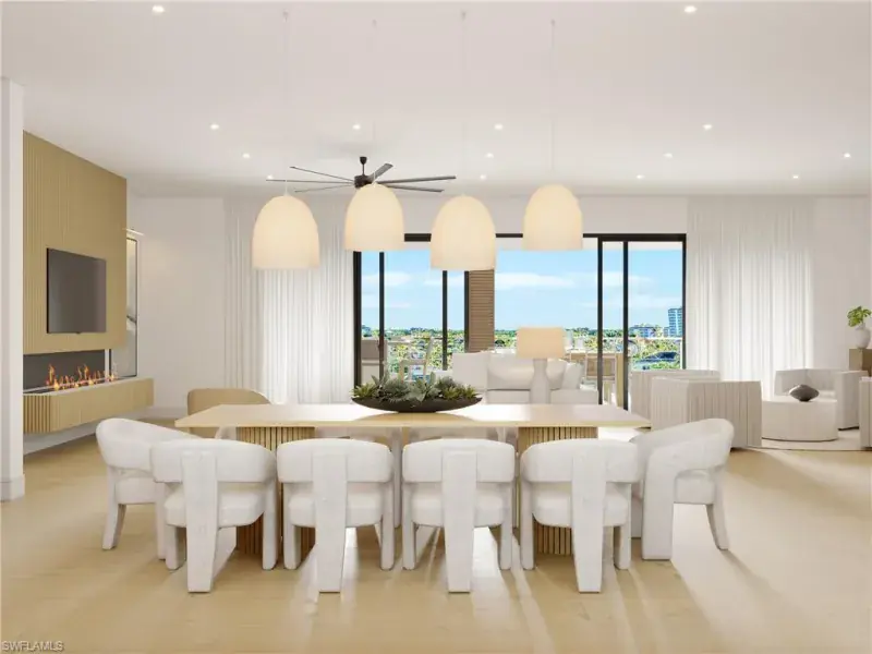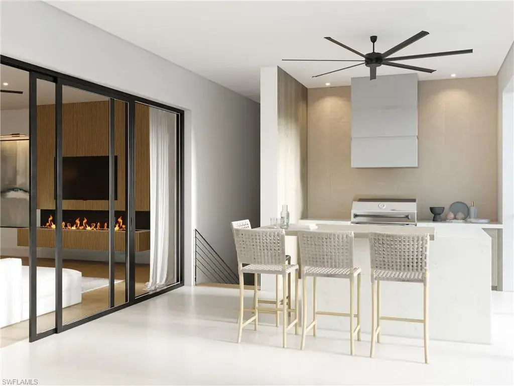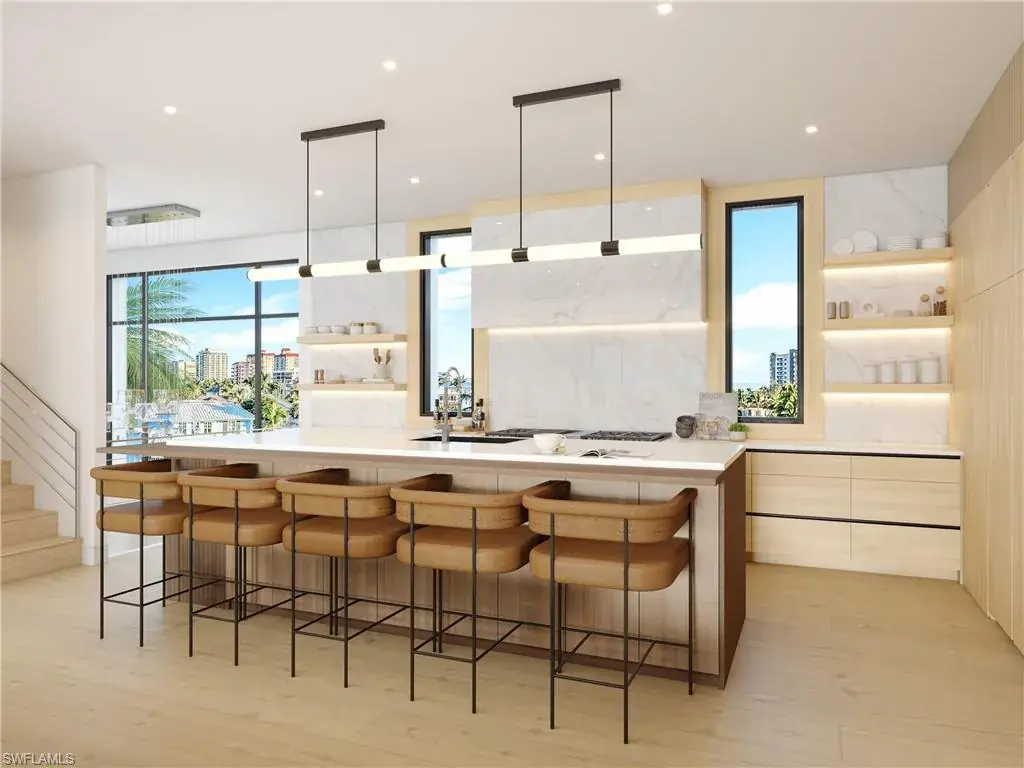 Step inside to discover an open layout floorplan featuring a beautifully crafted kitchen with top of the line custom cabinetry, quartz countertops, equipped with Subzero and Wolf package, climate controlled wine room, a spacious great room with a fireplace and an additional sitting area for guest entertaining. Large sliding glass doors lead to an outdoor living space that is elevated with an expansive outdoor kitchen, dining and lounge areas, setting the stage for memorable alfresco meals and gatherings against a backdrop of spectacular sunset skies, serene bay waters and partial gulf views.
