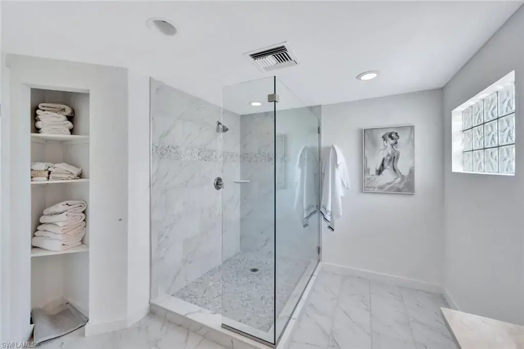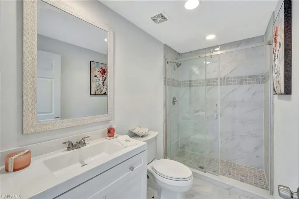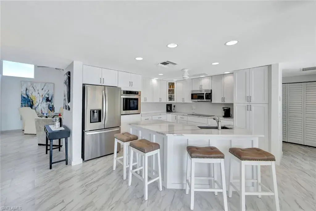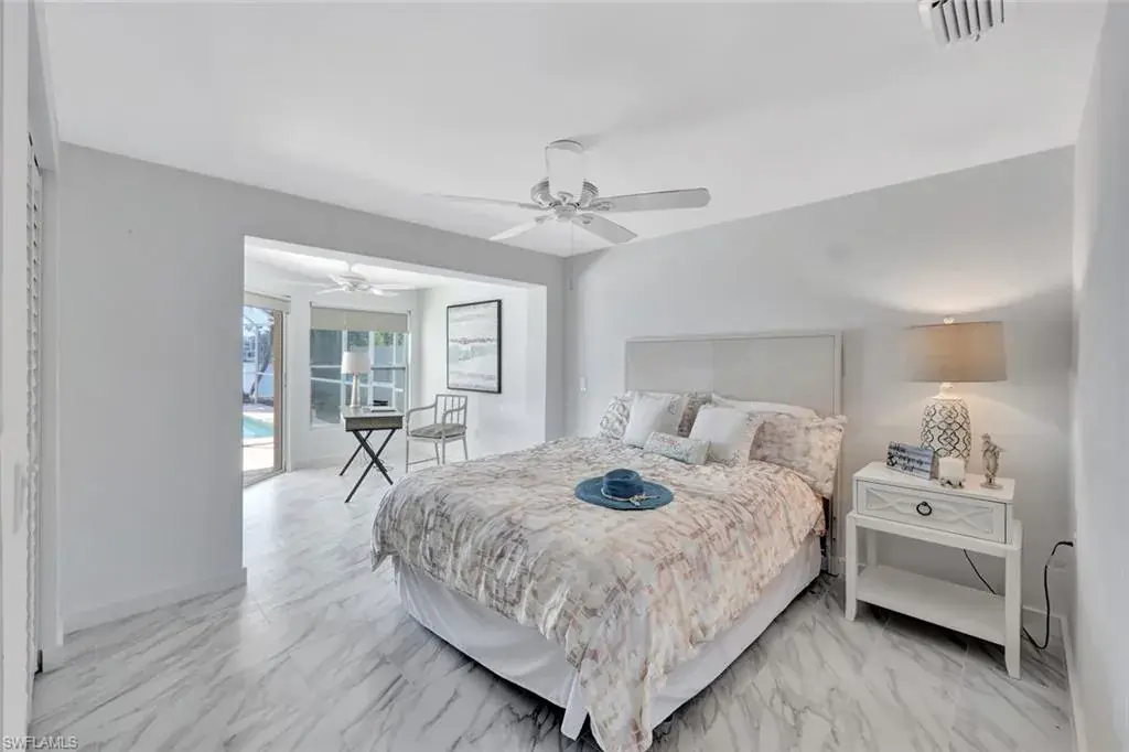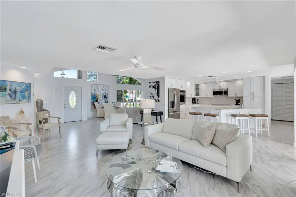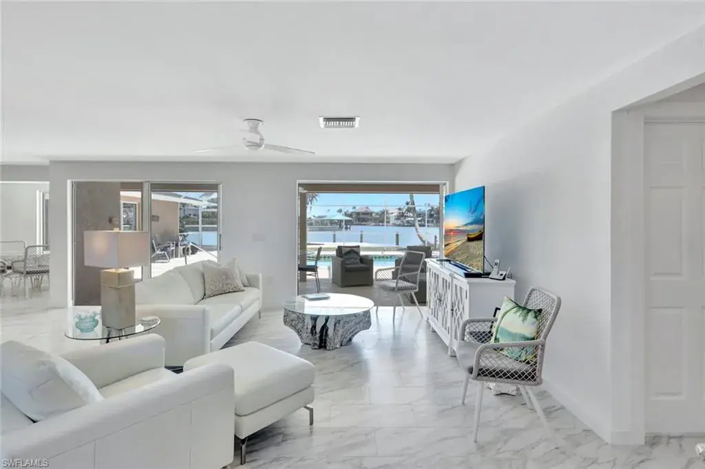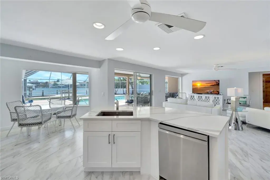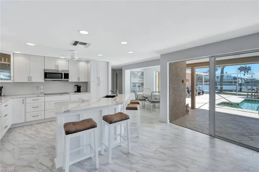 RARE OPPERTUNITY TO PURCHASE A BAY FRONT SOUTHERN EXPOSURE HOME, AND NOT ONLY IS EVERYTHING IN THIS HOME BRAND NEW, BUT WITHOUT A DOUBT IT IS ALL ABOUT THE VIEW!!! If you are lucky enough have the opportunity to call Vanderbilt Beach your home, and you want a very spacious 2344 sq. ft. home with a 2 car garage, complete with boat dock and huge pool, look no further!!! ALL RECONSTRUCTION WAS DONE WITH DURA ROCK CONSTRUCTION. ROOF IS 6 YEARS NEW!!!! Starting with all new ceramic flooring throughout, the dramatic light filled living room is the first to catch your eye and boasts 20 ft. ceilings with angular windows that bring light in the entire day. From the moment you open the new front door, you see directly out to the expansive bay with sparkling water views. This home has water views from every room, and unusual find!! The new kitchen has white cabinets, stainless appliances, Quartzite counter tops, deep sink, faucets and lighting. The Master is unusually large, featuring 2 walk in closets, with a door to the lanai. The large Master bath with extra room to add additional storage is quite rare. The other 2 bedrooms also are spacious, and the 2nd off the lanai features the added den for possible office space. This home is well built, with an 8-year-old roof, which has a guarantee for 25 years, 2 new HVAC’s, and new hot water heater, The lanai area is screened in covering a 24 by 26-foot pool. Invite all your friends, they certainly will fit! Your new boat will fit easily in the extra-large dock that has a 10,000 lb. lift. only a short ride to The Gulf and Wiggins. Close to Mercato, The Ritz, and LaPlaya, and the sugar sand pristine beaches. What is not to like??? And at this price, your new dreams in Paradise can easily come true!!!!!!!!