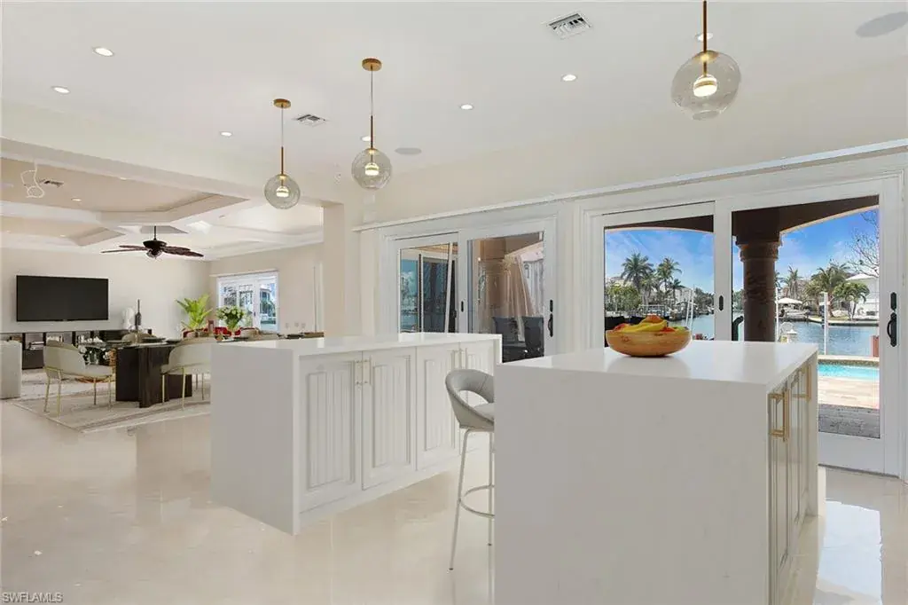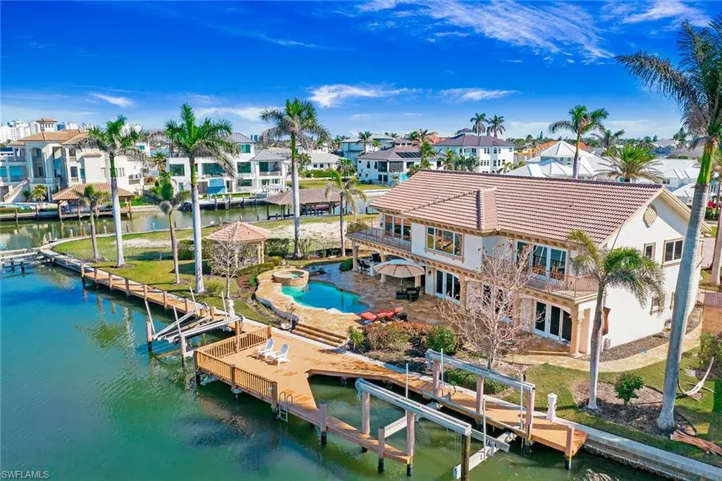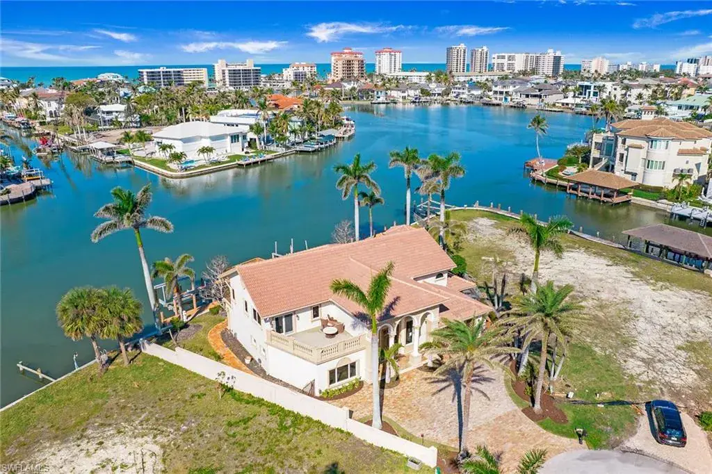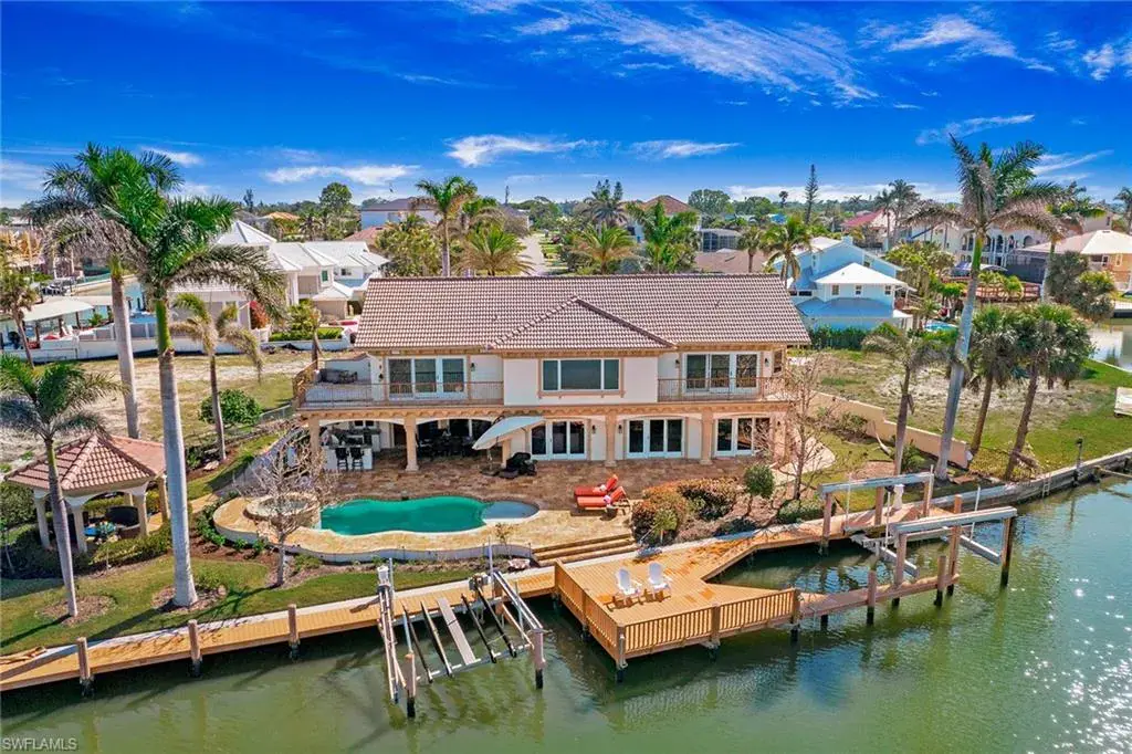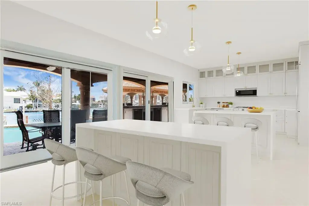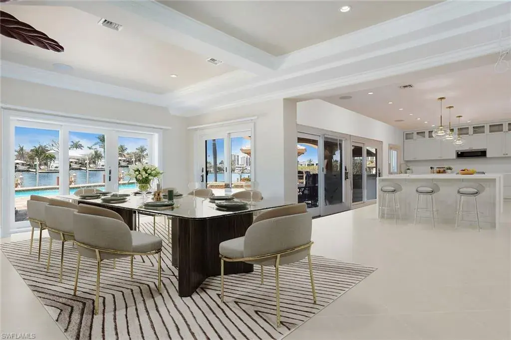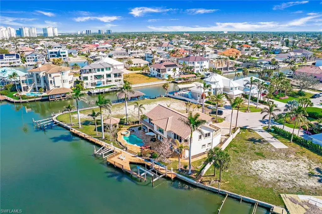 Welcome to 342 Germain Avenue, an unparalleled coastal retreat on an extraordinary gulf access tip lot in the prestigious Conners area of Vanderbilt Beach. This exquisite estate epitomizes the pinnacle of Naples coastal living, offering a unique blend of luxury, privacy and breathtaking waterfront views. At end of Germain Avenue’s cul-de-sac, this premium property spans .37 acres and boasts 175 feet of pristine waterfront with western sunset exposure. Just minutes from the open gulf, Vanderbilt Beach, the Ritz-Carlton Beach Resort, and upscale shops and restaurants at Mercato, this location offers the ultimate in convenience and exclusivity. This is a rare opportunity to customize or rebuild a home tailored to your dreams. The existing two-story architectural masterpiece features a grand entryway with massive iron doors, soaring ceilings and dual curved marble staircases that frame a stunning view of the bay. The house includes five bedrooms and 5.5 baths, with two bedrooms and two full baths on the first floor, along with a pool bath. The expansive kitchen, dining room and living areas offer sweeping water views and are ready for your personal touch. The second floor features a luxurious primary suite with a study and two terraces, one overlooking the water and the other offering extraordinary sunrise views. The second level also features two guest bedrooms, both are en suite with large closets and gorgeous waterfront balconies. One of the most extraordinary features of this home is the vast outdoor space, ideal for grand entertaining or a private oasis. The outdoor kitchen and dining area provide a shady respite, while the resort-style saltwater pool and spa, boat and jet ski lifts, gazebo and deck spanning the entire seawall create the ideal backdrop for relaxation and entertainment. If you are seeking an exclusive boater’s paradise in the heart of Naples, look no further than 342 Germain Avenue. This is coastal living at its finest. Please note the photos depicting the kitchen, dining area and living room are virtual renderings.