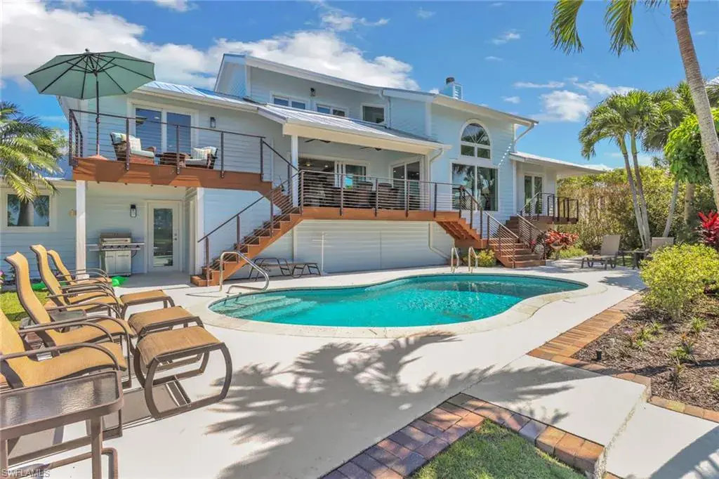 Live the ultimate Naples waterfront lifestyle in this stunning coastal contemporary elevated pool home perfectly positioned at the end of a quiet cul-de-sac in Vanderbilt Beach.
