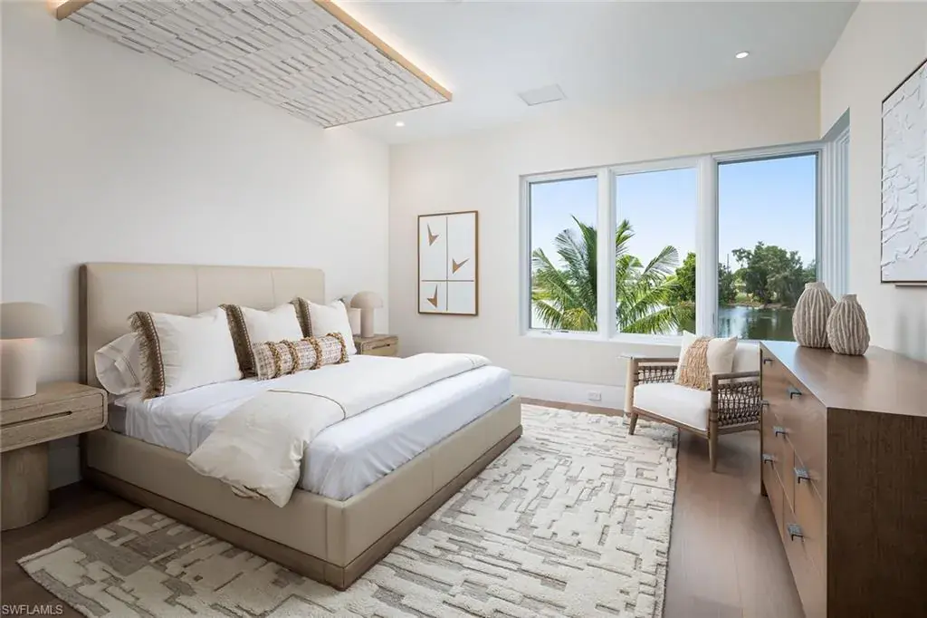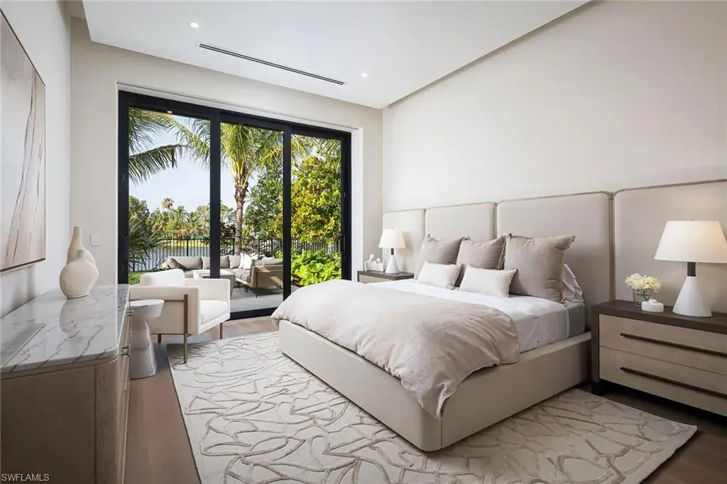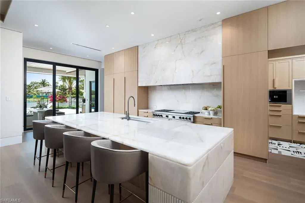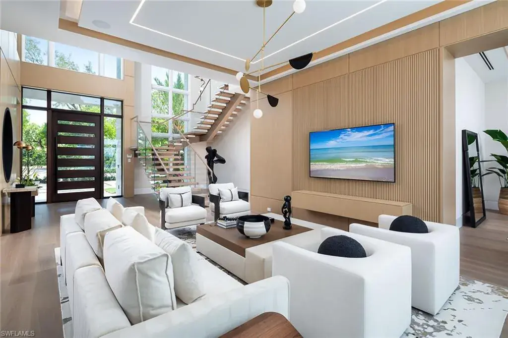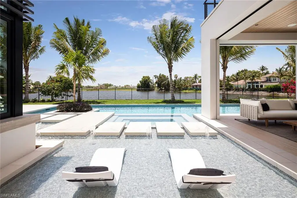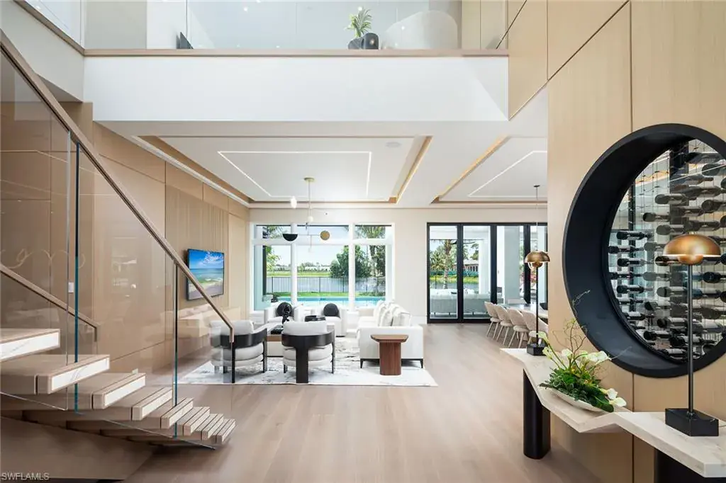 Vista Lago. On a prized southern-facing waterfront estate lot, this newly constructed, custom-curated home offers unmatched luxury, two blocks from Gulf beaches and the anticipated Naples Four Seasons Resort, capturing sweeping panoramic views across tranquil waters to the Fazio-designed championship golf course. This exquisite custom masterpiece is a triumph of luxury and architectural artistry. Encompassing 6,909 square feet of under-air living space, with a total build area of 11,742 square feet, the open-concept floor plan flows effortlessly between indoor and outdoor living, creating an ambiance of casual elegance and grandeur. The ultra-luxury interior selections for the home were expertly curated by the award-winning Freestyle Interiors, blending timeless design with today’s sophisticated modern trends. Six spacious bedrooms with en suites, a private study, fitness room, and an open loft provide refined comfort and versatile functions. The gourmet kitchen is a culinary dream, with exquisite custom cabinets and Cristallo hand-fluted counters, a separate fully equipped chef’s kitchen, custom coffee bar, and a sophisticated wine station highlights the Italian marble wall and island. Walls of glass reveal serene vistas from the expansive kitchen, living and dining spaces, all oriented toward the outdoor sanctuary. The waterfront resort-style pool and spa are surrounded by dining and lounge areas, along with a fully appointed outdoor kitchen, ideal for unforgettable entertaining. For the car enthusiast, the four-car air-conditioned garage is thoughtfully designed with capacity to accommodate up to eight vehicles with lifts. Penned by BECK Architects and expertly built by renowned Parker Hudson Homes, this is more than a home, it is an extraordinary lifestyle statement, where luxury meets legacy. Minutes to downtown Naples and a short distance to the beach. This is the epitome of the Naples lifestyle.