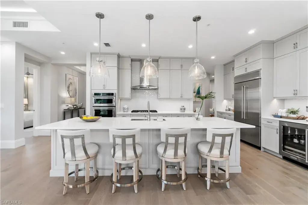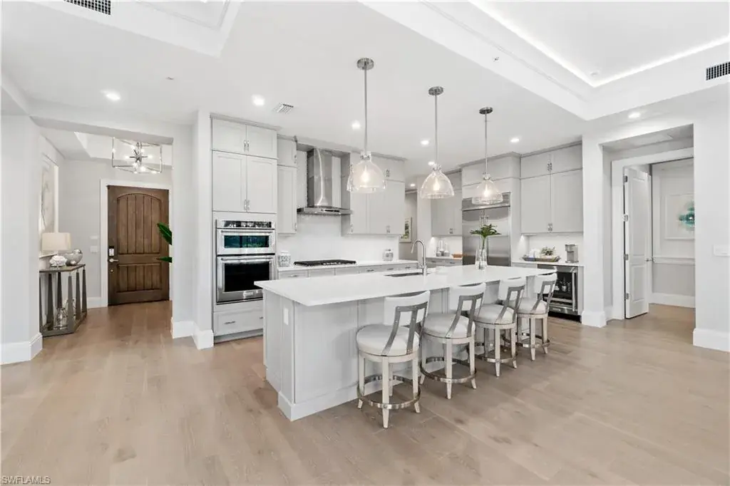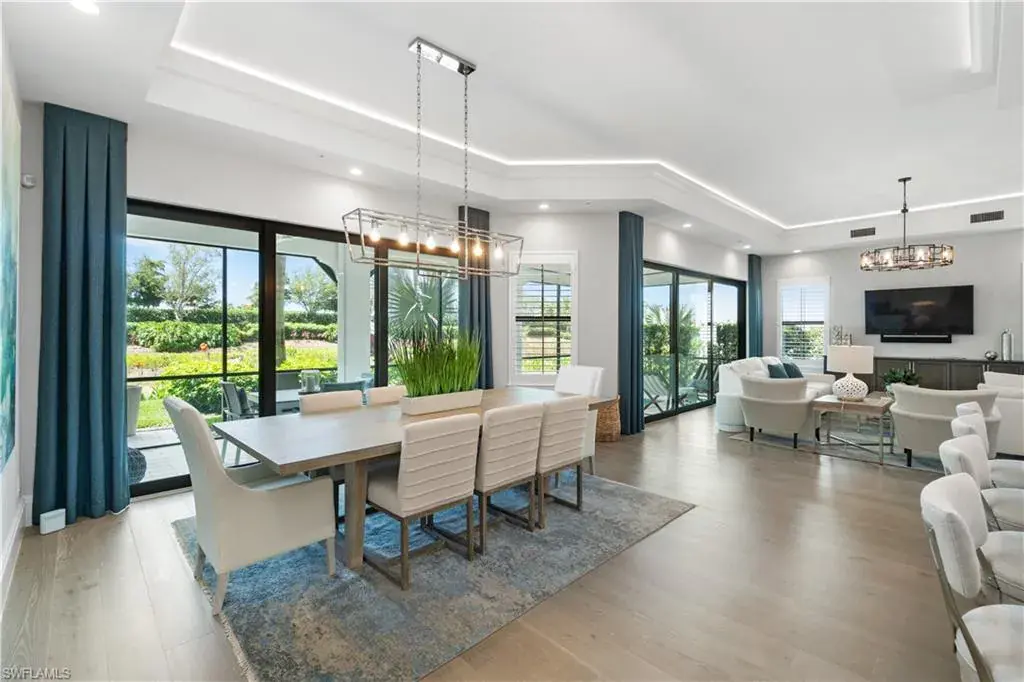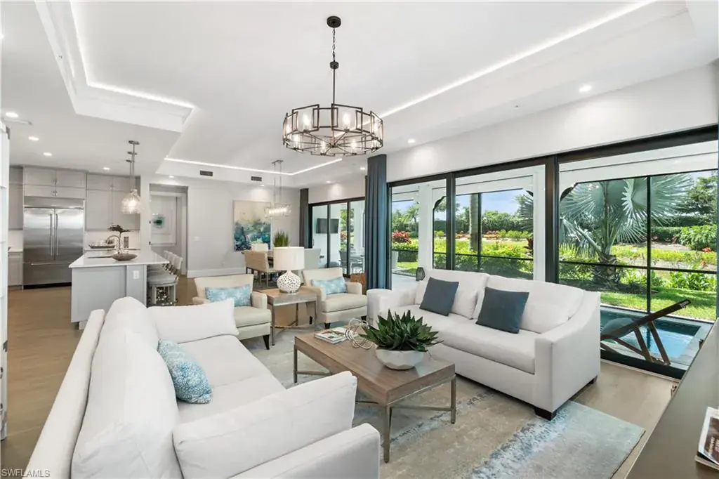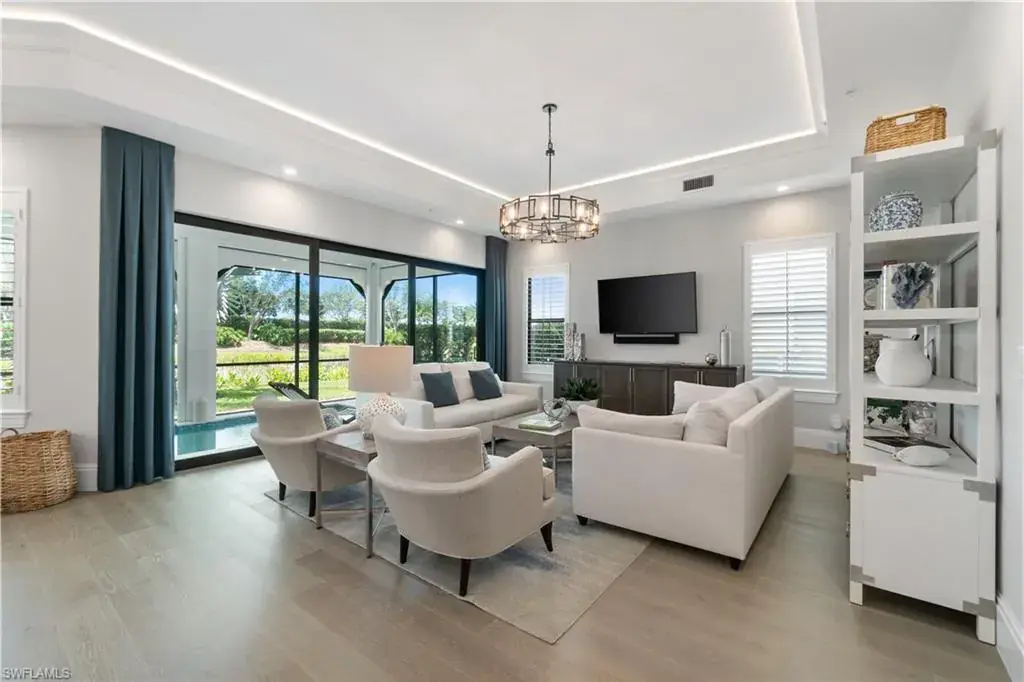 Move-in-Ready! Stunning 2021 coach home built in one of the most coveted golf and tennis communities in Naples. More than 3,000 square feet of laid-back sophistication with seamless indoor/outdoor design suited for entertaining. This first-floor coastal contemporary masterpiece has an open floor plan that lives like a single-family home (with no stairs, for ultimate ease!) This former model home offers many upgrades including hardwood floors, natural gas, designer light fixtures, a Lutron shade system, all impact glass windows/doors including 10 ft impact glass sliders & hurricane electric storm shutters on the whole-house-wide lanai. Coveted southern exposure grants natural light & picture-perfect waterfront sunsets from the spacious travertine-paved lanai with a private saltwater pool. Stunning chef’s kitchen features an 11’ island, gas range, walk-in pantry & wine bar with wine cooler. All bedrooms offer en-suite baths & the spa-like Primary suite includes an oversized closet with custom built-ins, generous walk-in shower & modern freestanding tub. The attached private 2-car garage has ample storage & room for a golf cart. North Naples’ coveted Talis Park community offers an award-winning golf course, currently under spectacular renovation, private beach shuttle, multiple restaurants, state-of-the-art fitness center, spa, tennis, bocce & pickleball.