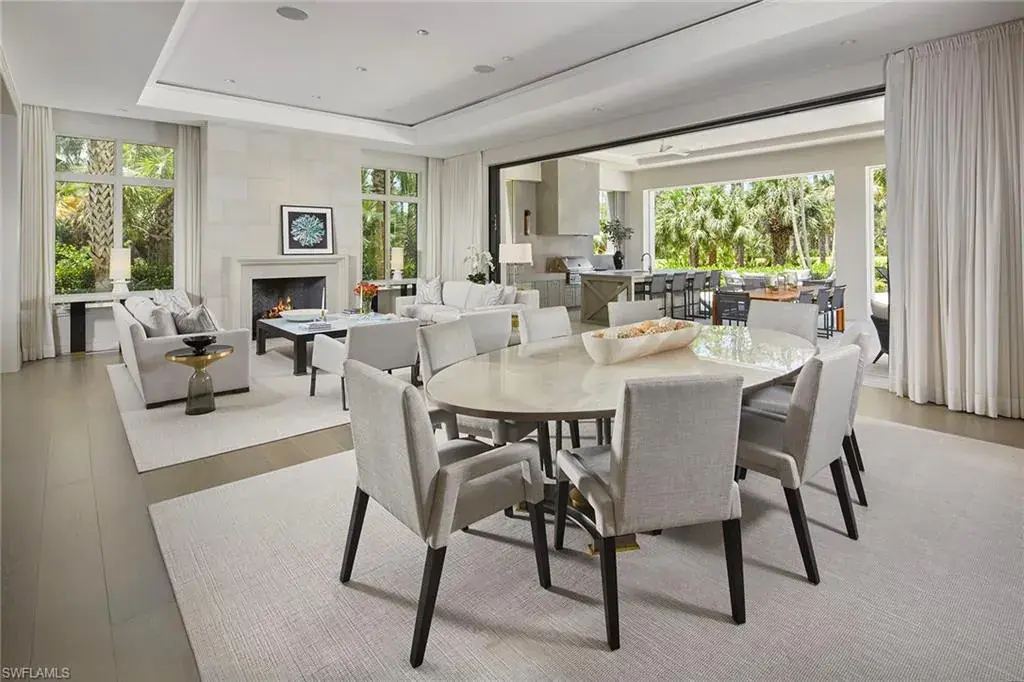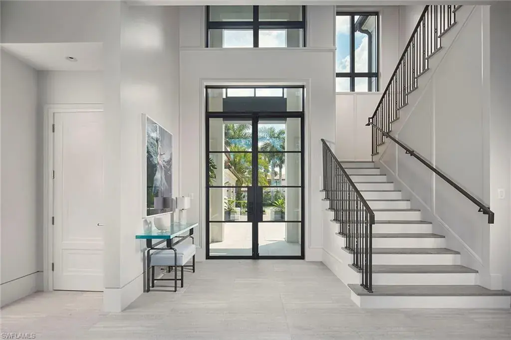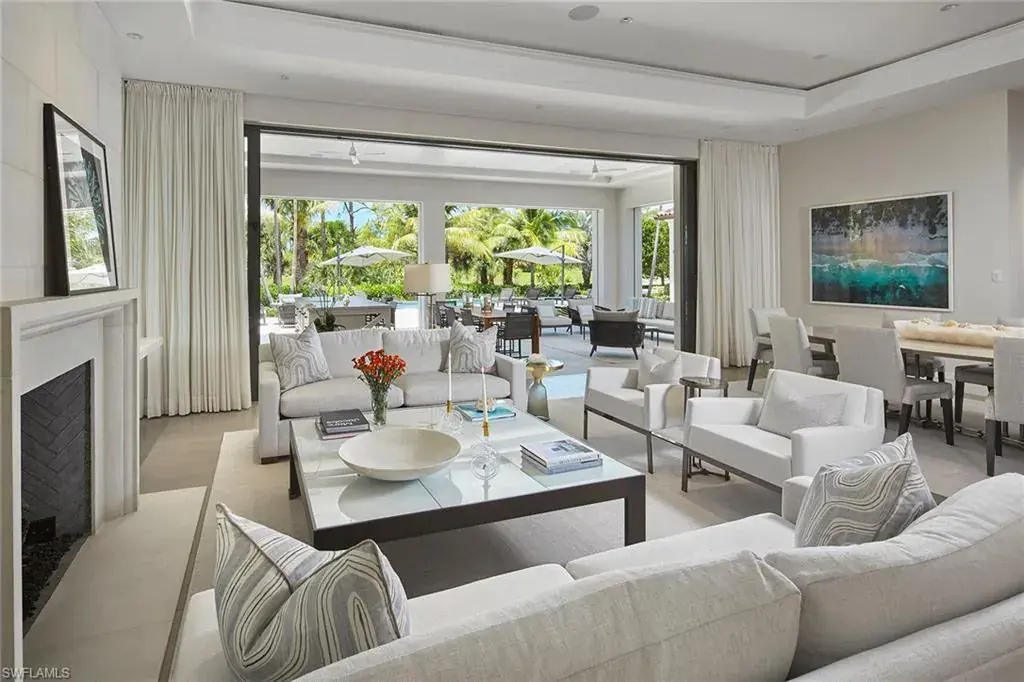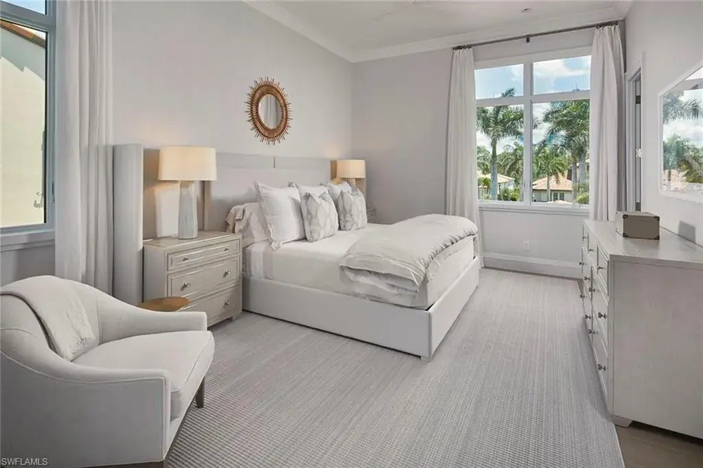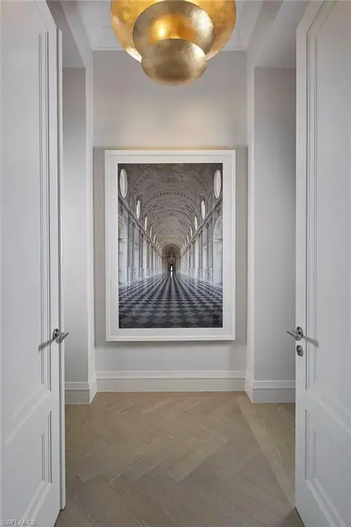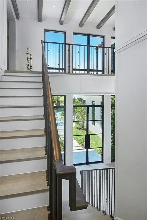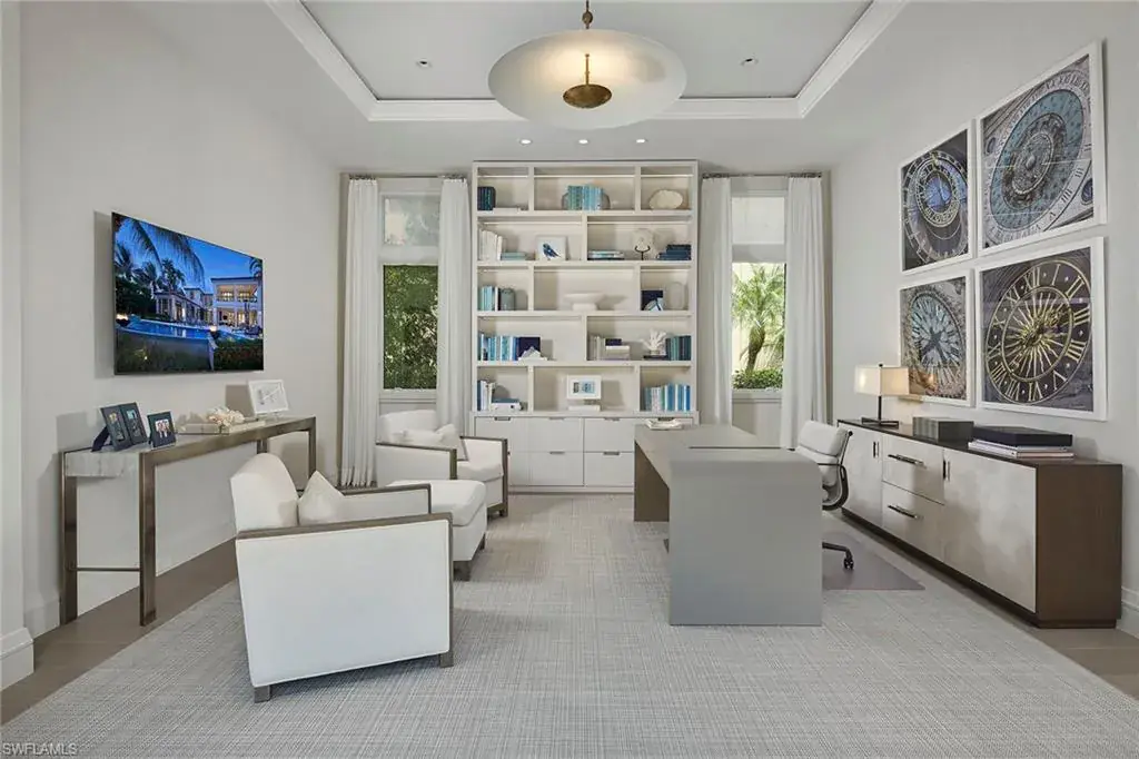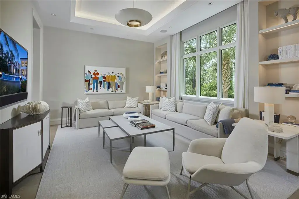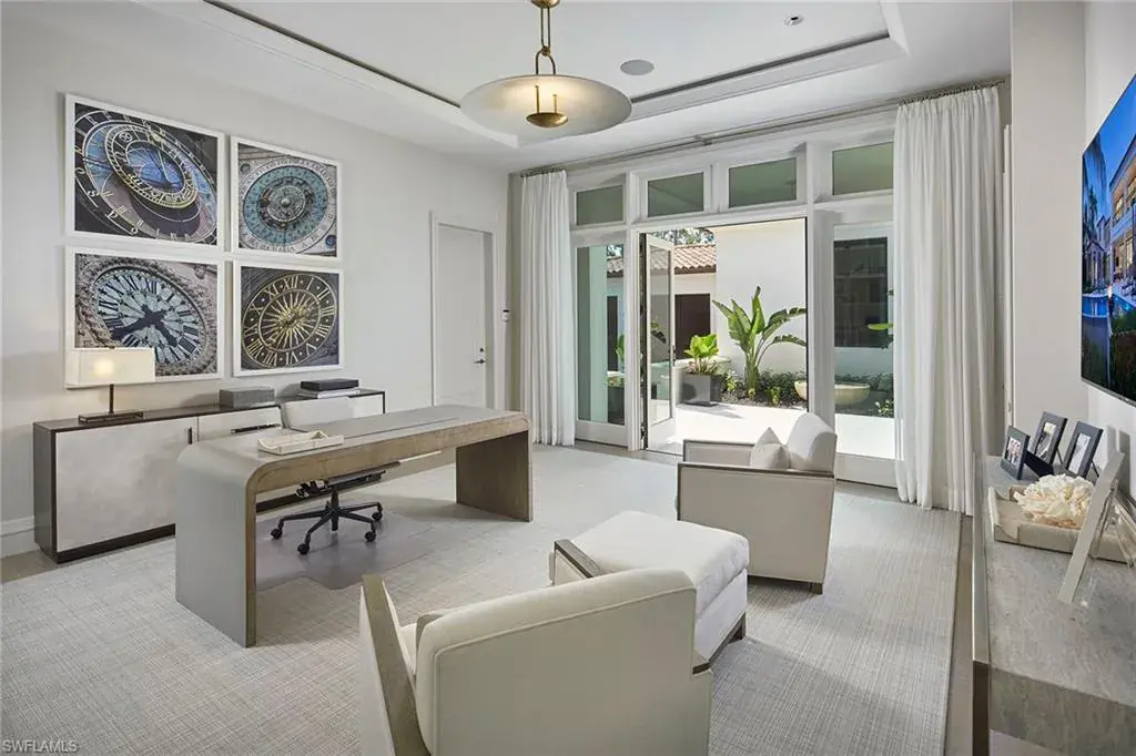 Immediate golf membership available! This custom-designed estate is on a private panoramic homesite in the prestigious Cortile neighborhood in Mediterra Golf and Country Club. The home features nearly 7,000 square feet of luxurious living with five bedrooms plus study and is ideally on a lush private homesite offering panoramic preserve, lake and golf course views of the north and south finishing holes. A soaring, bright and airy two-story foyer adorned with custom beams welcomes you through modern double glass doors. Constructed in 2019 and designed by acclaimed interior designer Brian Gluckstein, the residence is a study in architectural refinement. The interior is highlighted by extensive use of natural light, wide-plank white oak flooring, meticulously crafted ceiling details and refined cabinetry by SOHO. Detailed millwork, integrated lighting design and designer hardware elevate the home’s overall aesthetic. The formal living room with a natural gas fireplace seamlessly transitions an open-concept more casual family room, and a gourmet kitchen featuring a white Caesar stone waterfall island, Wolf six-burner gas range with custom hood, built-in steam oven, warming drawer, Miele dishwasher, Sub-Zero refrigeration and under-counter wine storage. Adjacent spaces are defined by symmetry and scale with artful transitions between rooms via inset door frames and coffered ceilings. Expansive pocketing sliders open to a covered lanai with a Lynx gas grill, Perlick beverage drawers and automated screens and shutters, ideal for year-round alfresco entertaining and storm protection. The resort-style gas-heated pool and spa are flanked by dual fire bowls with water spillovers and a freestanding fire pit offering tranquil views and exceptional privacy. The primary suite features dual walk-in closets, dual water closets, glass-enclosed shower with dual heads and a freestanding modern soaking tub. One main-floor guest suite, three second-floor guest suites, a loft with wet bar and entertainment wall, expansive covered sunset overlook balcony with automated screens and shutters and secondary laundry provide ample space and convenience for visiting family and friends. Additional features of this magnificent property include a natural gas-powered Generac generator, Andersen 400 Series impact-rated windows and doors, elevator, four-car climate-controlled garage spaces and Control4 home automation. A world of luxury awaits you in Mediterra featuring two Tom Fazio-designed championship golf courses, a Gulf-front beach club and restaurant, tennis and pickleball courts, an updated clubhouse, and a soon-to-be-expanded new sports and lifestyle center.