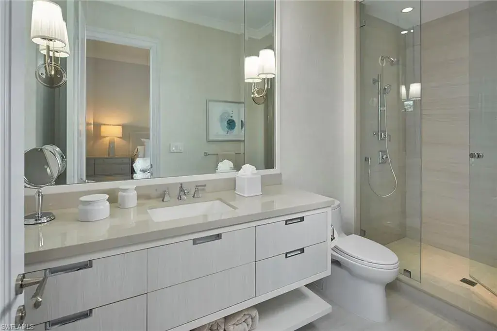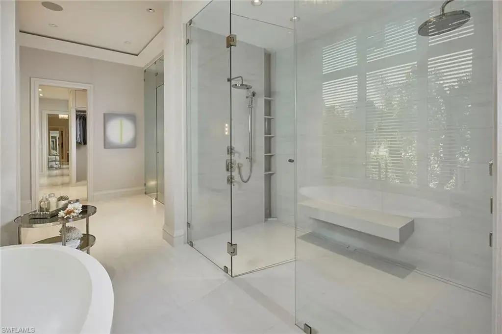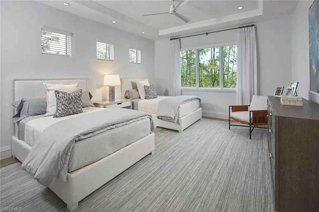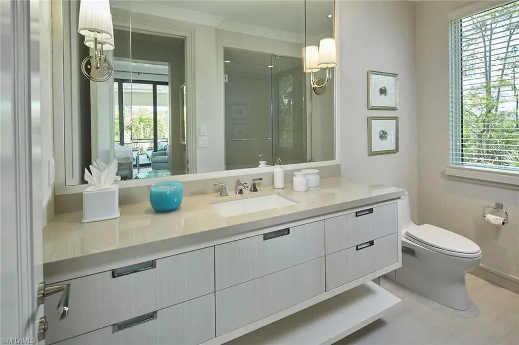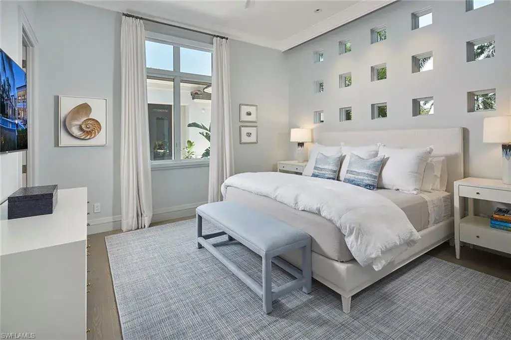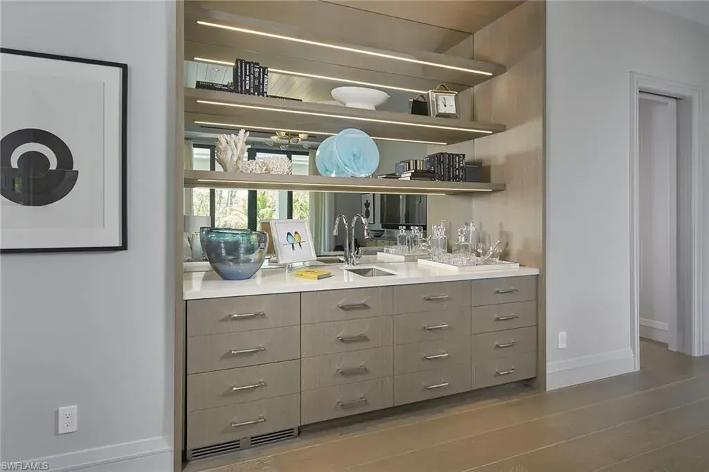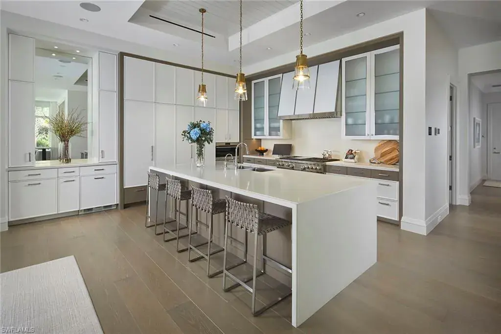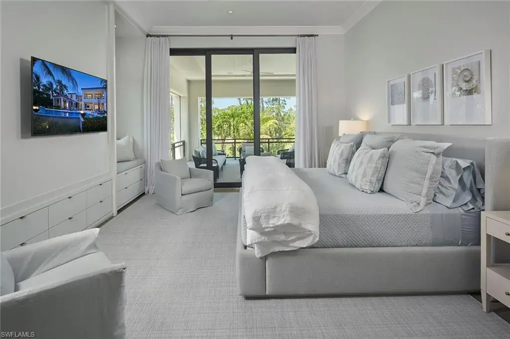 Immediate golf membership available! This custom-designed estate is on a private panoramic homesite in the prestigious Cortile neighborhood in Mediterra Golf and Country Club. The home features nearly 7,000 square feet of luxurious living with five bedrooms plus study and is ideally on a lush private homesite offering panoramic preserve, lake and golf course views of the north and south finishing holes. A soaring, bright and airy two-story foyer adorned with custom beams welcomes you through modern double glass doors. Constructed in 2019 and designed by acclaimed interior designer Brian Gluckstein, the residence is a study in architectural refinement. The interior is highlighted by extensive use of natural light, wide-plank white oak flooring, meticulously crafted ceiling details and refined cabinetry by SOHO. Detailed millwork, integrated lighting design and designer hardware elevate the home’s overall aesthetic. The formal living room with a natural gas fireplace seamlessly transitions an open-concept more casual family room, and a gourmet kitchen featuring a white Caesar stone waterfall island, Wolf six-burner gas range with custom hood, built-in steam oven, warming drawer, Miele dishwasher, Sub-Zero refrigeration and under-counter wine storage. Adjacent spaces are defined by symmetry and scale with artful transitions between rooms via inset door frames and coffered ceilings. Expansive pocketing sliders open to a covered lanai with a Lynx gas grill, Perlick beverage drawers and automated screens and shutters, ideal for year-round alfresco entertaining and storm protection. The resort-style gas-heated pool and spa are flanked by dual fire bowls with water spillovers and a freestanding fire pit offering tranquil views and exceptional privacy. The primary suite features dual walk-in closets, dual water closets, glass-enclosed shower with dual heads and a freestanding modern soaking tub. One main-floor guest suite, three second-floor guest suites, a loft with wet bar and entertainment wall, expansive covered sunset overlook balcony with automated screens and shutters and secondary laundry provide ample space and convenience for visiting family and friends. Additional features of this magnificent property include a natural gas-powered Generac generator, Andersen 400 Series impact-rated windows and doors, elevator, four-car climate-controlled garage spaces and Control4 home automation. A world of luxury awaits you in Mediterra featuring two Tom Fazio-designed championship golf courses, a Gulf-front beach club and restaurant, tennis and pickleball courts, an updated clubhouse, and a soon-to-be-expanded new sports and lifestyle center.