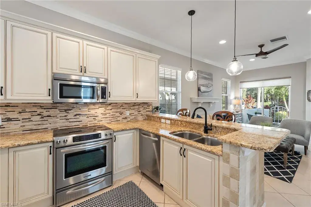 An exceptional former model home with southwestern views, on the single-loaded end of the street on the 12th hole of the Rookery Golf Course, ideal for taking in stunning sunsets from your private lanai. Boasting 1,967 square feet of thoughtfully designed living space, this residence offers negotiable furnishings, three bedrooms, two baths and a two-car garage. The exterior impresses with a 2019 tile roof, a paver driveway and walkway, and lush landscaping, all in distance to the clubhouse in the award-winning community of Fiddler’s Creek. Inside, soaring 10-foot ceilings, crown molding, and recessed lighting create a bright and welcoming ambiance, while arched windows and upgraded fixtures add timeless elegance. The open kitchen features KitchenAid stainless steel appliances, white cabinetry, under-cabinet lighting, granite countertops, a glass tile backsplash, a two-seater breakfast bar and a large pantry, making it functional and stylish. The adjoining dining area and light-filled family room create a space for entertaining or everyday living. The owner’s suite is a serene retreat, showcasing wood flooring, a vaulted ceiling and a bank of windows inviting natural light. Dual walk-in closets and a luxurious en-suite bath with a deep soaker tub, dual vanities and a frameless glass-enclosed walk-in shower complete this private oasis. Two additional bedrooms also feature wood flooring, with one offering its en-suite bath. The outdoor living area is equally impressive, with a covered lanai featuring brick pavers, ample room for lounging, and a sparkling pool with privacy hedges and a screen enclosure. A no-see-um automatic mister system ensures comfort year-round, while one of the home’s five mounted TVs is conveniently in the lanai for outdoor entertainment. Recent updates include a new washer and dryer, a new pool heater, and the home is prewired for a generator for added convenience and peace of mind. Additional upgrades include California Closets throughout the home, a garage door under warranty, and five total TVs for easy move-in comfort. Residents of Fiddler’s Creek enjoy world-class amenities, including championship golf, a fitness center, tennis, pickleball, bocce, a full-service spa, sauna, casual and fine dining, and a resort-style pool. Golf, beach and marina memberships are available, offering even more ways to enjoy the Florida lifestyle. Ideally between downtown Naples and pristine beaches of Marco Island, this home is a combination of luxury, privacy, and convenience. Plus, the CDD is fully paid. Don’t miss this rare opportunity to own a beautifully appointed home in one of Naples sought-after communities.