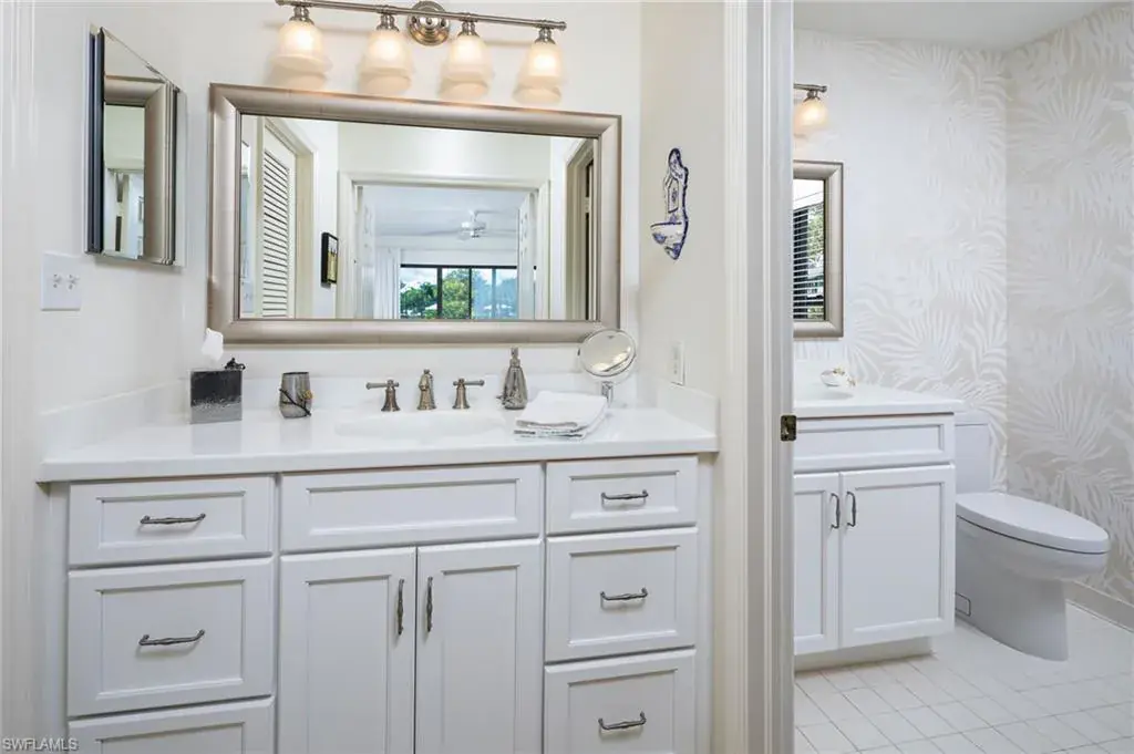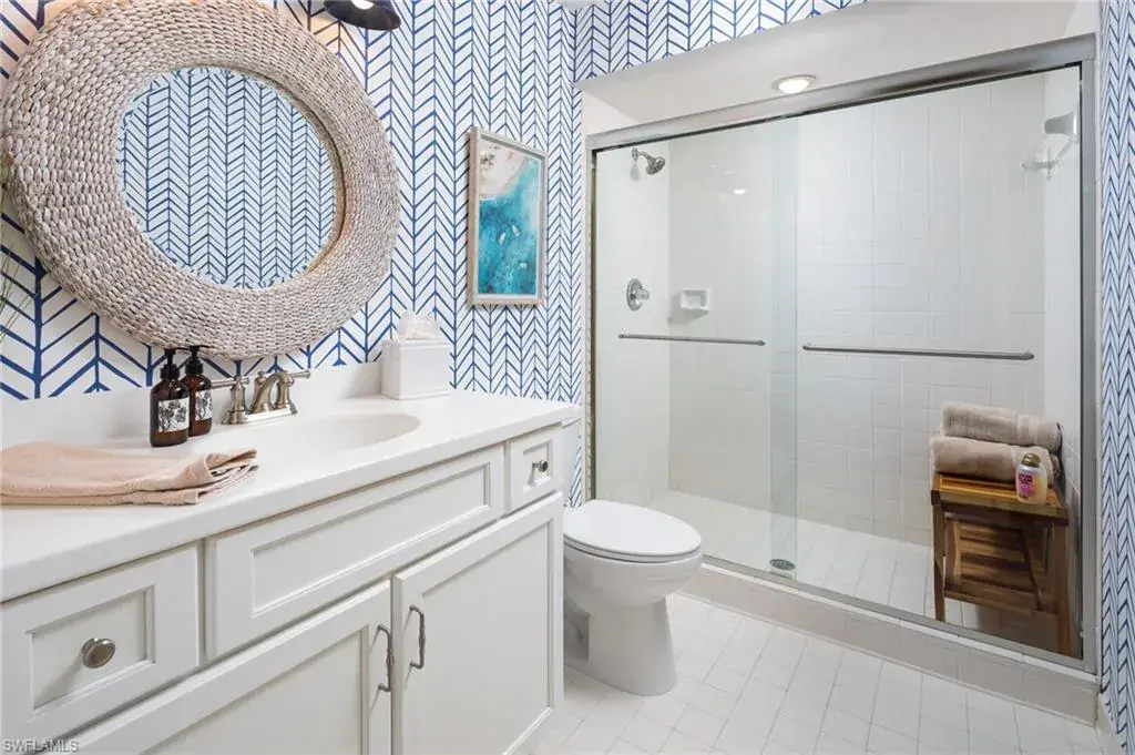 Unique wall coverings throughout add character and sophistication, enhancing the home’s