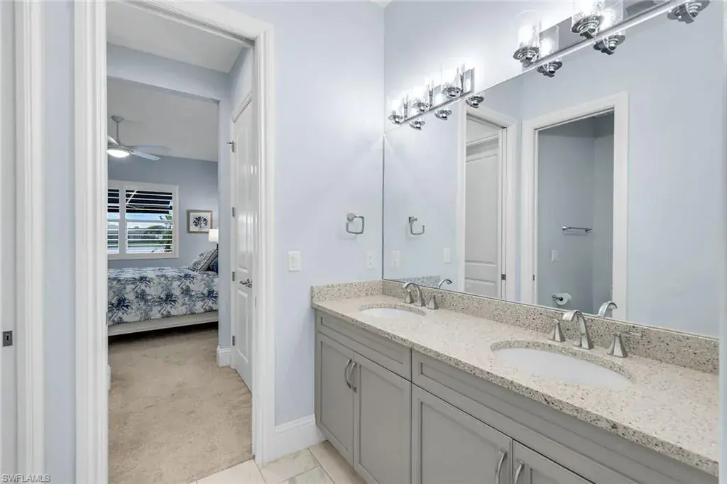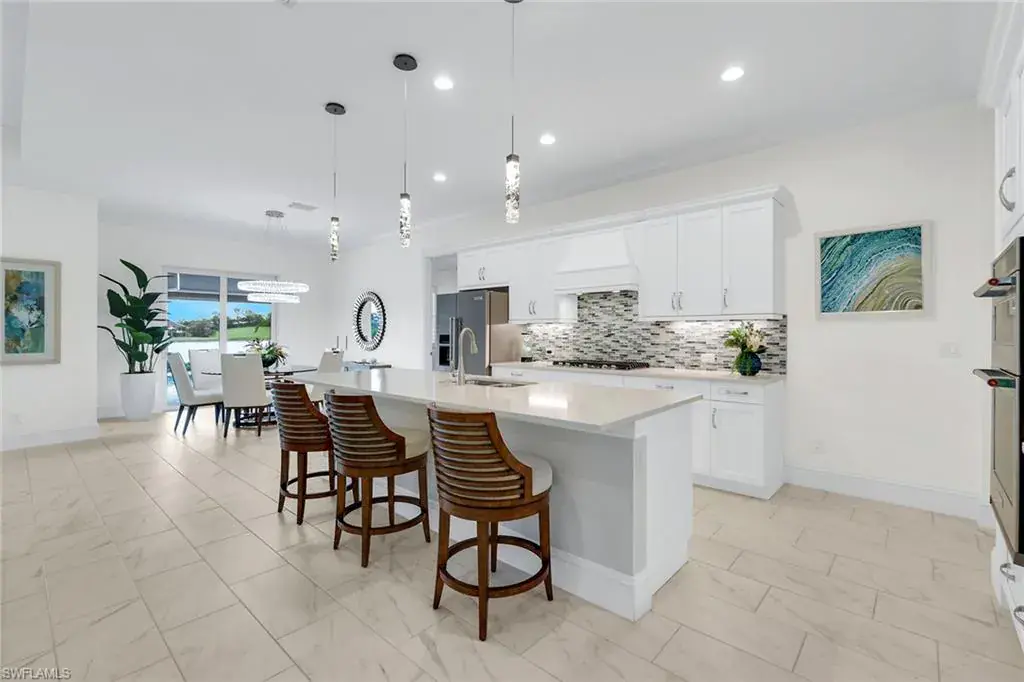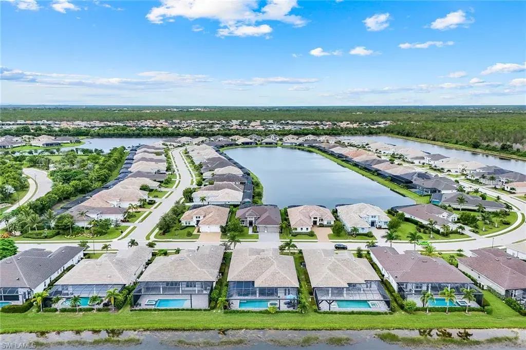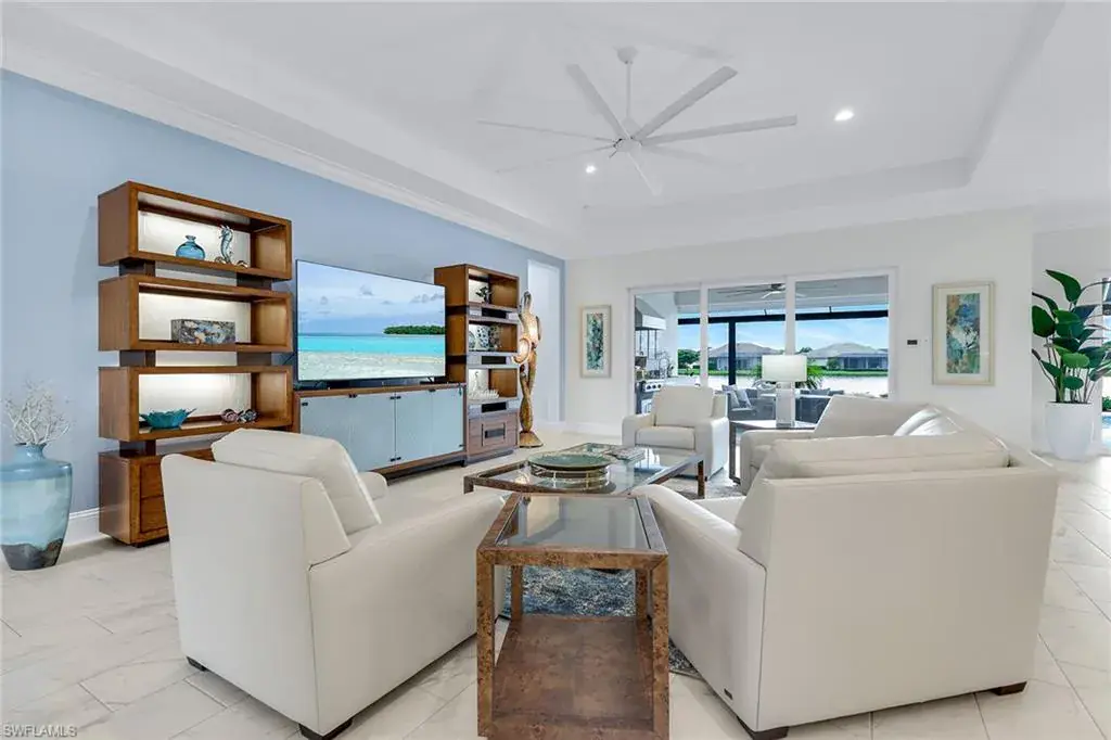 Welcome to a rare opportunity in the boutique community of Naples Reserve, where sophistication blends seamlessly with relaxed coastal living. Crafted by Stock Development, and showcasing the distinctive touches of Linda Burke Interiors, this beautiful home sits on an oversized lakefront lot, offering panoramic water views and direct access to two large lakes. For those dreaming of water recreation, a private boat dock may be built, elevating your Florida lifestyle to new heights. From interior luxury living, to the spacious lanai and pool area, this home is designed for discerning buyers who want both style and quality. Featuring 12-foot tray ceilings, expansive impact-rated windows and doors, you may entertain effortlessly in the chic, beautifully styled great room or transition to the spacious lanai where your custom Smokey Stone outdoor kitchen, dramatic waterfall pool and spa, and inviting firepit create a sanctuary. The oversized outdoor dining space is dramatic with the full kitchen, panoramic view cage, custom awning and cozy fire pit. Step inside to discover a chef’s kitchen distinguished by quartz countertops, designer cabinetry and high-end gas appliances with a cook-top range and custom designer hood. This pristine and beautifully decorated home offers the finest in finish details including plantation shutter window treatments. The primary bedroom suite is a tranquil retreat with a spa-inspired bath and dual custom designed walk-in closets. Charming French doors open to the lanai and pool area. Three guest bedrooms, a bright and spacious den and a formal dining area ensure space and privacy. The lighting throughout is custom and superior. Recently appraised for more than $2.1 million and offered with furniture negotiable, this wonderful four-bedroom plus den home requires no flood insurance. Note the immaculate three-car garage with air conditioning, extra insulation and epoxy flooring along with SunGuard tinted windows throughout, plus additional landscaping and outdoor lighting. Don’t forget the 500-gallon propane tank which powers the whole-house generator and both kitchens. Every feature, from tinted SunGuard windows to professionally designed landscaping and outdoor lighting reflects luxury without compromise. With no flood insurance required and a recent high value appraisal, energy efficient upgrades, new custom-built closets and designer touches, this home offers both investment confidence and security in today’s market. Enjoy a drive in the six-person golf cart (also negotiable). Naples Reserve is a sought-after community offering robust social and sports activities, a newly remodeled restaurant and kitchen, pickleball, tennis, tiki bar, a lakeside marina, a resort-style pool, a clubhouse and an activity-filled fitness center. The Marco Island lifestyle of beaches and boating are minutes away, as is the pleasure of fine cuisine in Old Naples. More than a home, it’s an invitation to escape to your own paradise in Naples, FL.