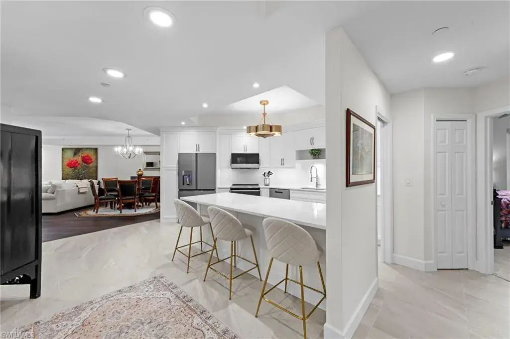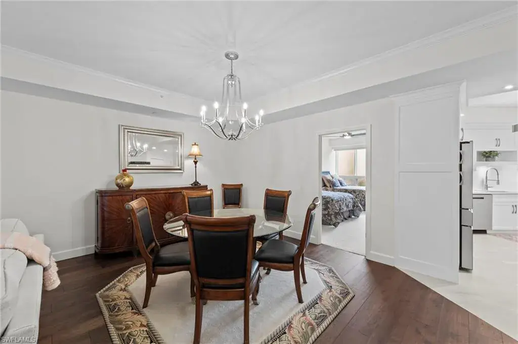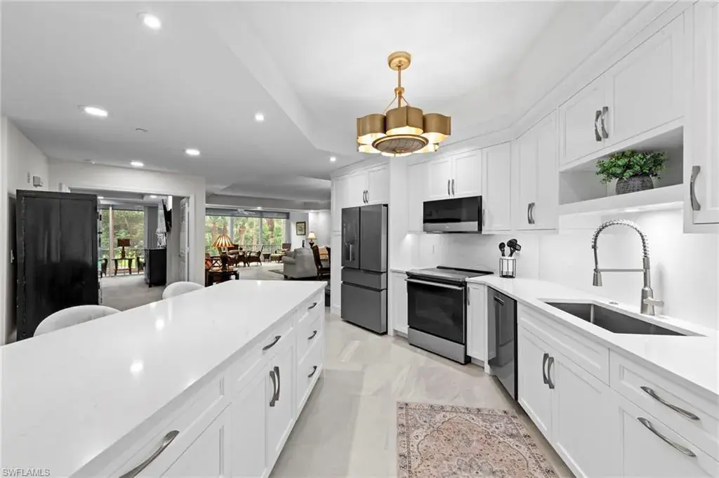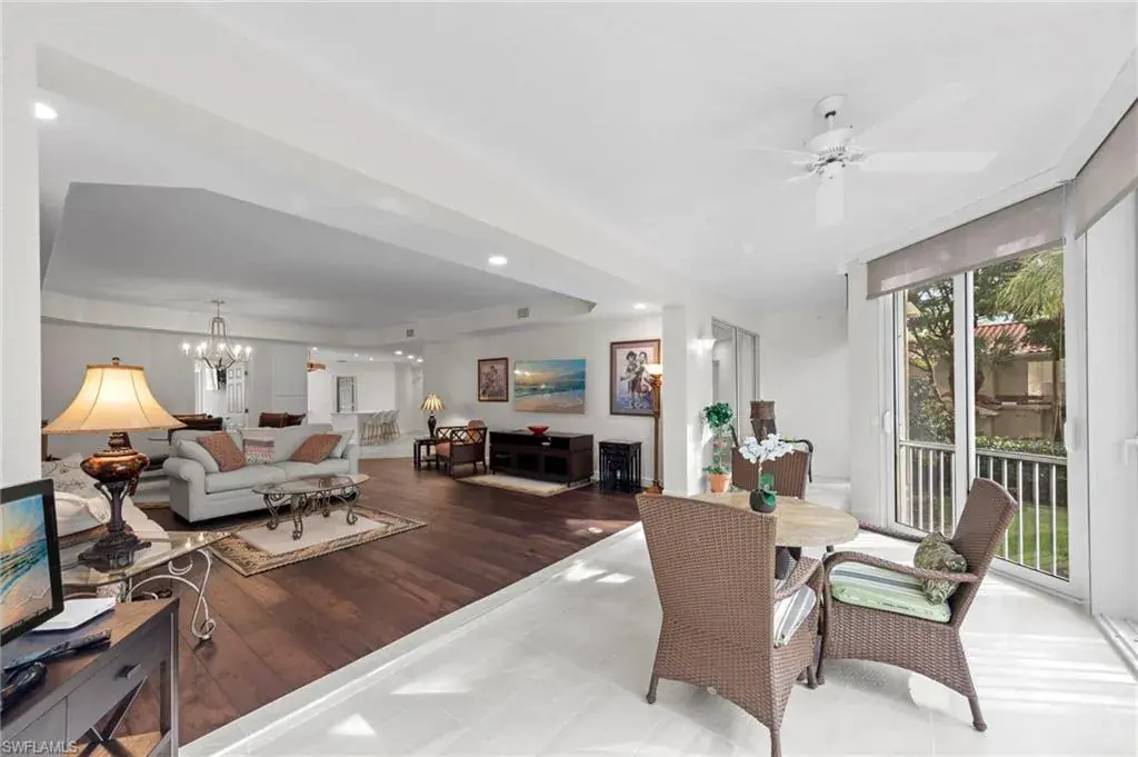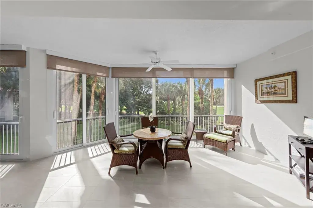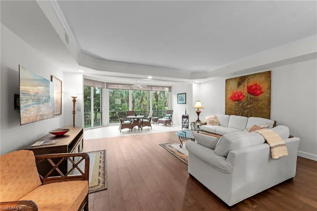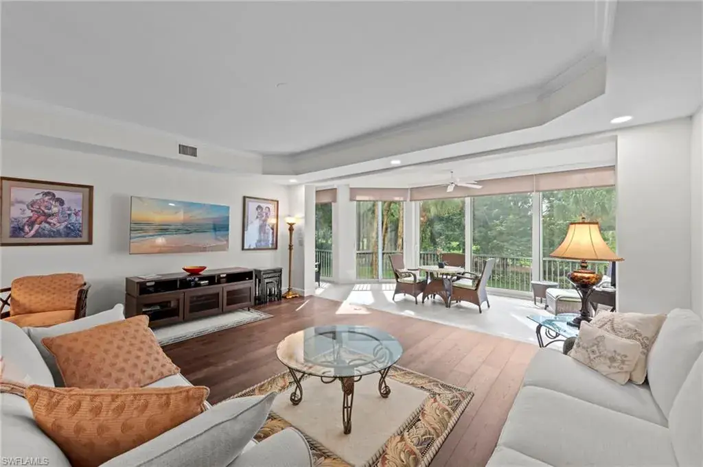 Welcome to this beautifully renovated condo at The Crescent in Pelican Bay, where modern upgrades meet the best of resort-style living in Naples. From the inviting entry you are drawn through the unit to the glass & screened enclosed sunroom offering tropical vistas over the garden areas and fairway. The redesigned kitchen shines with white cabinetry, quartz countertops, and premium stainless appliances, while new hardwood and tile floors flow seamlessly throughout. Expanded living areas with hurricane-rated doors add both space and security. The primary suite offers a relaxing retreat with a remodeled bath, quartz counters, updated shower and tub, and custom closets. Guests will feel right at home with spacious bedrooms, including one with its own ensuite.  Recent updates like new A/C and hot water heater (2023) keep the home efficient and worry-free. The Crescent offers its own clubhouse, pool, spa, and fitness center, plus all the Pelican Bay perks—private beach access with beachfront dining, tennis, miles of walking and biking paths, with canoes and kayaks for residents. Just minutes to Waterside Shops and Mercato. This is the perfect blend of comfort, convenience, and Florida lifestyle in one of Naples’ most sought-after communities. The Crescent in Pelican Bay received no damage from last 3 hurricanes and no water intrusion in garage.