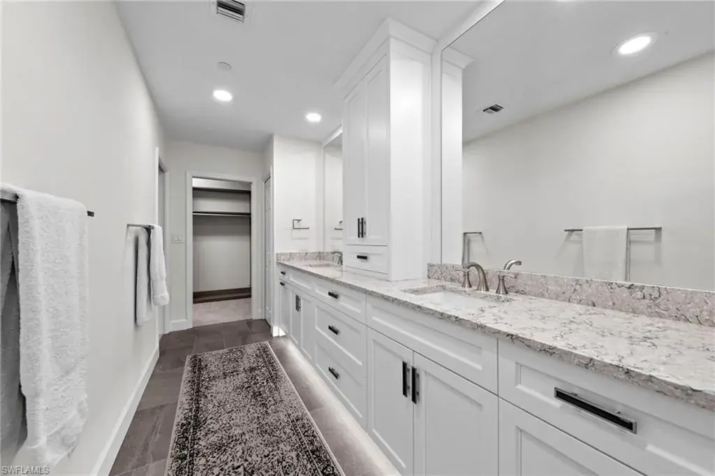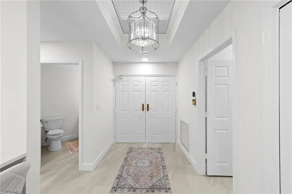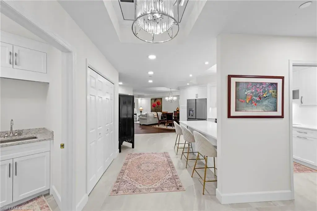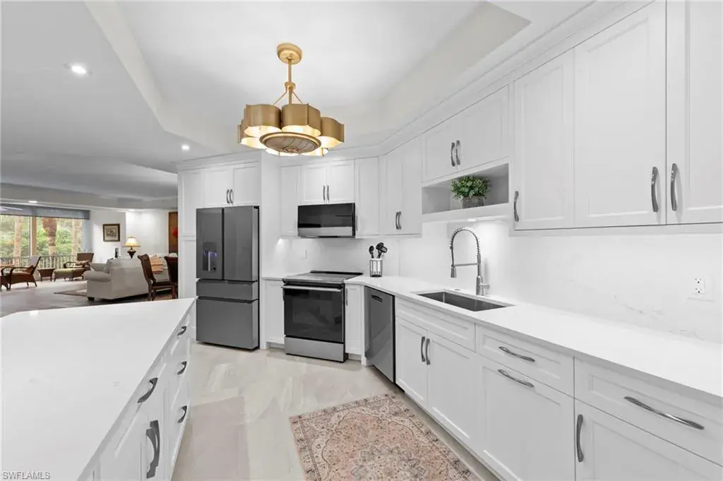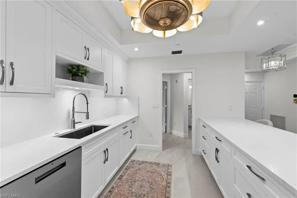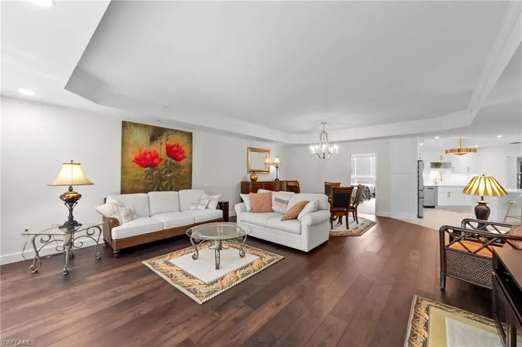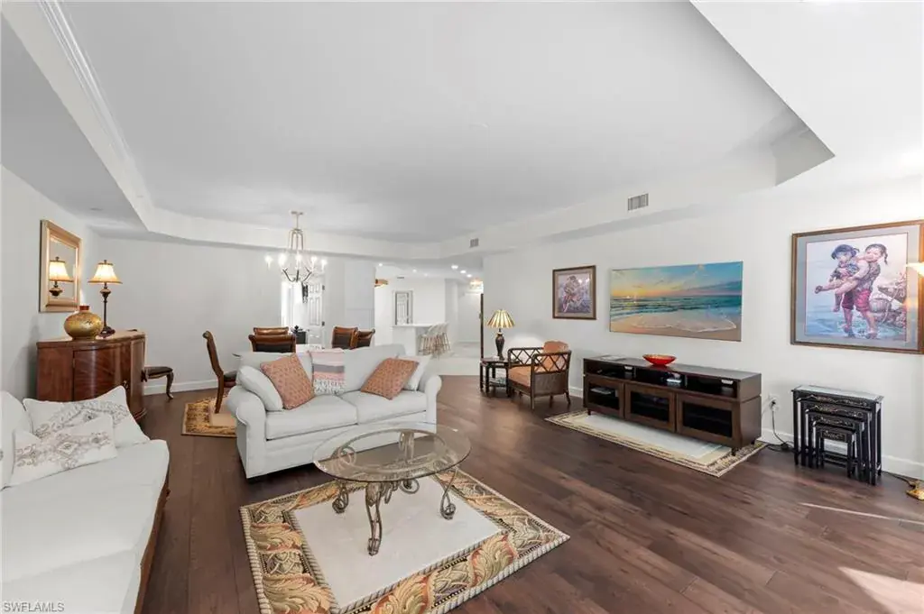 Welcome to this beautifully renovated condo at The Crescent in Pelican Bay, where modern upgrades meet the best of resort-style living in Naples. From the inviting entry you are drawn through the unit to the glass & screened enclosed sunroom offering tropical vistas over the garden areas and fairway. The redesigned kitchen shines with white cabinetry, quartz countertops, and premium stainless appliances, while new hardwood and tile floors flow seamlessly throughout. Expanded living areas with hurricane-rated doors add both space and security. The primary suite offers a relaxing retreat with a remodeled bath, quartz counters, updated shower and tub, and custom closets. Guests will feel right at home with spacious bedrooms, including one with its own ensuite.  Recent updates like new A/C and hot water heater (2023) keep the home efficient and worry-free. The Crescent offers its own clubhouse, pool, spa, and fitness center, plus all the Pelican Bay perks—private beach access with beachfront dining, tennis, miles of walking and biking paths, with canoes and kayaks for residents. Just minutes to Waterside Shops and Mercato. This is the perfect blend of comfort, convenience, and Florida lifestyle in one of Naples’ most sought-after communities. The Crescent in Pelican Bay received no damage from last 3 hurricanes and no water intrusion in garage.