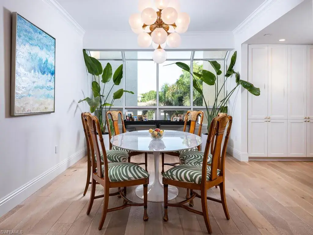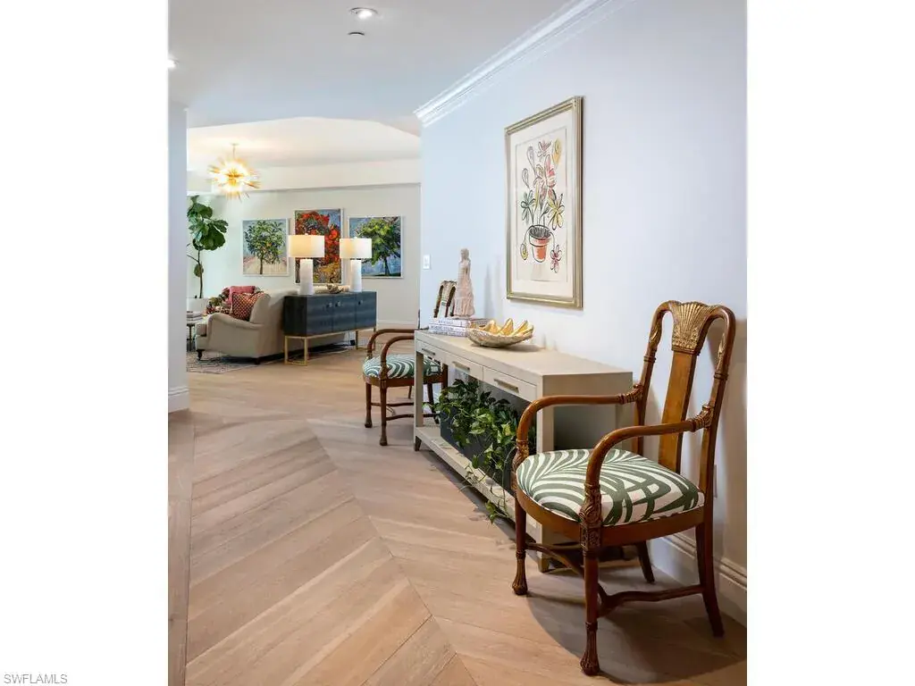 Welcome to this gracious 2-bedroom, 2 & 1/2-bath residence in the prestigious, gated Crescent community at Pelican Bay. Positioned with serene landscape views, the home offers a refined entry via a semi private elevator into a foyer with beautiful hardwood flooring that extends throughout extending into the kitchen, dining area, and powder room.