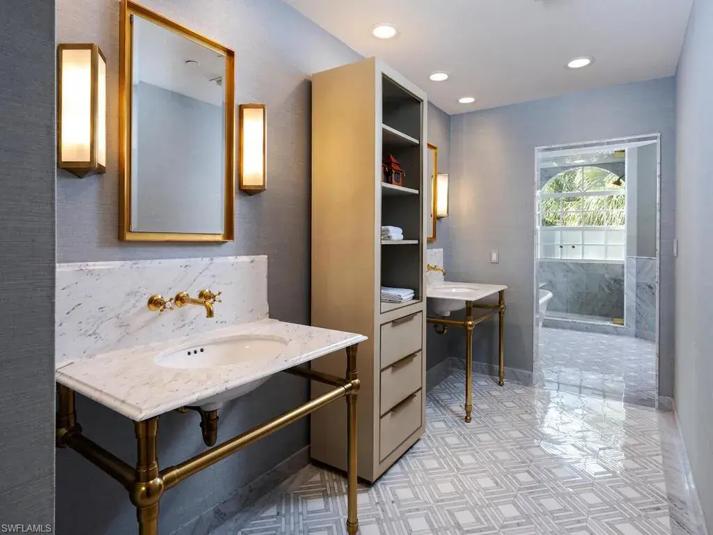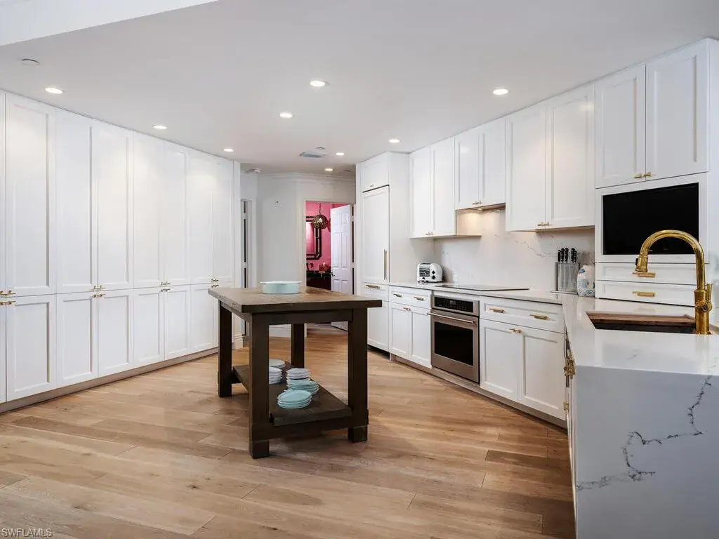 The primary suite includes dual vanities, separate tub and shower, and elevated finishes throughout. The kitchen features timeless cabinetry, high-end appliances, and a wall of built-in storage cabinets.