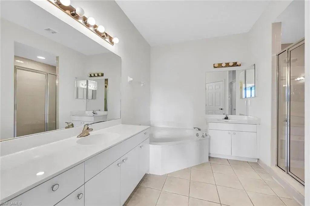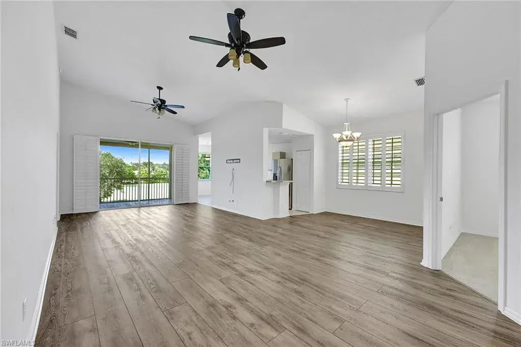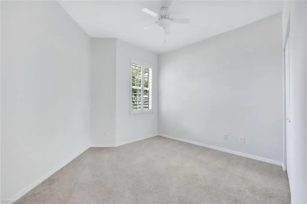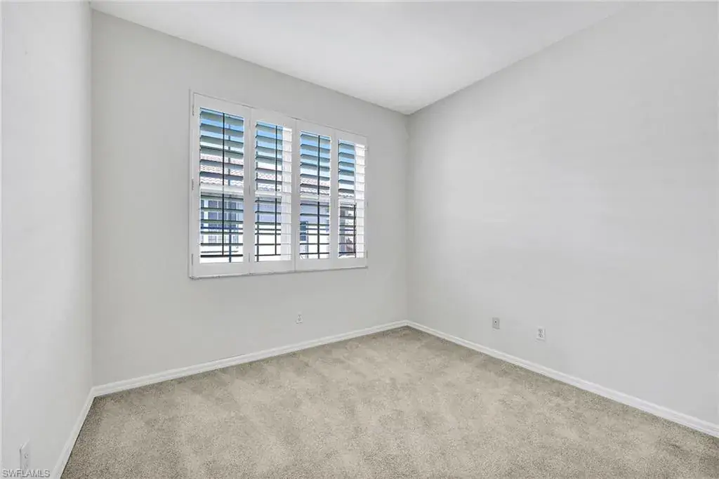 Welcome to this spacious second-floor coach home in the Crestview subdivision of Heritage Greens, ideally situated to offer lake and fairway views of the 10th hole at Arrowhead Golf Course. This spacious three-bedroom residence is designed for comfort and convenience, featuring a two-car attached garage with a new door, and 9-foot ceilings that create an open, airy feel throughout. The private lanai is equipped with electric storm shutters, providing peace of mind during storm season while offering a space to enjoy stunning western exposure sunsets. Inside, you will find numerous upgrades, including luxury vinyl flooring, plantation shutters throughout and freshly painted walls. The home also features impact-resistant slider windows, and a newer air-conditioning unit installed in 2025, ensuring comfort year-round. Heritage Greens is a gated community in the award-winning Arrowhead Golf Course, offering flexibility to either pay as you play or join a membership. Residents enjoy a wide range of amenities, including a clubhouse, fitness center, pools, a children’s playground, and tennis and basketball courts, ideal for all ages. The HOA dues cover basic cable, internet, and lawn and land maintenance, making it a low-maintenance lifestyle. In North Naples, this home is zoned for top-rated schools and is just minutes from shopping, dining and entertainment options, plus local beaches with resident parking.