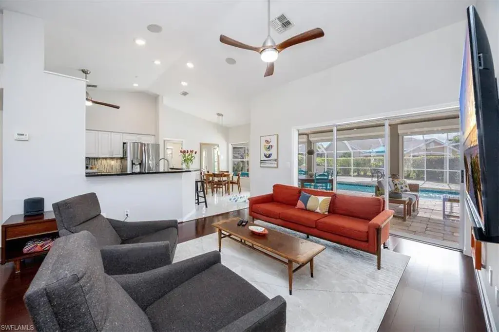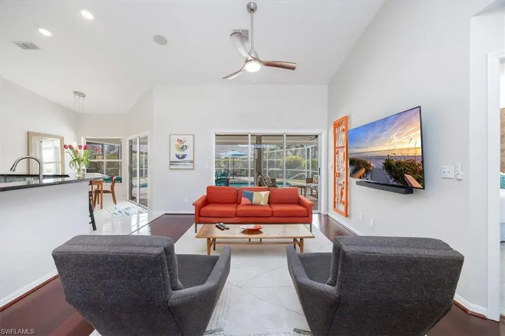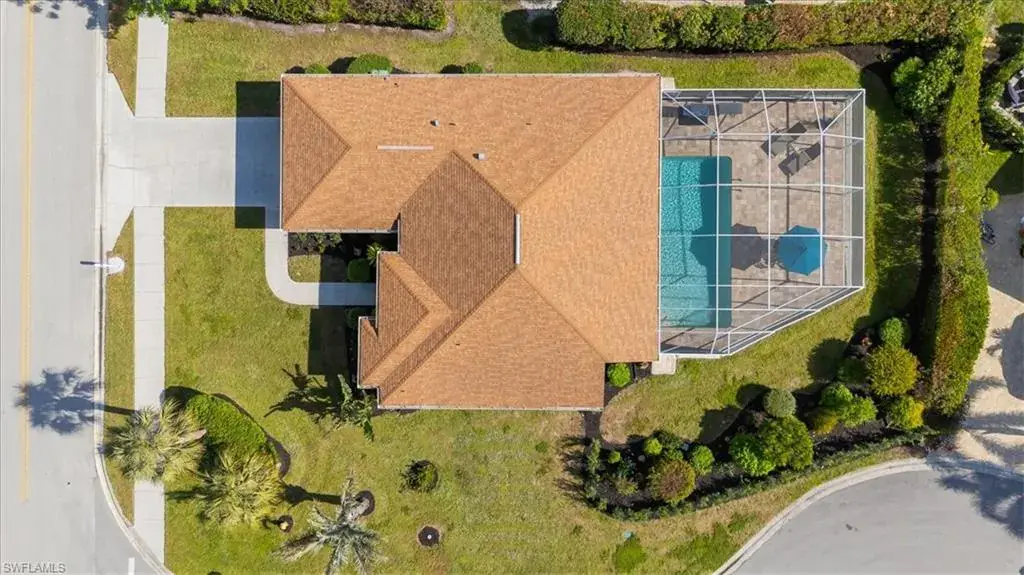Post Modern pool home. Large, spacious patio area beyond the pool. Great for fun gatherings and entertaining. The corner location offers privacy, sunny southwest exposure, well-established butterfly garden and perfect expanded areas for alfresco dining. Both bathrooms have been updated within the past year. Enjoy the coffee bar in the kitchen area and the pool views from most rooms in the house. Other upgrades include new carpeting in two bedrooms, gutter protection around the entire home, electric shutters on the lanai, storm protection on all windows and epoxy garage flooring. This is an ideal opportunity or a VRBO as 52 weekly rentals are allowed in the neighborhood.