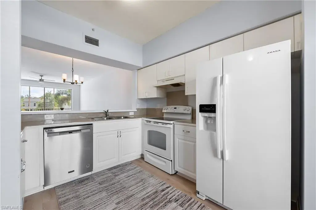 Welcome to your slice of paradise in Naples! This beautifully maintained 2-bedroom, 2-bath condo offers comfortable coastal living just over 3 miles from the Gulf beaches. The light-filled open floor plan features a spacious great room, well-appointed kitchen, and private screened lanai, with lake and pool views Perfect for morning coffee or evening sunsets. The following were all done in 2025, flooring, spray create on lanai, primary toilet, blinds, fridge, dishwasher, kitchen countertop, painted and new lower cabinets in the kitchen. Enjoy the convenience of a covered carport, in-unit laundry, and access to community amenities. Ideal as a year-round residence, vacation retreat, or investment property—all within minutes of shopping, dining, and Naples’ white-sand beaches.
