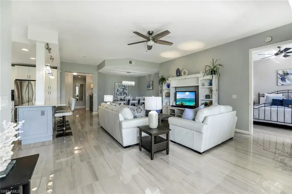 Fresh, bright, and modern, updated with renovated open floor plan, this furnished 3 bed, 2 bath end unit overlooking the beautifully maintained evergreen golf course awaits! Coveted southwest exposure delivers natural light all day and beautiful sunsets. Enjoy the lush landscaped surroundings of this first floor coach home with attached 2 car garage in Deer Crossing, with recently redone outdoor lighting, roofs, lanai screens and exterior paint offering peace of mind and ease of ownership. Serene grey and white tile floor, new kitchen with a fabulous large quartz topped island, super unique art glass pendant lighting, completely opened up to the spacious living and dining room, featuring all new cabinets and appliances, under cabinet lighting, shades of water blue glass tile backsplash, large stainless sink, new pantry with pull out shelves, and integrated trash pull out. New HVAC system installed in 2022. All new beautifully tiled primary bath shower, dual sinks with new quartz counters, lighting, and fixtures complete the cohesive design. 2 guest rooms, situated away from the primary suite, offers privacy your friends and family will enjoy. Rarely seen oversized guest closets and 2 primary closets, offer extraordinary storage, making this home a pleasure to reside, either seasonally or year round. Bike or walk to the amenity rich Fiddler’s Creek Club and Spa, the heart of the community, the updated 54,000 sq ft home to the state of the art gym with new equipment, yoga studio, pilates room, 2 resort pools with waterfalls and slides, 2 restaurants, spa services, fitness classes, full time activity staff providing special events and classes year round, tennis, pickle ball and bocce ball. Miles of sidewalks, all underground utilities, meticulously maintained landscaping, modern coastal designed future building, plus the overall design of the community sets Fiddler’s Creek apart from all others and is a gem of south Naples. CDD Debt Paid in full!! As if this wasn’t enough, there is also an optional beach and/or marina membership available, an extremely rare opportunity to enjoy the beach club at the Marco Beach Ocean Resort and the Marina on Isles of Capri. If you are a golfer, you are in the right place! The Golf Club at Fiddler’s Creek just re-opened with a total turf renovation, re-designed Arthur Hills greens, amazing practice facility anchored by the brand new spectacular private golf clubhouse. Equity memberships are currently available with no waiting list. Fiddler’s Creek is minutes away from the gorgeous white sand beaches of Marco Island and world famous 5th Avenue of Downtown Naples! Don’t miss seeing this special home, in this very special community!!