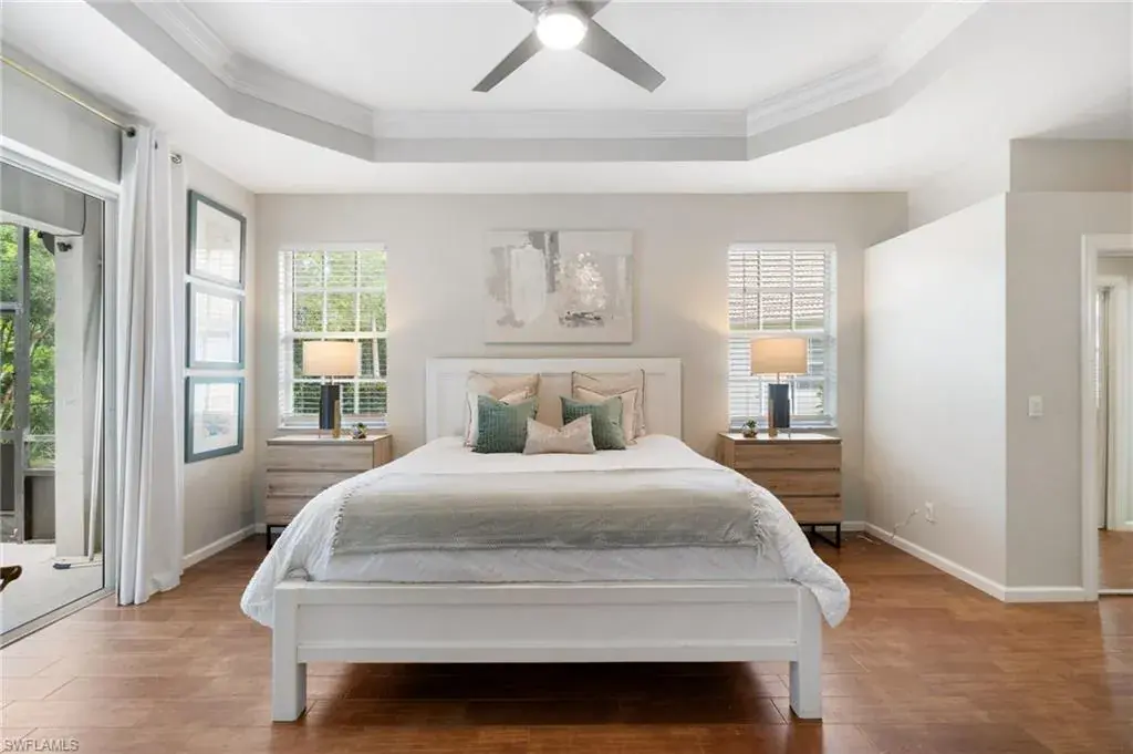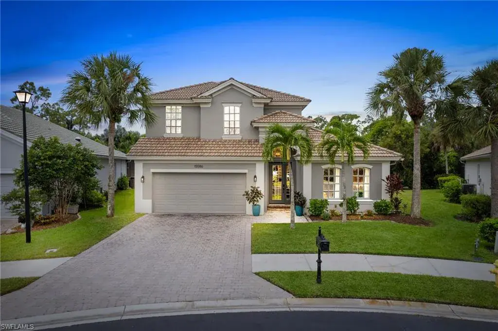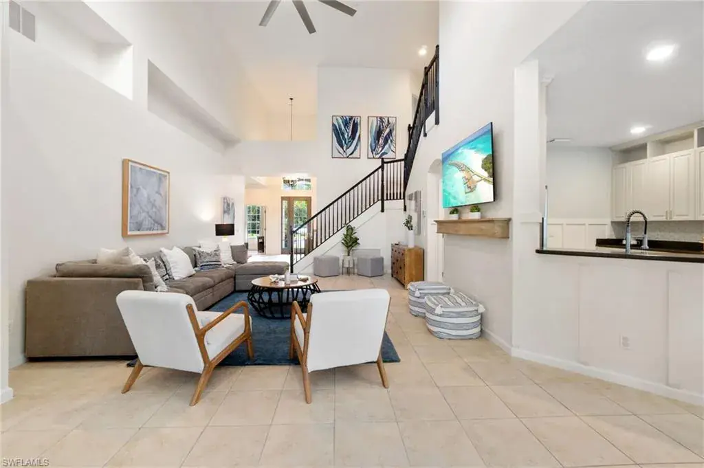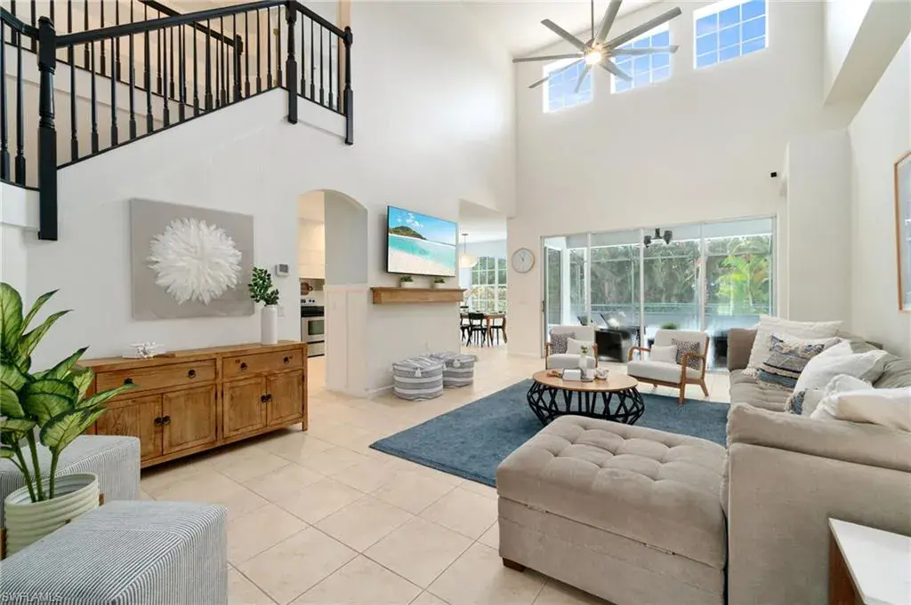 Located in the securely gated and amenity rich community of Delasol in Naples, this exquisite 5-bedroom, 2.5-bath pool home offers unparalleled privacy and tranquility. Set at the end of a quiet cul-de-sac, the home welcomes you with soaring volume ceilings, a sweeping open staircase that creates a grand first impression, and an open floor plan drenched in natural light that begs you to stay a while. The 1st-floor master bedroom is a serene retreat, complete with a spacious ensuite bathroom with dual vanities and his-and-her closets for ample storage.