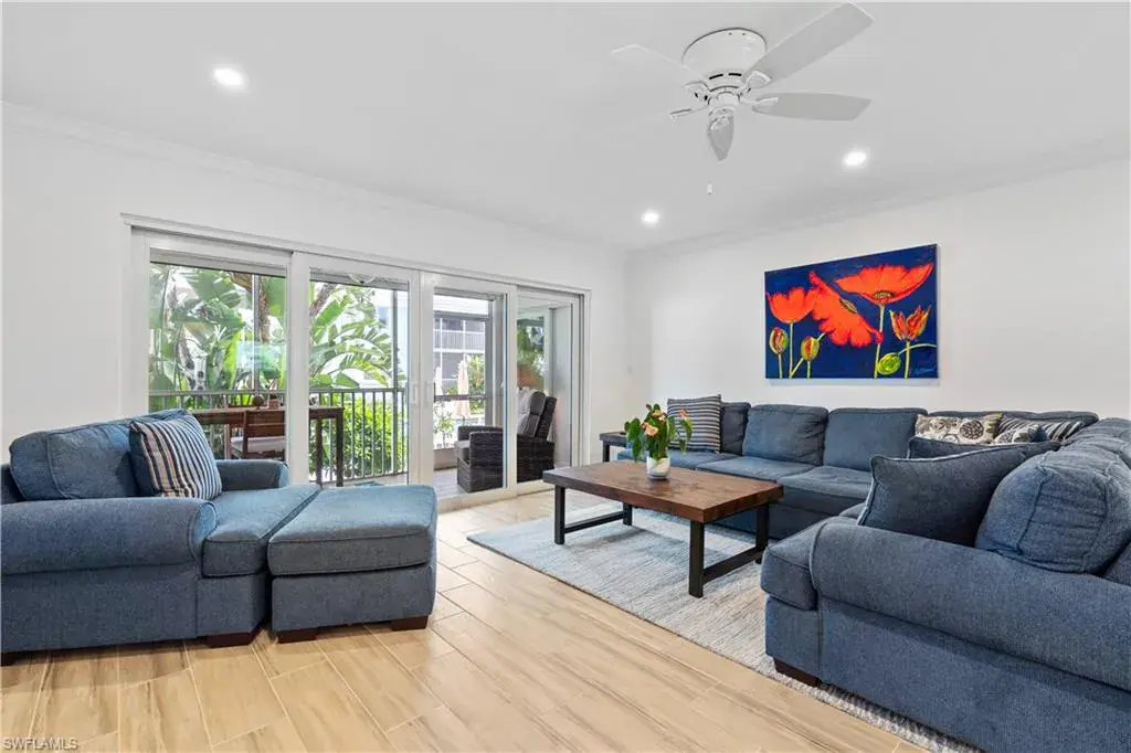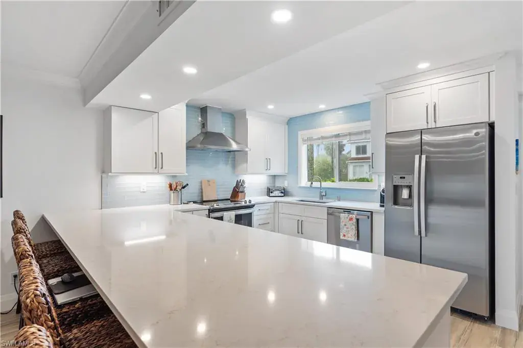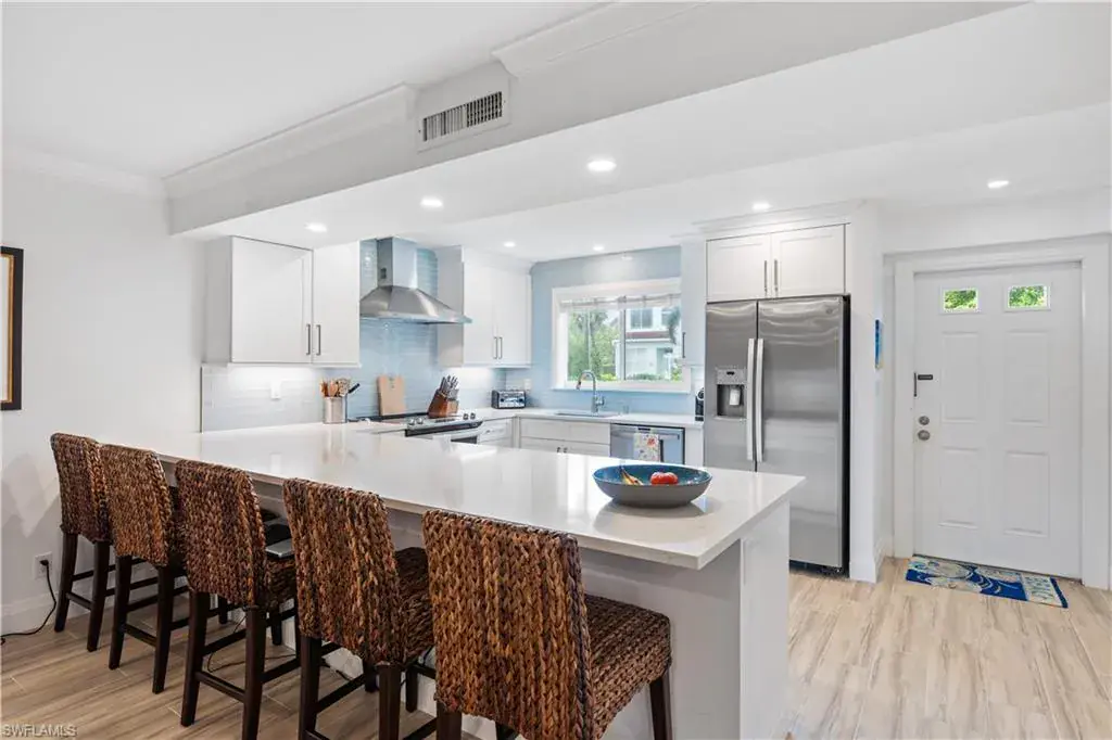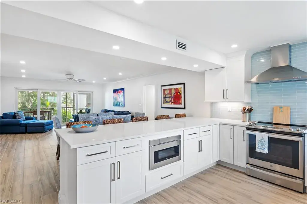 Welcome to this high and dry, beautifully remodeled, 3-bedroom condo being offered fully furnished! With 1,640 square feet of living space, this open-concept condo is ideal for entertaining. The elegant kitchen features a large island with quartz countertops, newer stainless steel appliances—including a range with a hood and built-in microwave—ensuring both style and functionality.