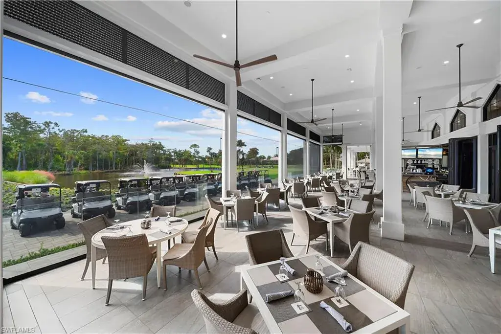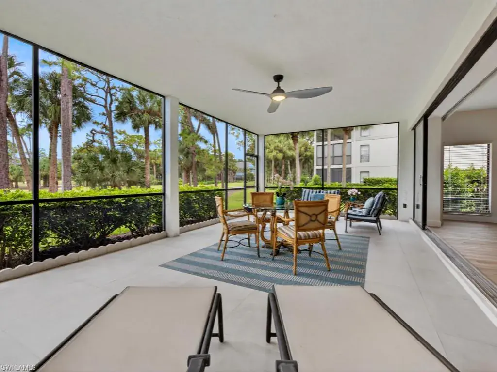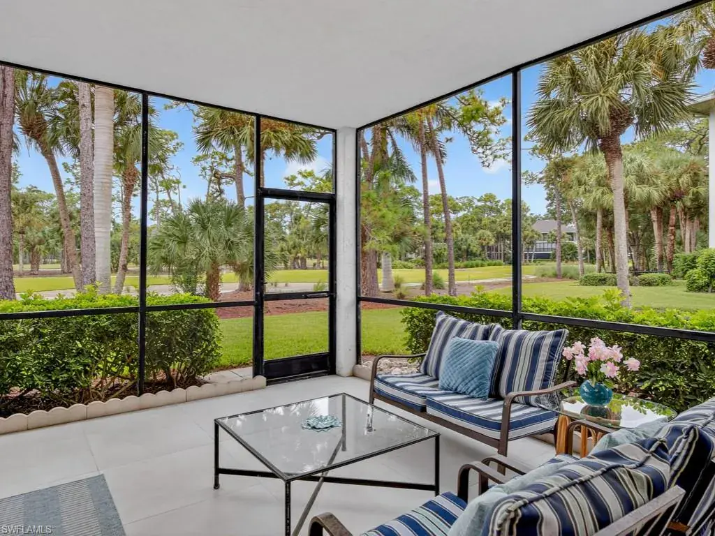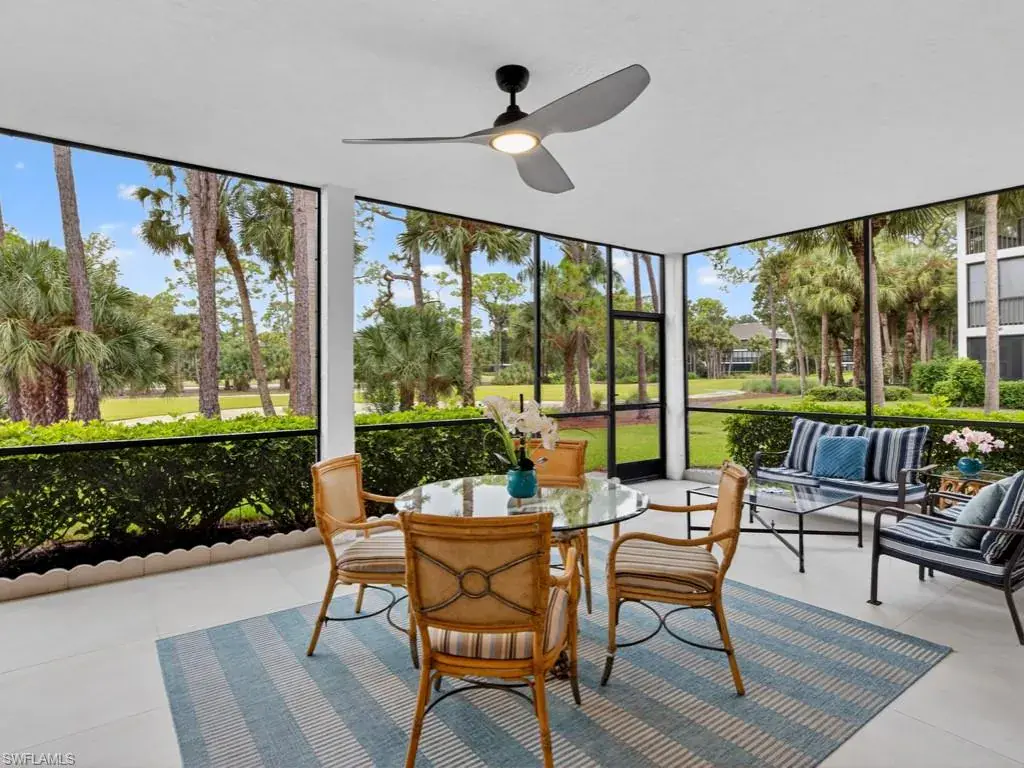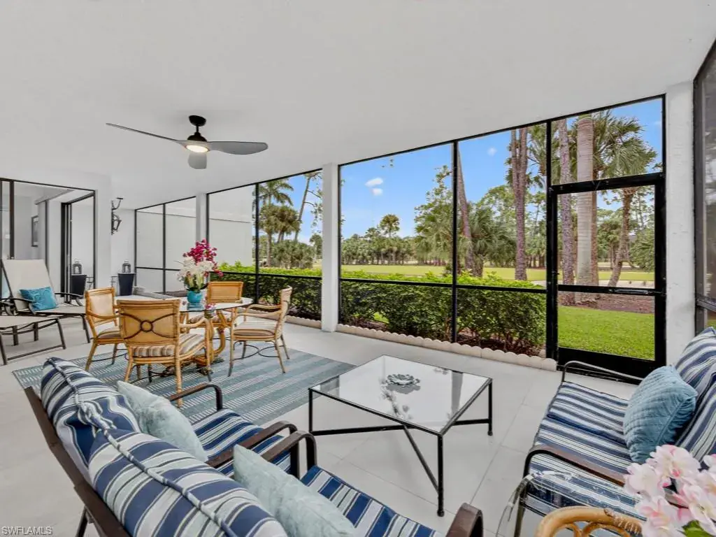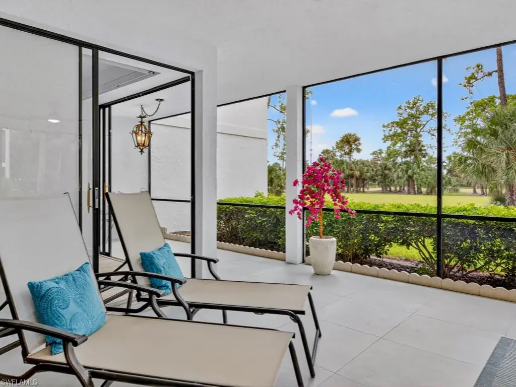 Experience the best of Naples living in this 3 BR, 3 BA (all en-suite) residence in Eagle Creek Golf & Country Club. Nearly 2,000 SF of open living blends effortless style with everyday comfort—lives like a single-family home. Thoughtfully renovated with quality finishes, stylish furnishings, and updated systems throughout. Primary suite and second master suite feature custom closets, designer walk-in showers showcasing custom glass and mosaic stone, DBL sinks, quartz tops. The third bedroom—a sun-filled guest suite—includes a gorgeous designer bathroom highlighting Merola porcelain floor tile and tub. A fabulous gourmet kitchen shines with quartz countertops, imported aqua tile backsplash, and stainless appliances, while a custom wet bar with Brazilian granite and dual-zone beverage fridge elevates entertaining. Step out to an expansive 500 sf screened lanai showcasing a 20-ft opening with brand-new, storm impact sliders (California-style), 30 x 30 Arctic-white porcelain tile, all-new screening—framing spectacular golf-course views of the coveted 4th hole. Additional highlights: newer A/C, designer lighting & hardware, abundant storage (separate outdoor storage), and covered parking. Enjoy resort-style amenities—NEW clubhouse for dining & entertainment, pickleball, tennis, bocce, pool, fitness center, and yoga studio—minutes to Naples beaches, Olde Naples, and Marco Island. Social or Golf Membership required.