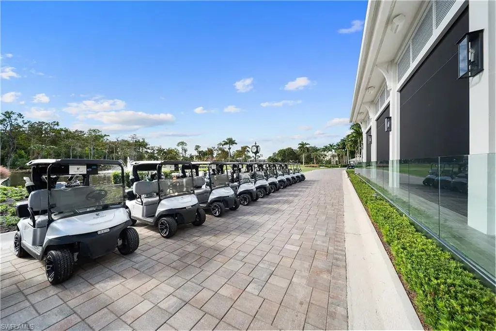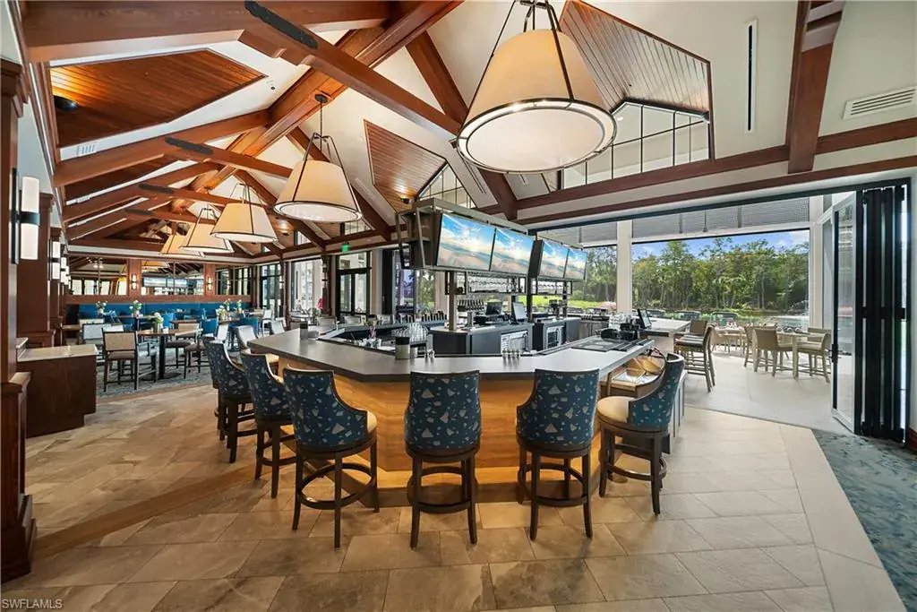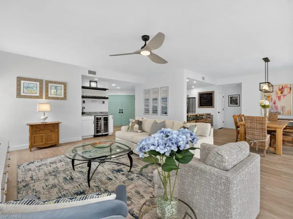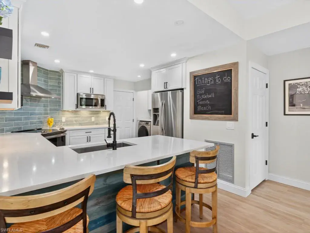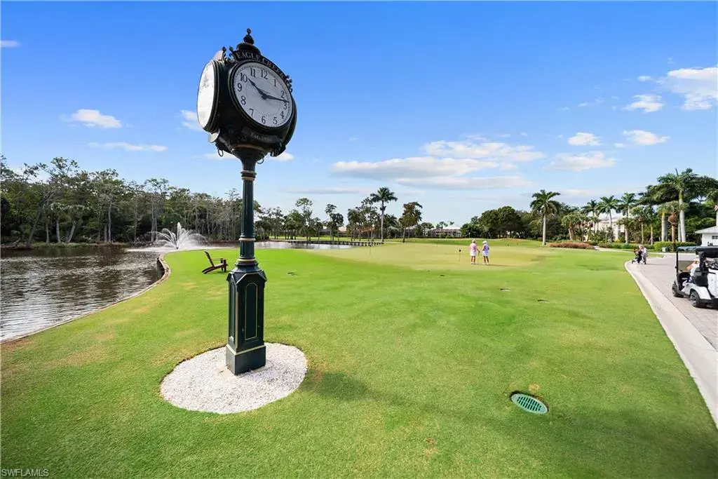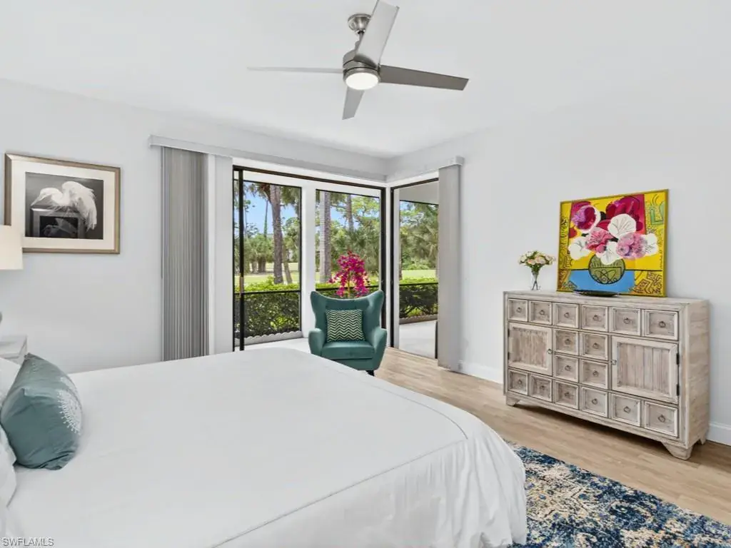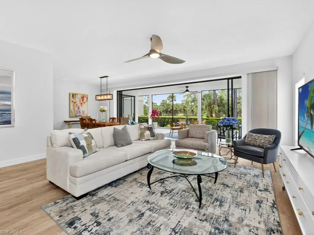 Experience the best of Naples living in this 3 BR, 3 BA (all en-suite) residence in Eagle Creek Golf & Country Club. Nearly 2,000 SF of open living blends effortless style with everyday comfort—lives like a single-family home. Thoughtfully renovated with quality finishes, stylish furnishings, and updated systems throughout. Primary suite and second master suite feature custom closets, designer walk-in showers showcasing custom glass and mosaic stone, DBL sinks, quartz tops. The third bedroom—a sun-filled guest suite—includes a gorgeous designer bathroom highlighting Merola porcelain floor tile and tub. A fabulous gourmet kitchen shines with quartz countertops, imported aqua tile backsplash, and stainless appliances, while a custom wet bar with Brazilian granite and dual-zone beverage fridge elevates entertaining. Step out to an expansive 500 sf screened lanai showcasing a 20-ft opening with brand-new, storm impact sliders (California-style), 30 x 30 Arctic-white porcelain tile, all-new screening—framing spectacular golf-course views of the coveted 4th hole. Additional highlights: newer A/C, designer lighting & hardware, abundant storage (separate outdoor storage), and covered parking. Enjoy resort-style amenities—NEW clubhouse for dining & entertainment, pickleball, tennis, bocce, pool, fitness center, and yoga studio—minutes to Naples beaches, Olde Naples, and Marco Island. Social or Golf Membership required.