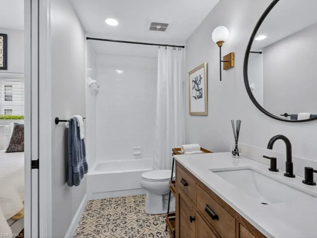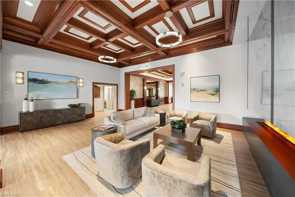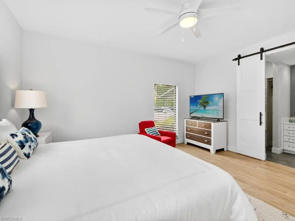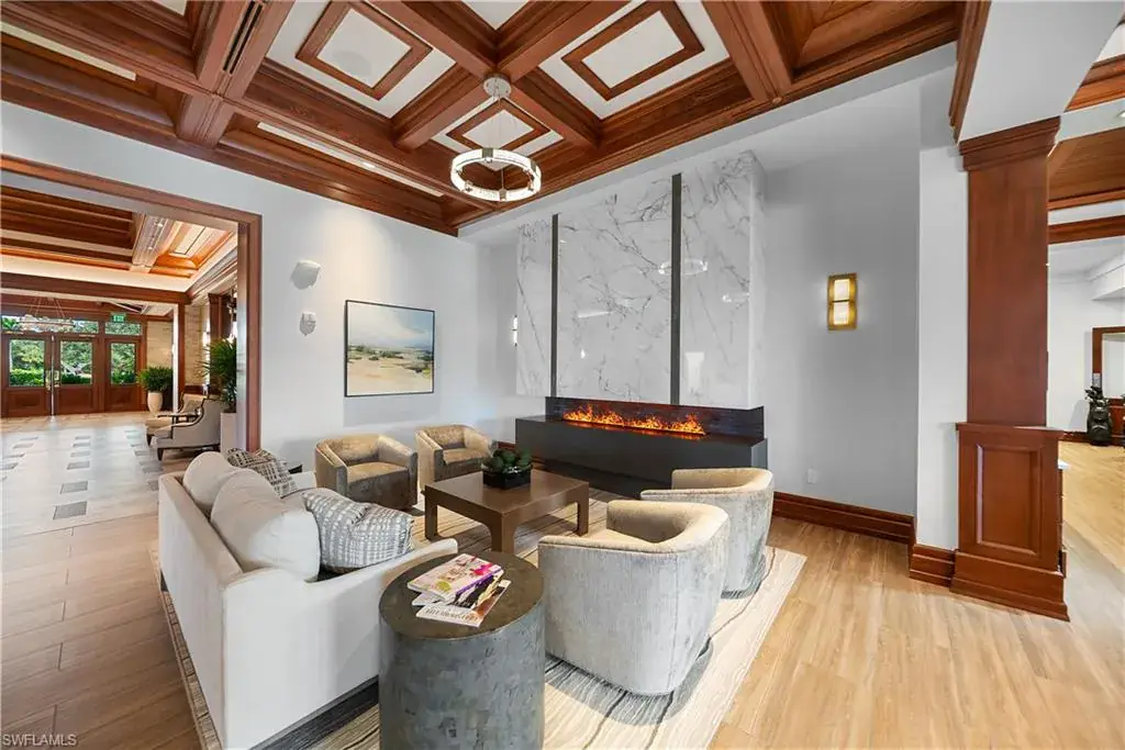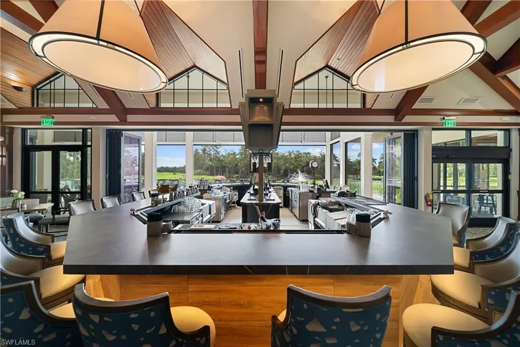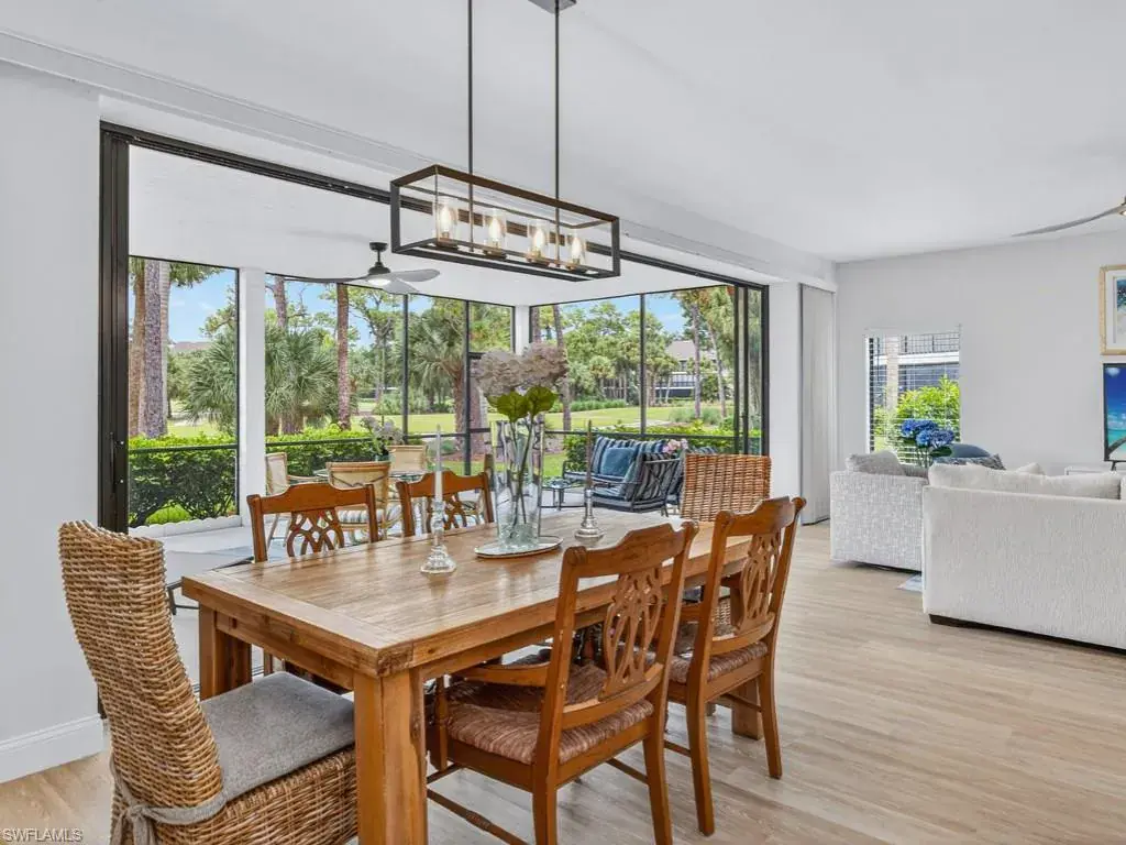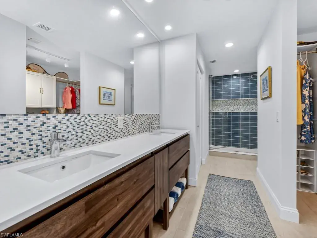 Experience the best of Naples living in this 3 BR, 3 BA (all en-suite) residence in Eagle Creek Golf & Country Club. Nearly 2,000 SF of open living blends effortless style with everyday comfort—lives like a single-family home. Thoughtfully renovated with quality finishes, stylish furnishings, and updated systems throughout. Primary suite and second master suite feature custom closets, designer walk-in showers showcasing custom glass and mosaic stone, DBL sinks, quartz tops. The third bedroom—a sun-filled guest suite—includes a gorgeous designer bathroom highlighting Merola porcelain floor tile and tub. A fabulous gourmet kitchen shines with quartz countertops, imported aqua tile backsplash, and stainless appliances, while a custom wet bar with Brazilian granite and dual-zone beverage fridge elevates entertaining. Step out to an expansive 500 sf screened lanai showcasing a 20-ft opening with brand-new, storm impact sliders (California-style), 30 x 30 Arctic-white porcelain tile, all-new screening—framing spectacular golf-course views of the coveted 4th hole. Additional highlights: newer A/C, designer lighting & hardware, abundant storage (separate outdoor storage), and covered parking. Enjoy resort-style amenities—NEW clubhouse for dining & entertainment, pickleball, tennis, bocce, pool, fitness center, and yoga studio—minutes to Naples beaches, Olde Naples, and Marco Island. Social or Golf Membership required.