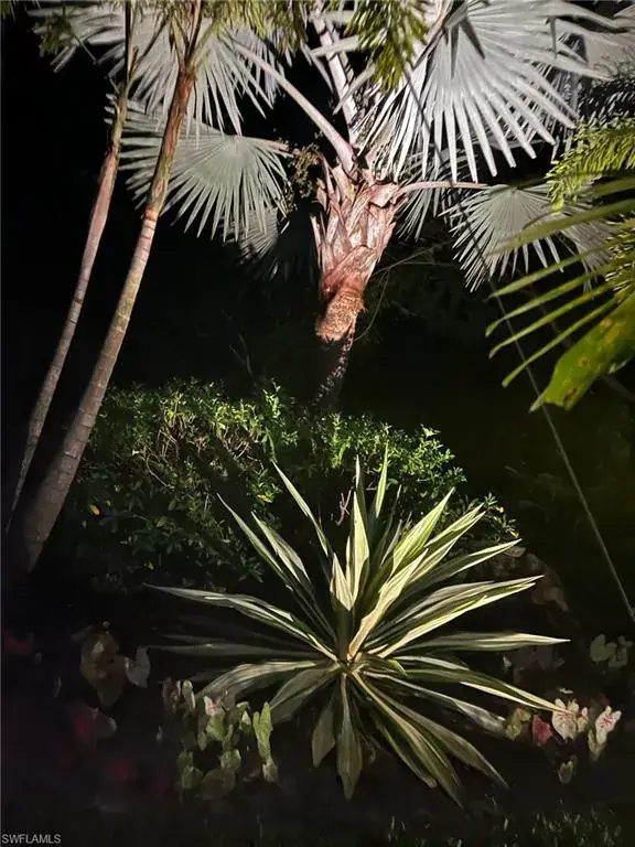 The primary bath features a dual vanity with elegant granite countertops and mirrored medicine cabinets. All closets are customized by California Closets for optimal organization. Step outside to a private backyard oasis with lush tropical landscaping featuring a variety of palm trees, vibrant crotons, and striking agave plants, creating a serene and picturesque setting around the screened-in pool and lanai.