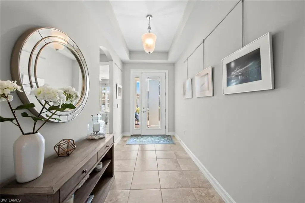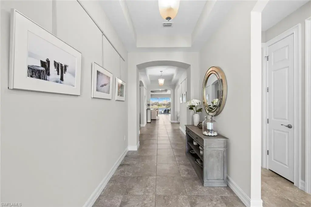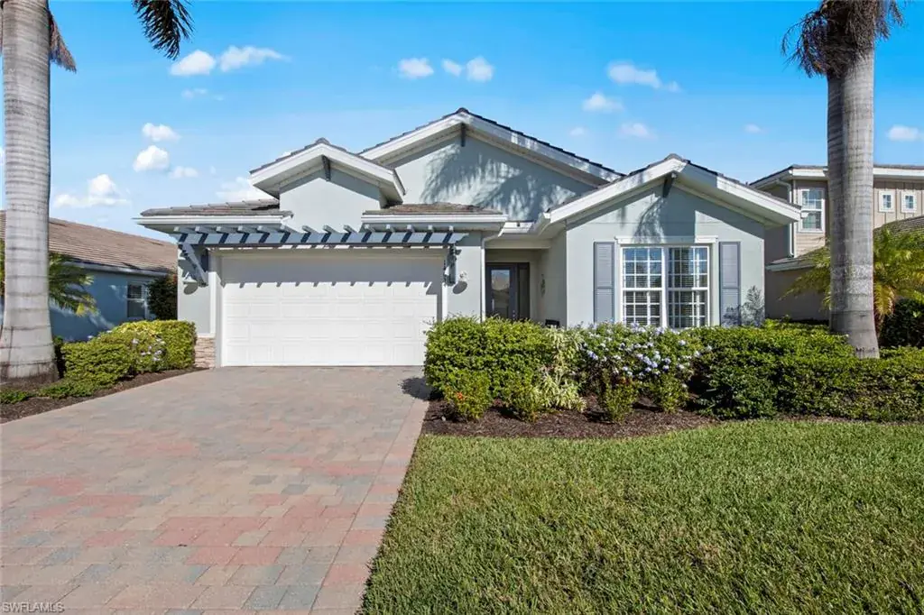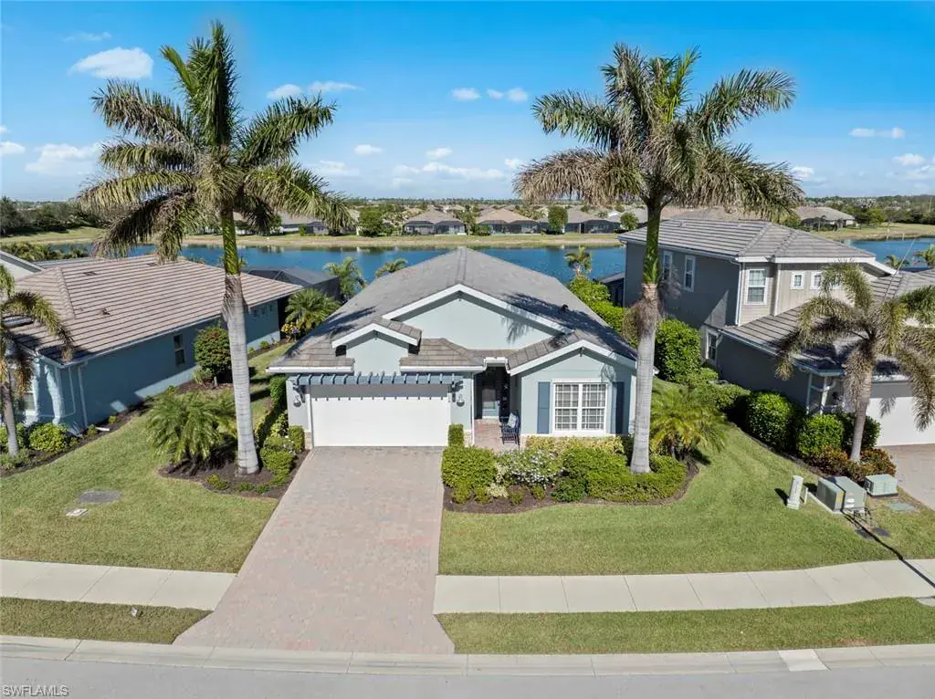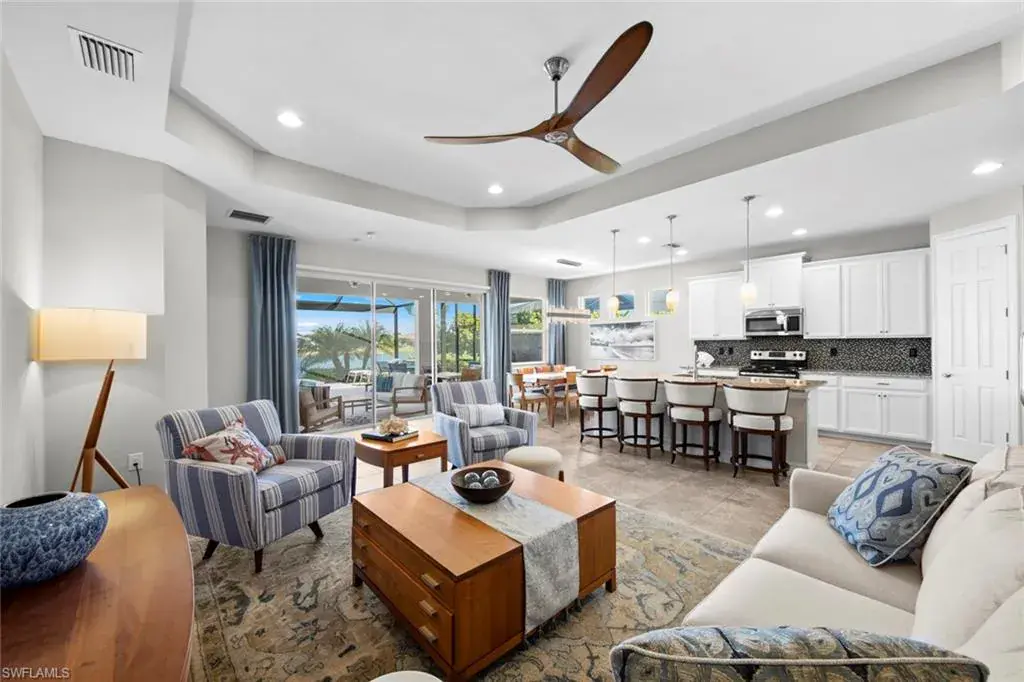WATERFRONT LOT with wide water views. OPEN FLOOR PLAN with lake view in Naples Reserve, 4 beds+den, 3.5 baths, entertaining lanai, 2-car garage w/ELECTRIC CAR CHARGER & MINI-SPLIT AC. Enjoy privacy in the HEATED SALT WATER POOL, with lighting, auto-fill & picture frame NO-SEE-UM SCREEN cage featuring lake views. ELECTRIC HURRICANE SCREENS on the lanai. OUTDOOR KITCHEN with built-in gas grill, side burner, frig, & sink. POOL BATH. Many details – NEST thermostat, CAMERA security system, TILE floors, upgraded lighting, CUSTOM IMPACT GLASS FRONT DOOR, TRAY CEILINGS, glass French doors & ceiling fans. Great room with TRAY CEILING, tile floor & ROTATING FRAME TV. Kitchen with SS appliances, granite counters, under cabinet lighting, breakfast bar & walk-in pantry. Large primary bedroom TRAY CEILING, MOUNTED TV, ceiling fan/light & bathroom w/double sinks, AUTOMATED WINDOW BLIND, SOAKING TUB, walk-in tile shower, water closet & walk-in closet. Laundry with linen closet, washer/dryer, CUSTOM CABINETRY & LAUNDRY SINK. WIFI HOME/POOL AUTOMATION. TRANSFERRABLE FLOOD INSURANCE POLICY in place. Amenities include guarded gate, resort style pool & lap pool, cafe, tiki bar, beach, dog parks, playground, bocce ball, fitness center, Tennis, pickle ball, bike/walking trails, 1-mile rowing lane, etc. Low HOA fees!