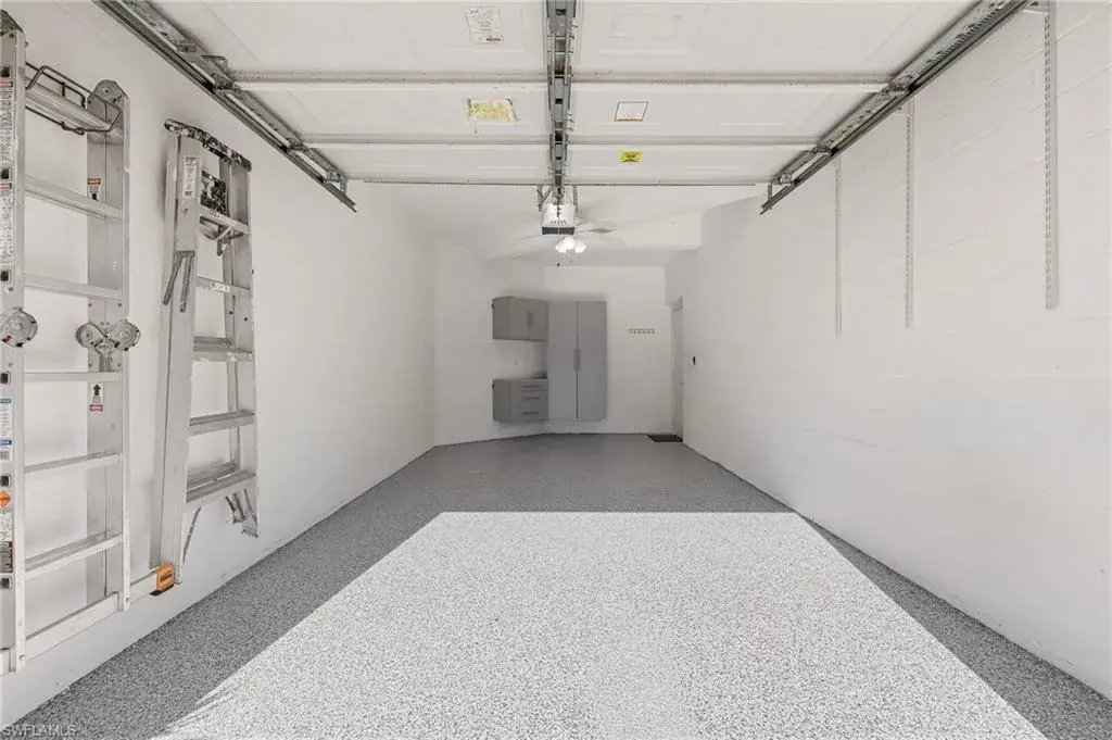Additional interior highlights include crown molding, plantation shutters, stylish lighting, and ten-foot ceilings, enhancing the home’s spacious and inviting feel. The private one-car attached garage features epoxy flooring and built-in storage cabinets for added convenience.
