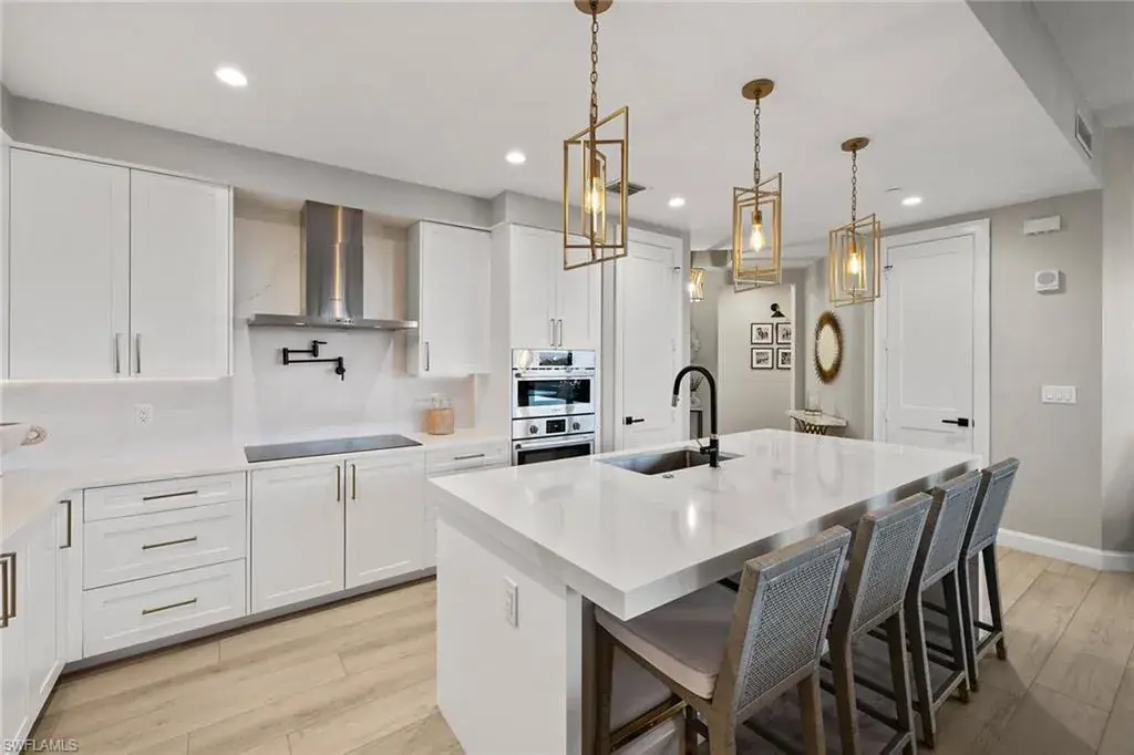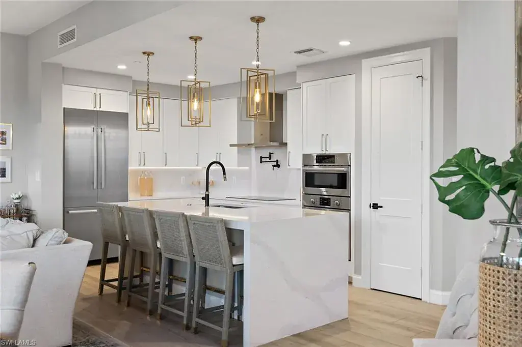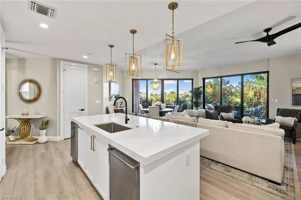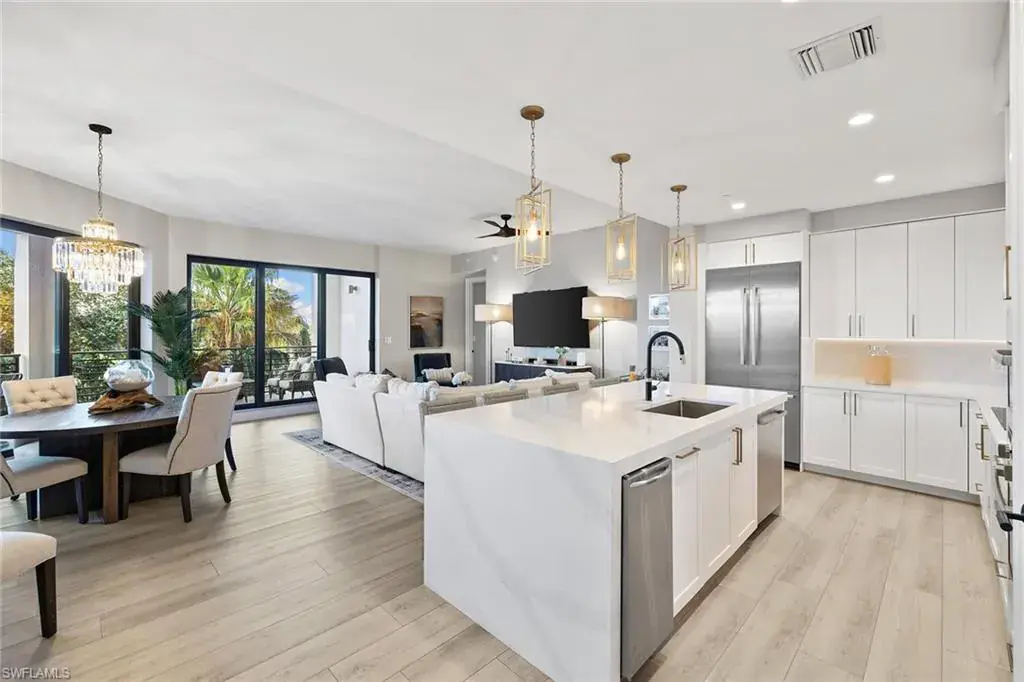 Stunning Eleven Eleven Central corner fourth-floor residence with spacious open floor plan boasting a large great room, open kitchen with quartz island, three bedrooms, 3.5 baths plus a large laundry room. Desired Fifth Avenue plan with 10-foot ceilings and large west-facing wraparound balcony. Professionally decorated with upgraded finish selections, added designer lighting, wall coverings and custom closets. Unrivaled resort-style amenities include a lap pool with beach entry, fire pits, cabana bar, gas grills, two hot tubs, bocce ball, courtyard park with putting green, fenced-in dog park, guest suites, social room with catering kitchen, theater and fitness center. Prime downtown/Old Naples location adjacent to new dining/entertainment options, across from Baker Park and just blocks from 5th Avenue, beach access and more. One under-building garage space and climate-controlled storage included.