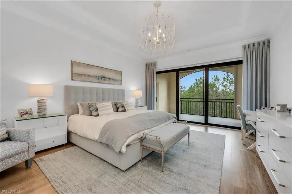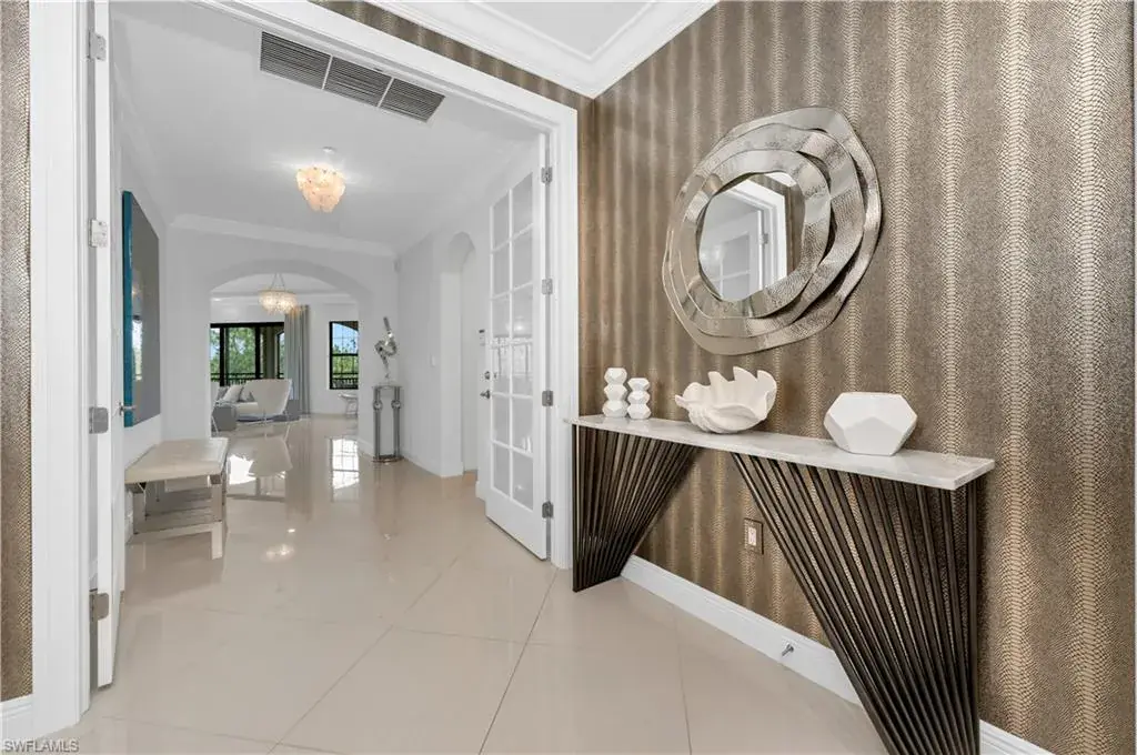 Esperanza at Tiburón – Professionally-Decorated Turnkey-Furnished Top-Floor Luxury Residence with Golf Membership Immediately Available. Experience refined Naples living in this beautifully updated and Clive Daniel-decorated penthouse-level residence in the sought-after Esperanza at Tiburón, home to the Ritz-Carlton Golf Resort and two Greg Norman–designed championship golf courses. This immaculate three-bedroom, three-and-a-half-bath end unit combines sophisticated design with serene privacy—no units above and panoramic preserve views that provide tranquility from sunrise to sunset. An inviting open-concept great room features soaring ceilings, custom millwork, high-end artwork and designer finishes throughout. The chef’s kitchen offers white cabinetry, matching quartz countertops, high-end appliances, and a spacious island perfect for casual dining or entertaining. A formal dining area flows seamlessly to the expansive screened lanai, an ideal retreat for morning coffee or relaxing evenings surrounded by a lush tropical backdrop. The primary suite serves as a private sanctuary with lanai access, a large custom-fitted walk-in closet, and a spa-inspired bath with dual vanities, soaking tub, and frameless glass shower. Two guest suites, each with its own ensuite bath and walk-in closet, ensure comfort and privacy, while the den with a private balcony provides flexible space for work or relaxation. Additional highlights include wood and tile flooring, designer lighting, plantation shutters, a private elevator that opens directly into the residence, and hurricane protection provided by impact glass windows and doors, as well as storm screens out on the patio. Under building garage with two assigned parking spaces and private storage room provide convenience and security. Offered turnkey furnished, the home showcases a curated collection of high-end pieces balancing sophistication and coastal warmth—move right in and enjoy the Tiburón lifestyle. Residents of Esperanza enjoy resort-style amenities including a tropical pool and spa, grilling area, and private clubhouse. Optional Tiburón Golf Club memberships provide access to 36 holes of world-class golf, tennis, fitness center with personal trainers, spa services, concierge, and dining. Owners also enjoy privileges at both Ritz-Carlton resorts and a private shuttle to the beach with chairs, umbrellas, and towels provided. Ideally located in North Naples, just minutes from Mercato, Waterside Shops, white-sand beaches, and downtown Naples, this top-floor corner residence offers exceptional natural light, breathtaking preserve vistas, and a rare sense of single-family privacy within one of Naples’ premier resort communities. Lives like a single-family home – penthouse privacy, resort amenities, and timeless elegance in the heart of Tiburón.