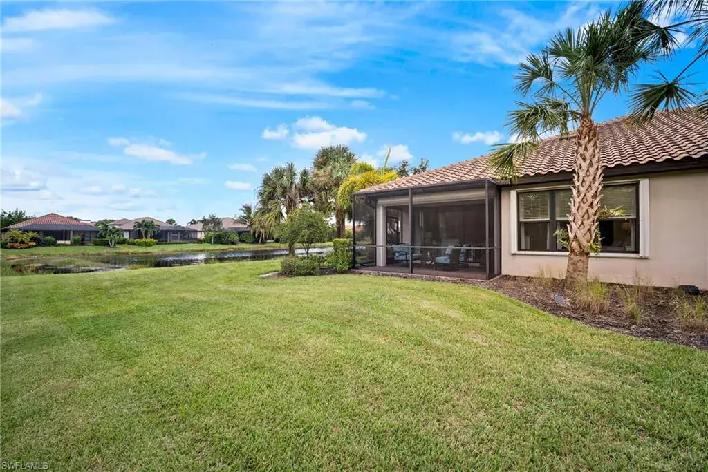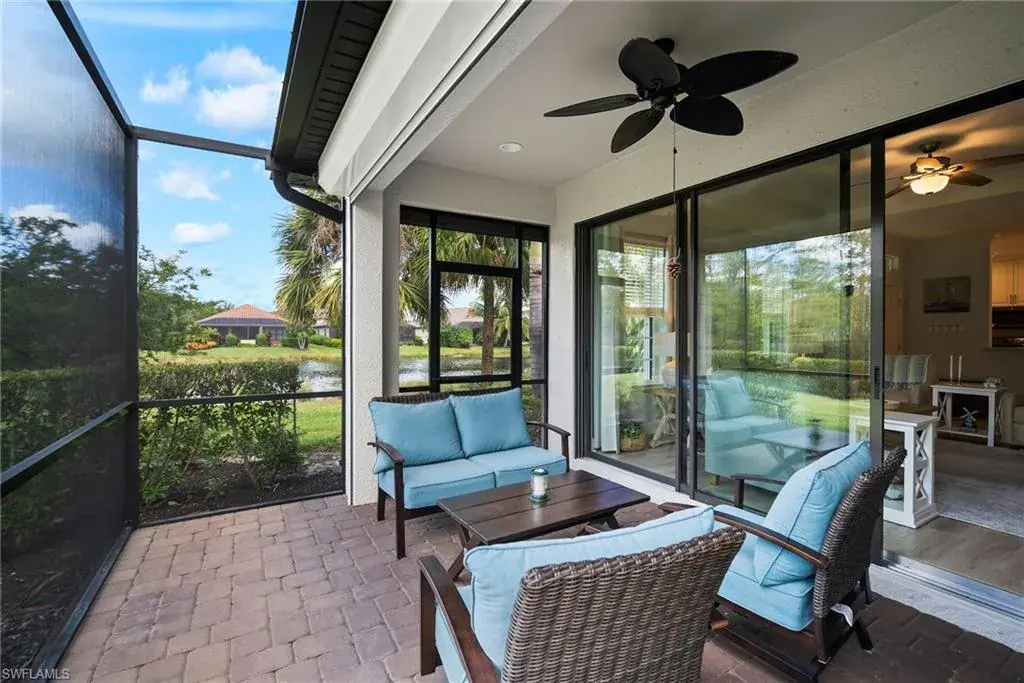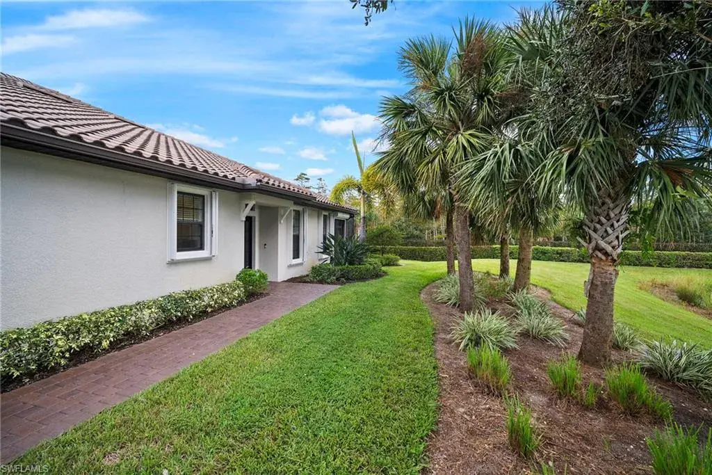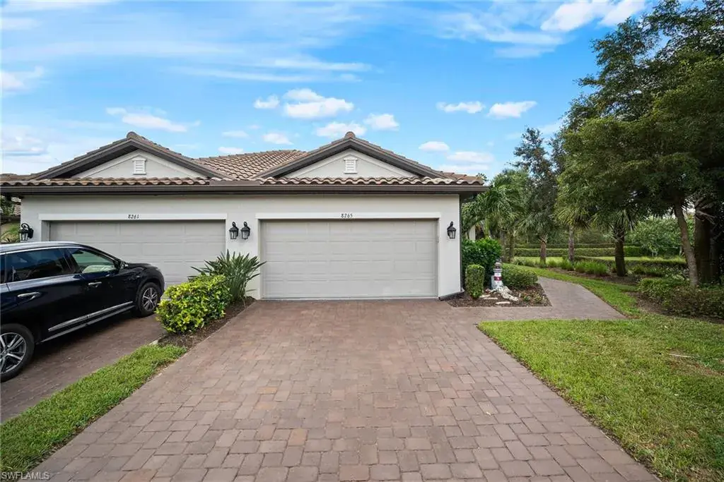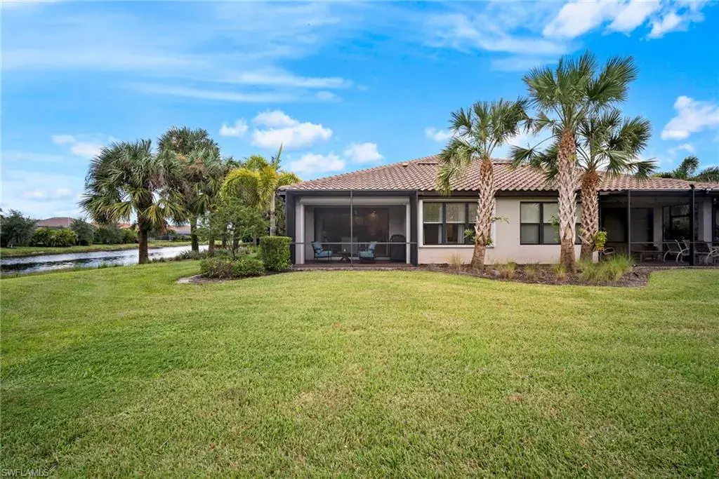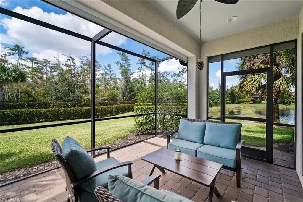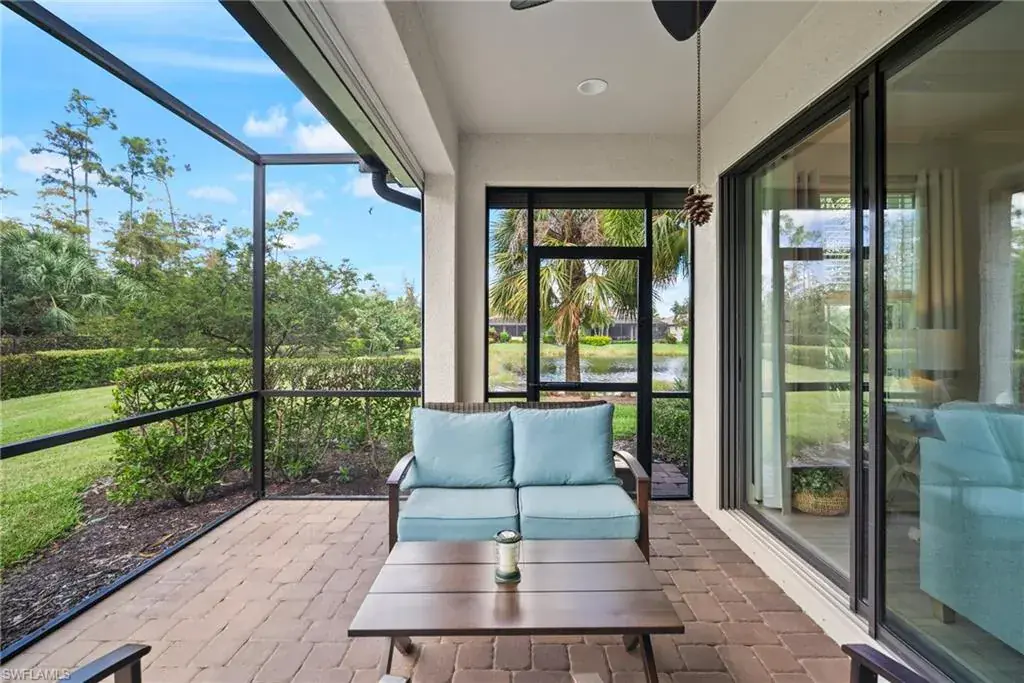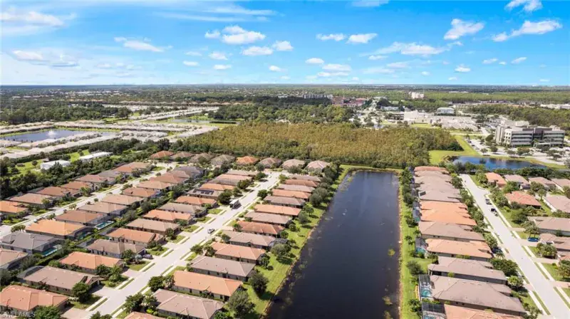 This 2/2 plus den twin villa located in a very desirable Naples location offers a well designed floor plan with optimal living space within its 1533 sq. ft. The seamless flow from the gathering room, dining room and kitchen creates a perfect open and airy living area with volume and tray ceilings enhanced by crown moulding and 8 ft doors. Enjoy nature and tranquility with water views offering a beautiful Florida landscape from your spacious paved and screened lanai. There’s a natural gas hookup for the gas grill for your ease and convenience. This home provides beautiful carefree luxury vinyl flooring throughout with neutral 18” tile in bath and laundry areas. The kitchen provides white wood cabinets which include upgrades of four deep drawers for ease and organization as well as a pantry for additional items and storage. White herringbone tile with white and gray quartz countertops, upgraded fingerprint-less appliances with a gas range and oven are a chef’s delight. The floor plan is designed to provide privacy between the master bedroom ensuite with walk-in closet from the den and second ensuite bedroom with ample closet space. The den with pocket doors can be utilized as a third sleeping area or multifunctional room. For your protection there are electric shutters on the lanai and manual shutters throughout with one impact glass window in guest bedroom. This amenity-rich beautifully landscaped community offers a manned community center with a caterer’s kitchen, space for social events or owner’s to host events, fitness room, card/billiards/ ping pong room, movement room, BBQ grill with eating area and tennis, pickle ball, bocce ball, fire-pit, children’s playground and two dog parks for small dogs and larger dogs. The resort-style pool, resistance pool and spa offer fun in the sun in your tropical environment. The entrance is secured with a Virtual Guard security gate and is conveniently located near I 75 and shopping, restaurants, local hospital, and medical facilities, churches and houses of worship, as well as a close proximity to Marco Island and Naples beaches. All of this and a very active community enriched with a full agenda of events provided for residents throughout the year. NO HURRICANE DAMAGE