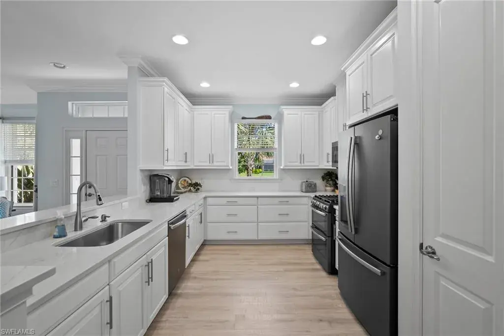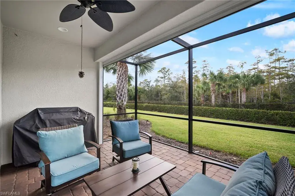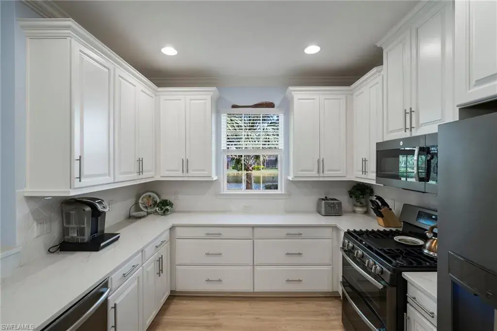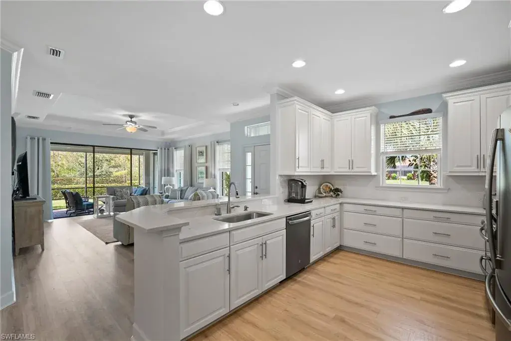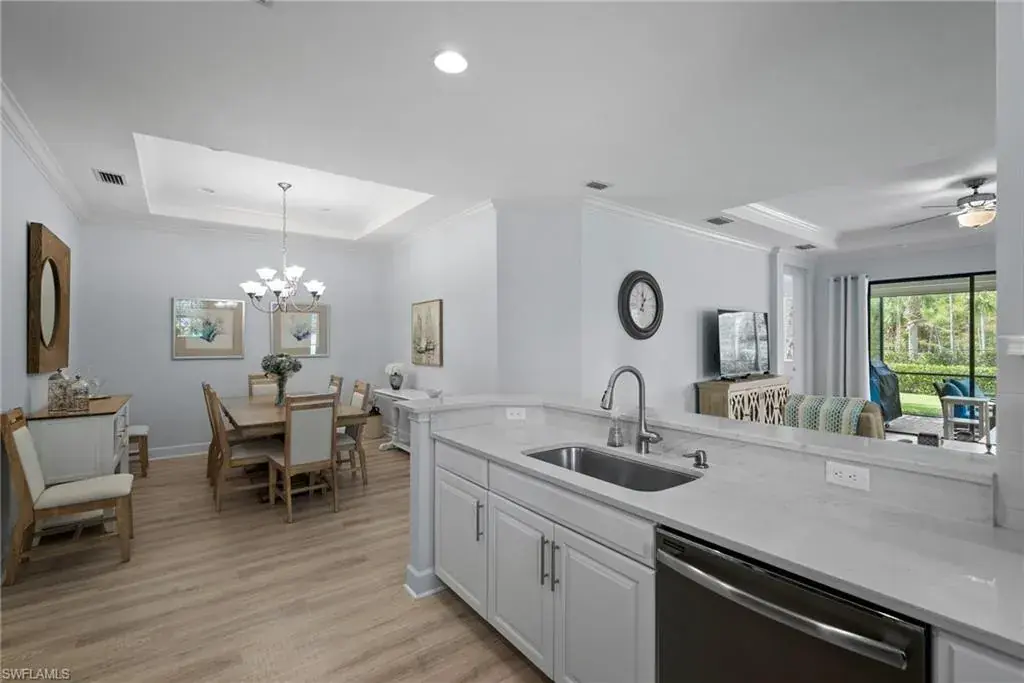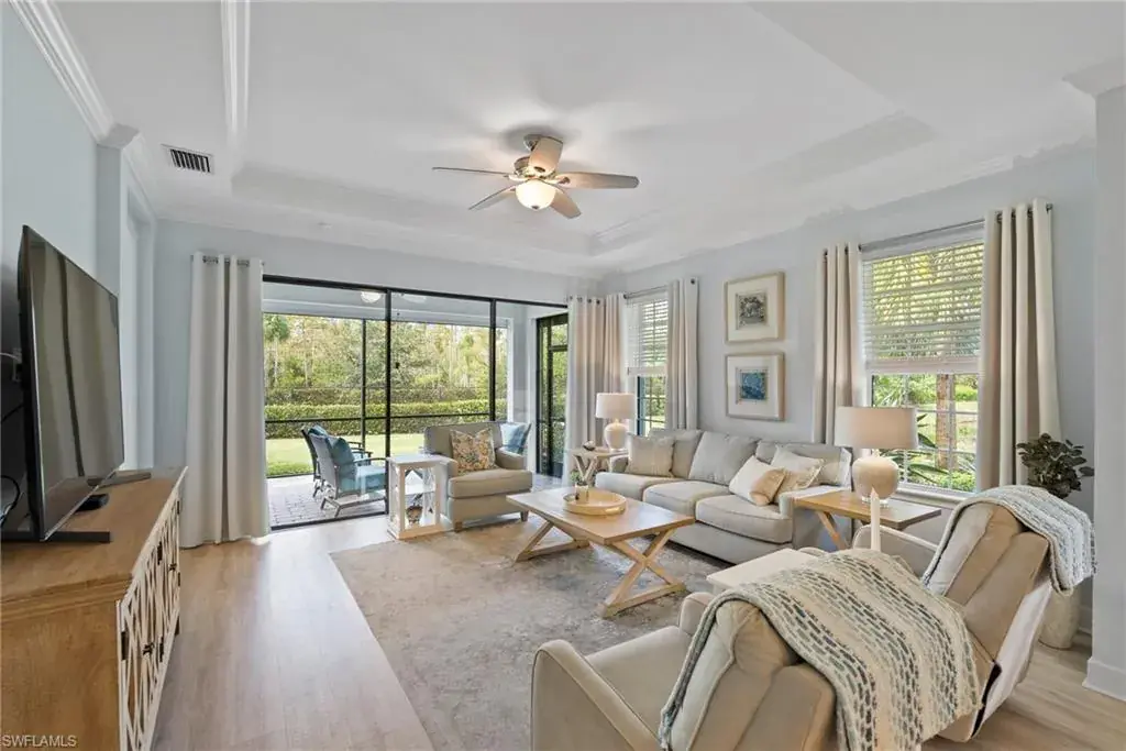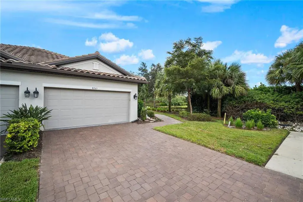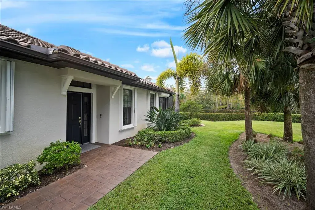 This 2/2 plus den twin villa located in a very desirable Naples location offers a well designed floor plan with optimal living space within its 1533 sq. ft. The seamless flow from the gathering room, dining room and kitchen creates a perfect open and airy living area with volume and tray ceilings enhanced by crown moulding and 8 ft doors. Enjoy nature and tranquility with water views offering a beautiful Florida landscape from your spacious paved and screened lanai. There’s a natural gas hookup for the gas grill for your ease and convenience. This home provides beautiful carefree luxury vinyl flooring throughout with neutral 18” tile in bath and laundry areas. The kitchen provides white wood cabinets which include upgrades of four deep drawers for ease and organization as well as a pantry for additional items and storage. White herringbone tile with white and gray quartz countertops, upgraded fingerprint-less appliances with a gas range and oven are a chef’s delight. The floor plan is designed to provide privacy between the master bedroom ensuite with walk-in closet from the den and second ensuite bedroom with ample closet space. The den with pocket doors can be utilized as a third sleeping area or multifunctional room. For your protection there are electric shutters on the lanai and manual shutters throughout with one impact glass window in guest bedroom. This amenity-rich beautifully landscaped community offers a manned community center with a caterer’s kitchen, space for social events or owner’s to host events, fitness room, card/billiards/ ping pong room, movement room, BBQ grill with eating area and tennis, pickle ball, bocce ball, fire-pit, children’s playground and two dog parks for small dogs and larger dogs. The resort-style pool, resistance pool and spa offer fun in the sun in your tropical environment. The entrance is secured with a Virtual Guard security gate and is conveniently located near I 75 and shopping, restaurants, local hospital, and medical facilities, churches and houses of worship, as well as a close proximity to Marco Island and Naples beaches. All of this and a very active community enriched with a full agenda of events provided for residents throughout the year. NO HURRICANE DAMAGE