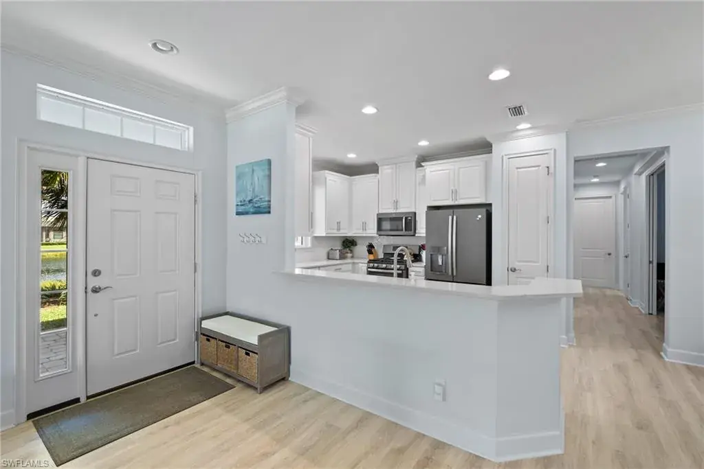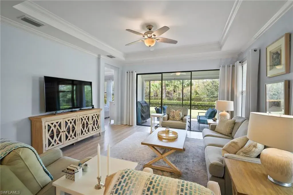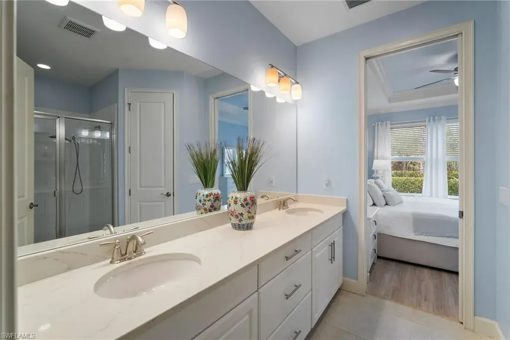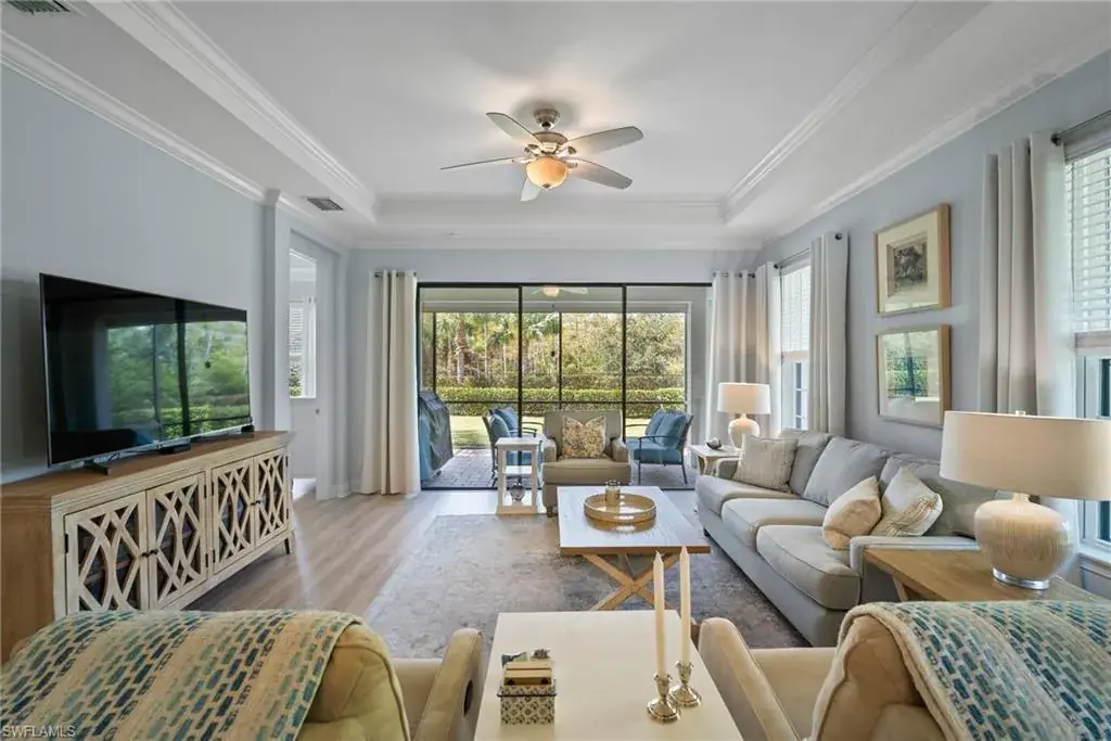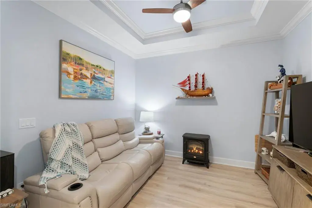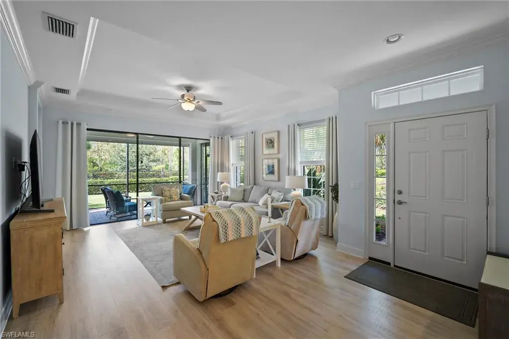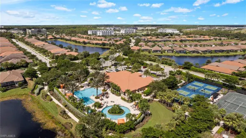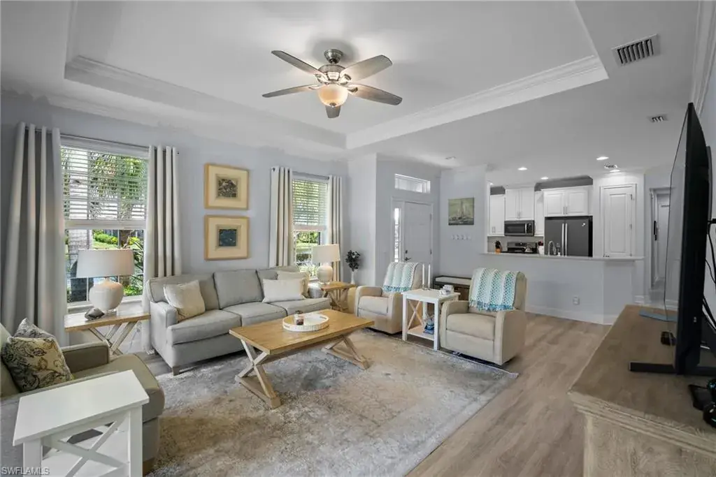 This 2/2 plus den twin villa located in a very desirable Naples location offers a well designed floor plan with optimal living space within its 1533 sq. ft. The seamless flow from the gathering room, dining room and kitchen creates a perfect open and airy living area with volume and tray ceilings enhanced by crown moulding and 8 ft doors. Enjoy nature and tranquility with water views offering a beautiful Florida landscape from your spacious paved and screened lanai. There’s a natural gas hookup for the gas grill for your ease and convenience. This home provides beautiful carefree luxury vinyl flooring throughout with neutral 18” tile in bath and laundry areas. The kitchen provides white wood cabinets which include upgrades of four deep drawers for ease and organization as well as a pantry for additional items and storage. White herringbone tile with white and gray quartz countertops, upgraded fingerprint-less appliances with a gas range and oven are a chef’s delight. The floor plan is designed to provide privacy between the master bedroom ensuite with walk-in closet from the den and second ensuite bedroom with ample closet space. The den with pocket doors can be utilized as a third sleeping area or multifunctional room. For your protection there are electric shutters on the lanai and manual shutters throughout with one impact glass window in guest bedroom. This amenity-rich beautifully landscaped community offers a manned community center with a caterer’s kitchen, space for social events or owner’s to host events, fitness room, card/billiards/ ping pong room, movement room, BBQ grill with eating area and tennis, pickle ball, bocce ball, fire-pit, children’s playground and two dog parks for small dogs and larger dogs. The resort-style pool, resistance pool and spa offer fun in the sun in your tropical environment. The entrance is secured with a Virtual Guard security gate and is conveniently located near I 75 and shopping, restaurants, local hospital, and medical facilities, churches and houses of worship, as well as a close proximity to Marco Island and Naples beaches. All of this and a very active community enriched with a full agenda of events provided for residents throughout the year. NO HURRICANE DAMAGE