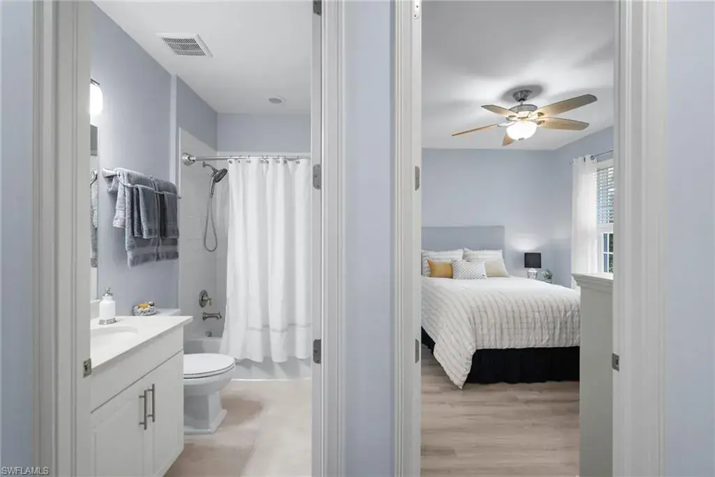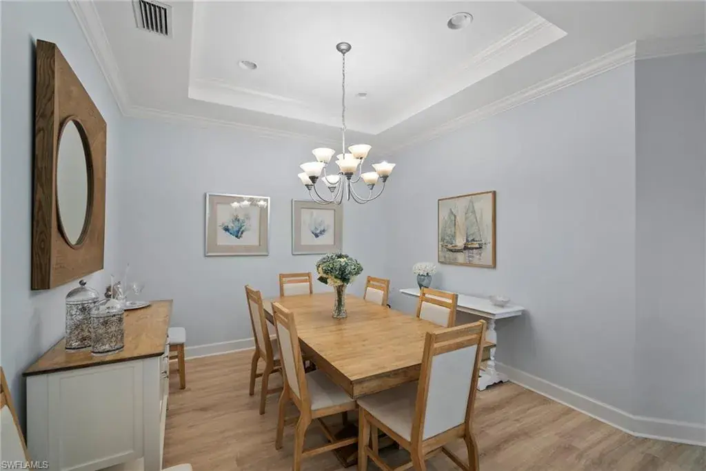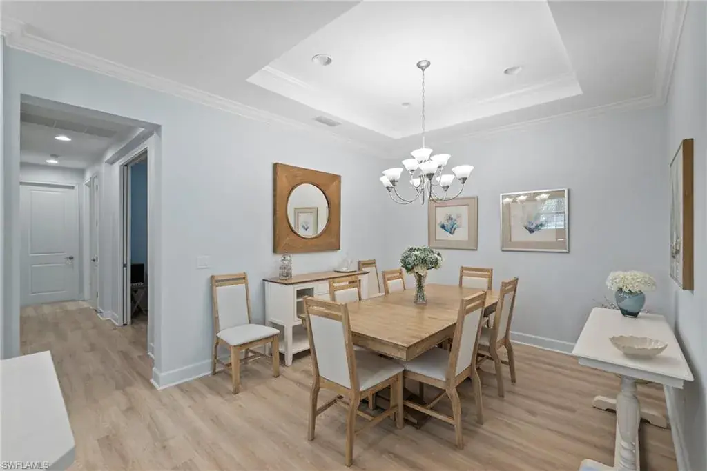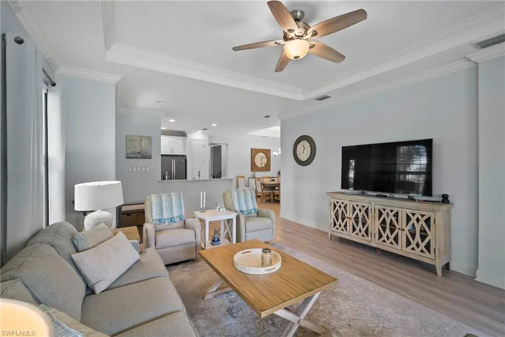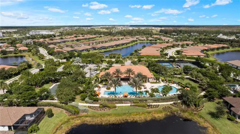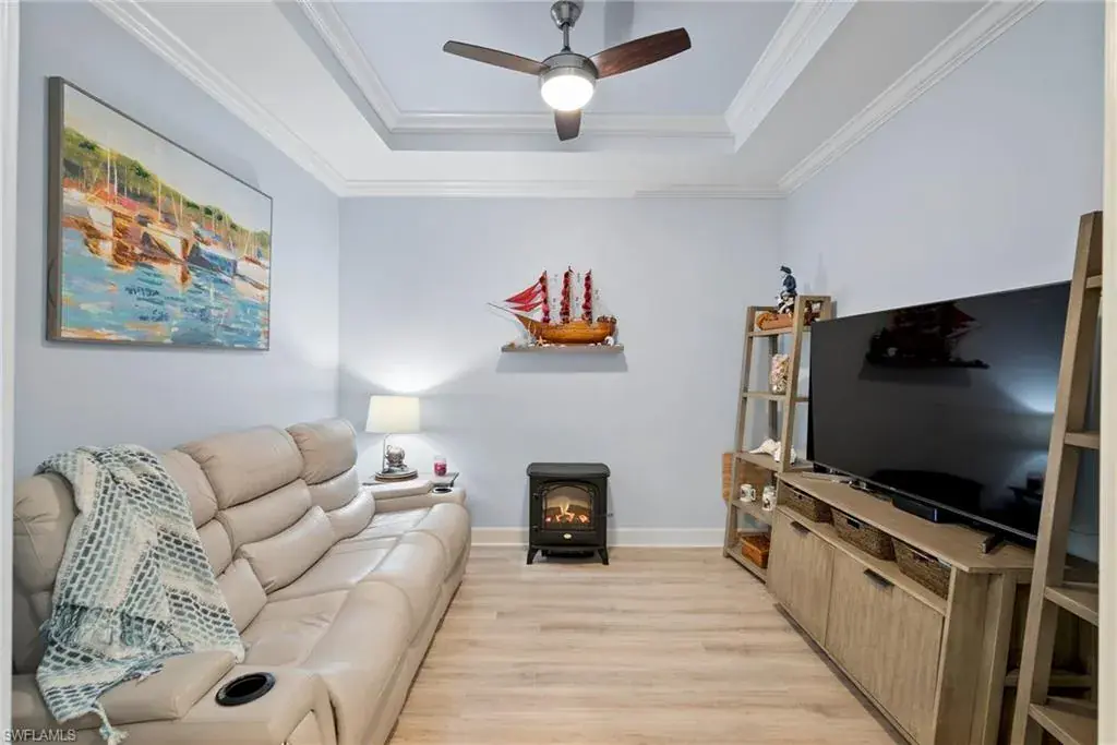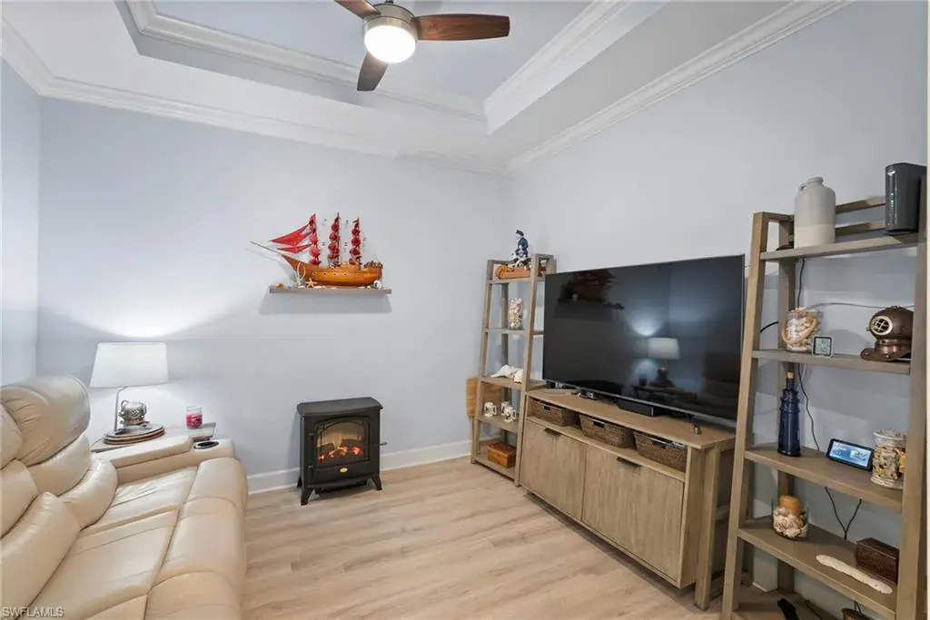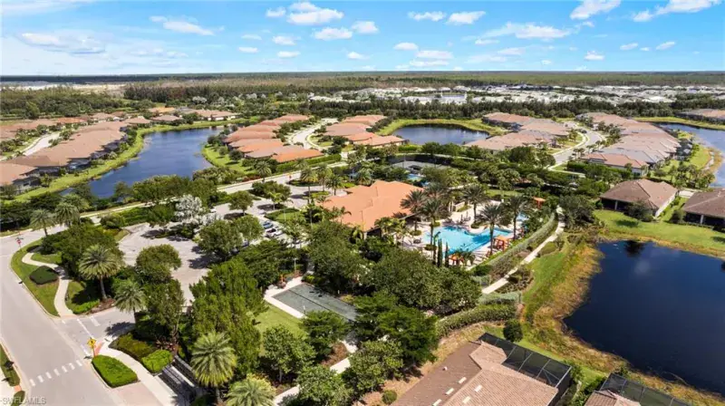 This 2/2 plus den twin villa located in a very desirable Naples location offers a well designed floor plan with optimal living space within its 1533 sq. ft. The seamless flow from the gathering room, dining room and kitchen creates a perfect open and airy living area with volume and tray ceilings enhanced by crown moulding and 8 ft doors. Enjoy nature and tranquility with water views offering a beautiful Florida landscape from your spacious paved and screened lanai. There’s a natural gas hookup for the gas grill for your ease and convenience. This home provides beautiful carefree luxury vinyl flooring throughout with neutral 18” tile in bath and laundry areas. The kitchen provides white wood cabinets which include upgrades of four deep drawers for ease and organization as well as a pantry for additional items and storage. White herringbone tile with white and gray quartz countertops, upgraded fingerprint-less appliances with a gas range and oven are a chef’s delight. The floor plan is designed to provide privacy between the master bedroom ensuite with walk-in closet from the den and second ensuite bedroom with ample closet space. The den with pocket doors can be utilized as a third sleeping area or multifunctional room. For your protection there are electric shutters on the lanai and manual shutters throughout with one impact glass window in guest bedroom. This amenity-rich beautifully landscaped community offers a manned community center with a caterer’s kitchen, space for social events or owner’s to host events, fitness room, card/billiards/ ping pong room, movement room, BBQ grill with eating area and tennis, pickle ball, bocce ball, fire-pit, children’s playground and two dog parks for small dogs and larger dogs. The resort-style pool, resistance pool and spa offer fun in the sun in your tropical environment. The entrance is secured with a Virtual Guard security gate and is conveniently located near I 75 and shopping, restaurants, local hospital, and medical facilities, churches and houses of worship, as well as a close proximity to Marco Island and Naples beaches. All of this and a very active community enriched with a full agenda of events provided for residents throughout the year. NO HURRICANE DAMAGE