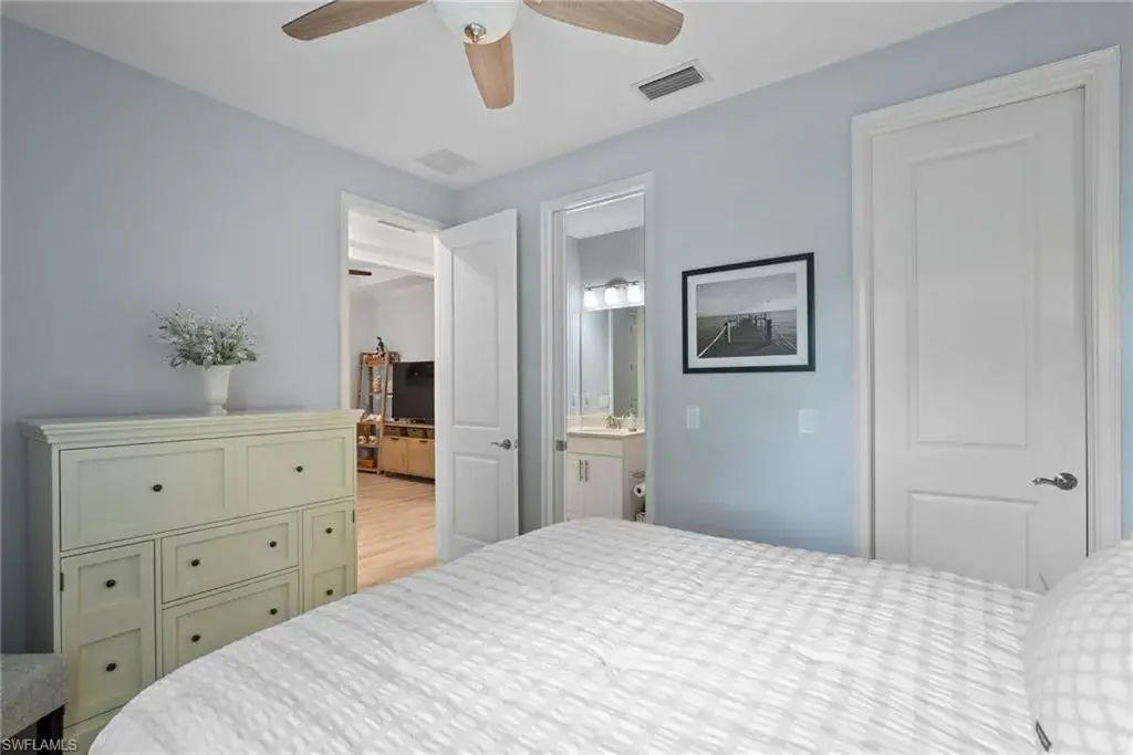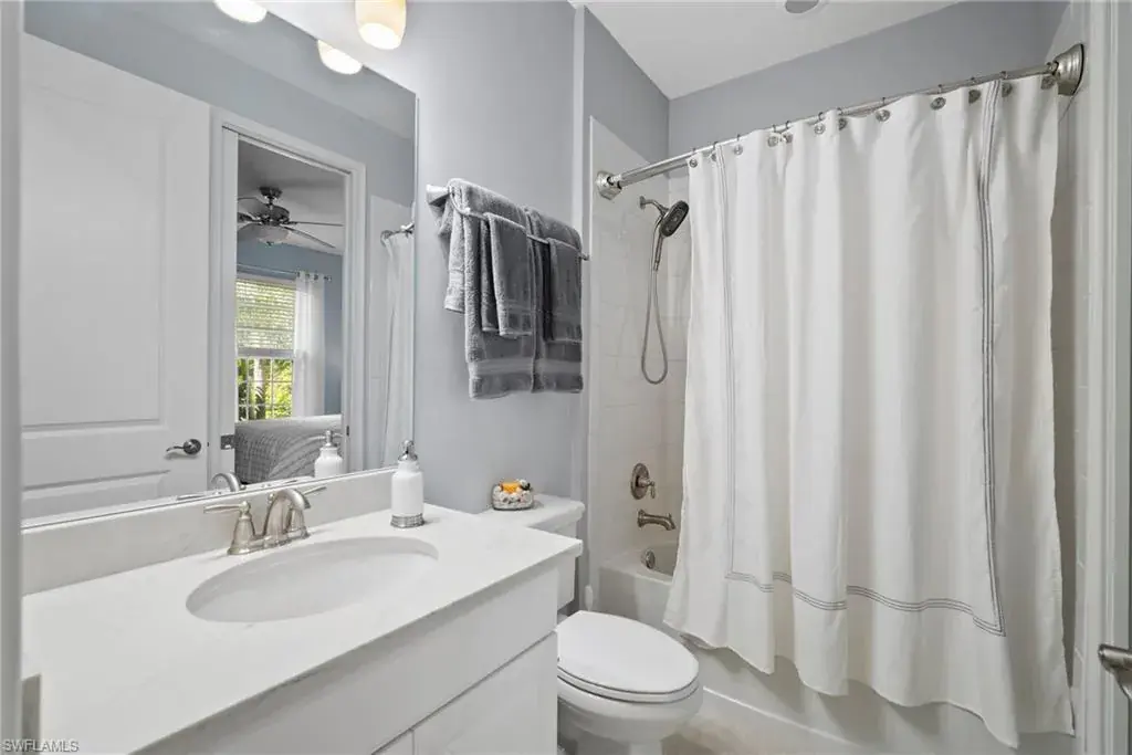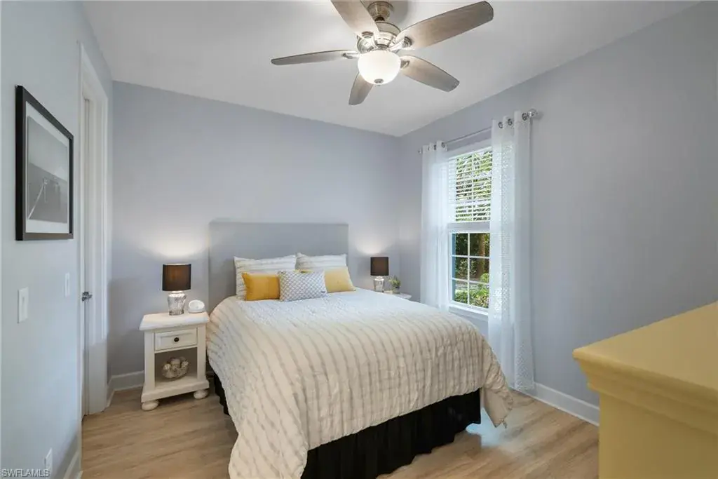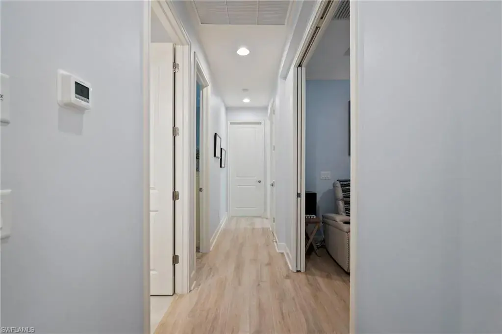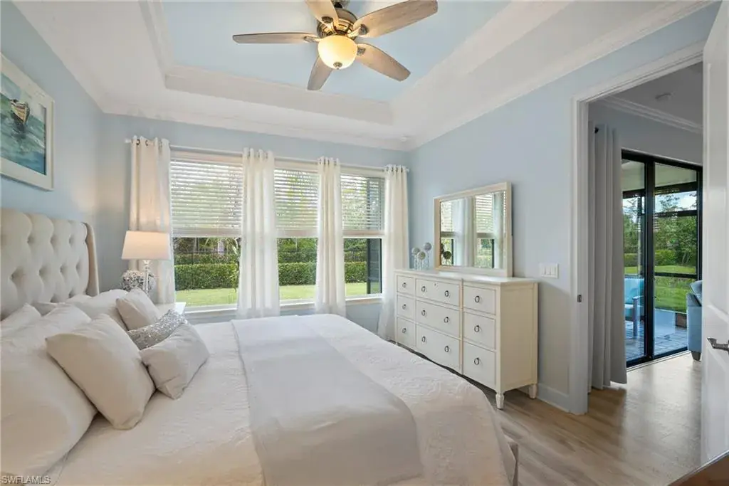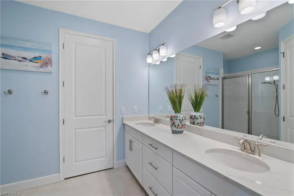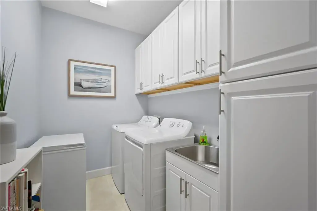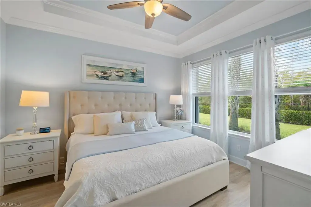 This 2/2 plus den twin villa located in a very desirable Naples location offers a well designed floor plan with optimal living space within its 1533 sq. ft. The seamless flow from the gathering room, dining room and kitchen creates a perfect open and airy living area with volume and tray ceilings enhanced by crown moulding and 8 ft doors. Enjoy nature and tranquility with water views offering a beautiful Florida landscape from your spacious paved and screened lanai. There’s a natural gas hookup for the gas grill for your ease and convenience. This home provides beautiful carefree luxury vinyl flooring throughout with neutral 18” tile in bath and laundry areas. The kitchen provides white wood cabinets which include upgrades of four deep drawers for ease and organization as well as a pantry for additional items and storage. White herringbone tile with white and gray quartz countertops, upgraded fingerprint-less appliances with a gas range and oven are a chef’s delight. The floor plan is designed to provide privacy between the master bedroom ensuite with walk-in closet from the den and second ensuite bedroom with ample closet space. The den with pocket doors can be utilized as a third sleeping area or multifunctional room. For your protection there are electric shutters on the lanai and manual shutters throughout with one impact glass window in guest bedroom. This amenity-rich beautifully landscaped community offers a manned community center with a caterer’s kitchen, space for social events or owner’s to host events, fitness room, card/billiards/ ping pong room, movement room, BBQ grill with eating area and tennis, pickle ball, bocce ball, fire-pit, children’s playground and two dog parks for small dogs and larger dogs. The resort-style pool, resistance pool and spa offer fun in the sun in your tropical environment. The entrance is secured with a Virtual Guard security gate and is conveniently located near I 75 and shopping, restaurants, local hospital, and medical facilities, churches and houses of worship, as well as a close proximity to Marco Island and Naples beaches. All of this and a very active community enriched with a full agenda of events provided for residents throughout the year. NO HURRICANE DAMAGE